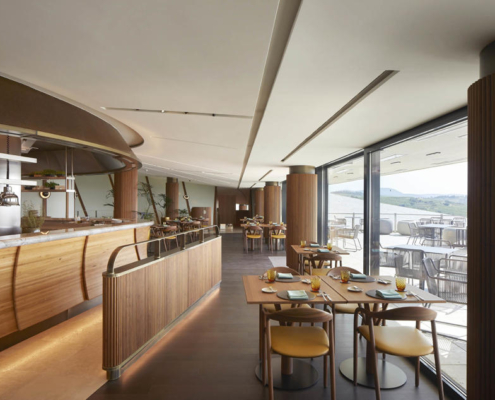 Giriş, eğimli araziye entegre edilerek kütlenin heykelsi etkisinin kesintisiz biçimde algılanması sağlanmış. Otoparktan başlayan geniş yürüyüş yolu, bölgenin değerli bağlarına panoramik bakışlar sunuyor. Ziyaretçiler önce içten bir geçiş mekanına, ardından lobiye giriyor. Buradan, gün ışığı alan bir koridorla ana ziyaretçi alanlarına ve panoramik terasa ulaşılıyor. Restoran ve barın yüksek, kavisli tavanları manzaraya yönelerek görüş hattını dışarı taşıyor. Terasa çıkıldığında ise bağların ve manzaranın genişliği güçlü bir duyusal etki yaratıyor.
