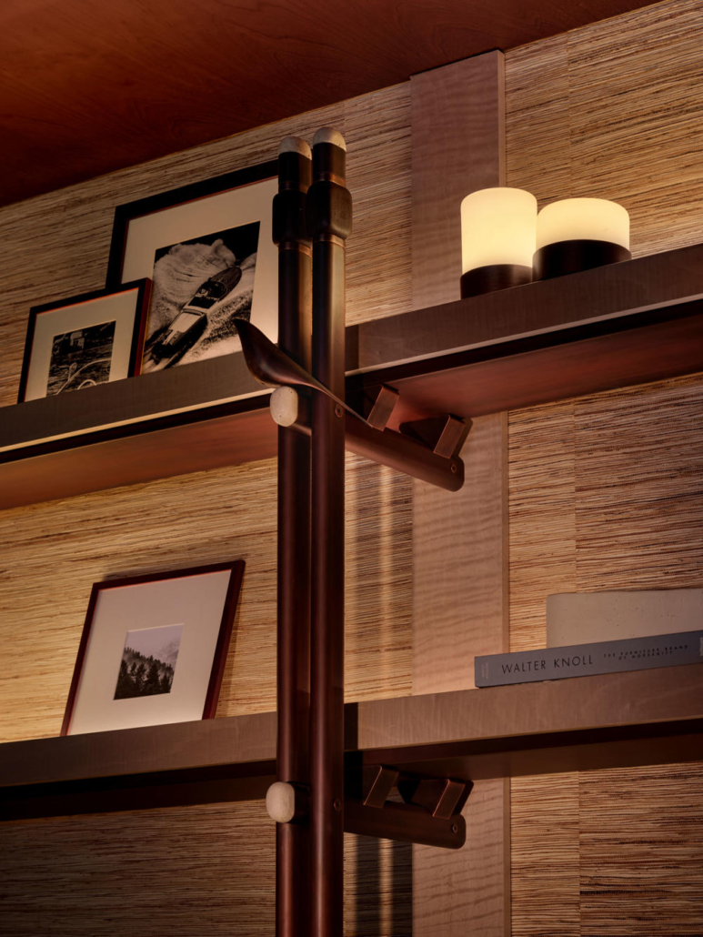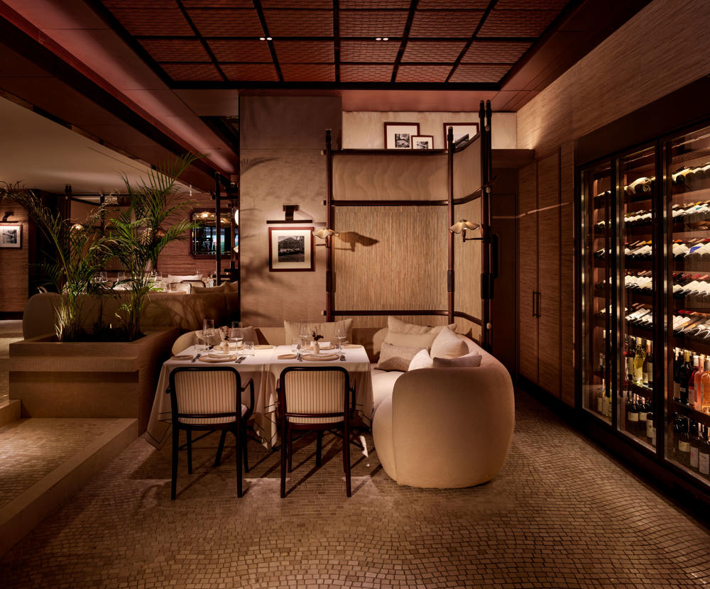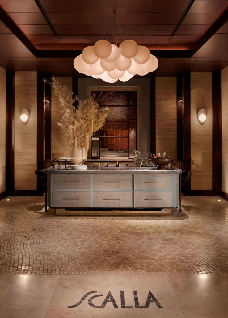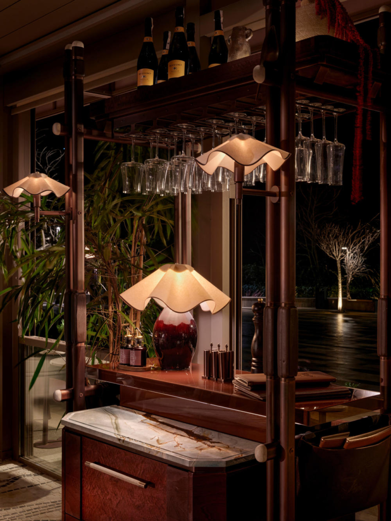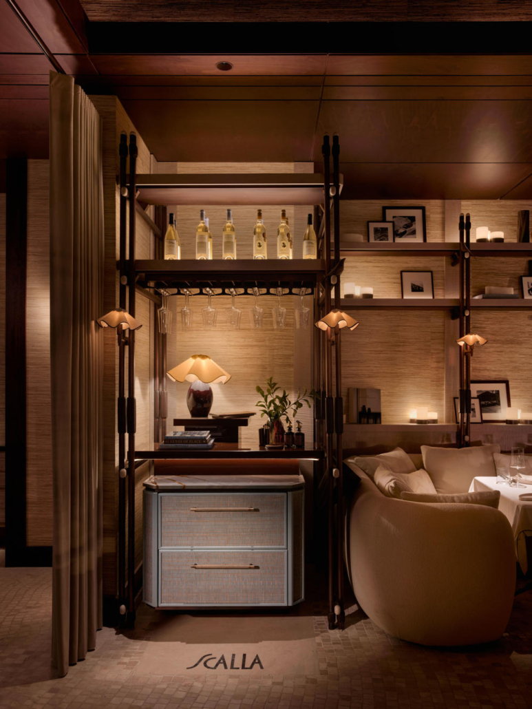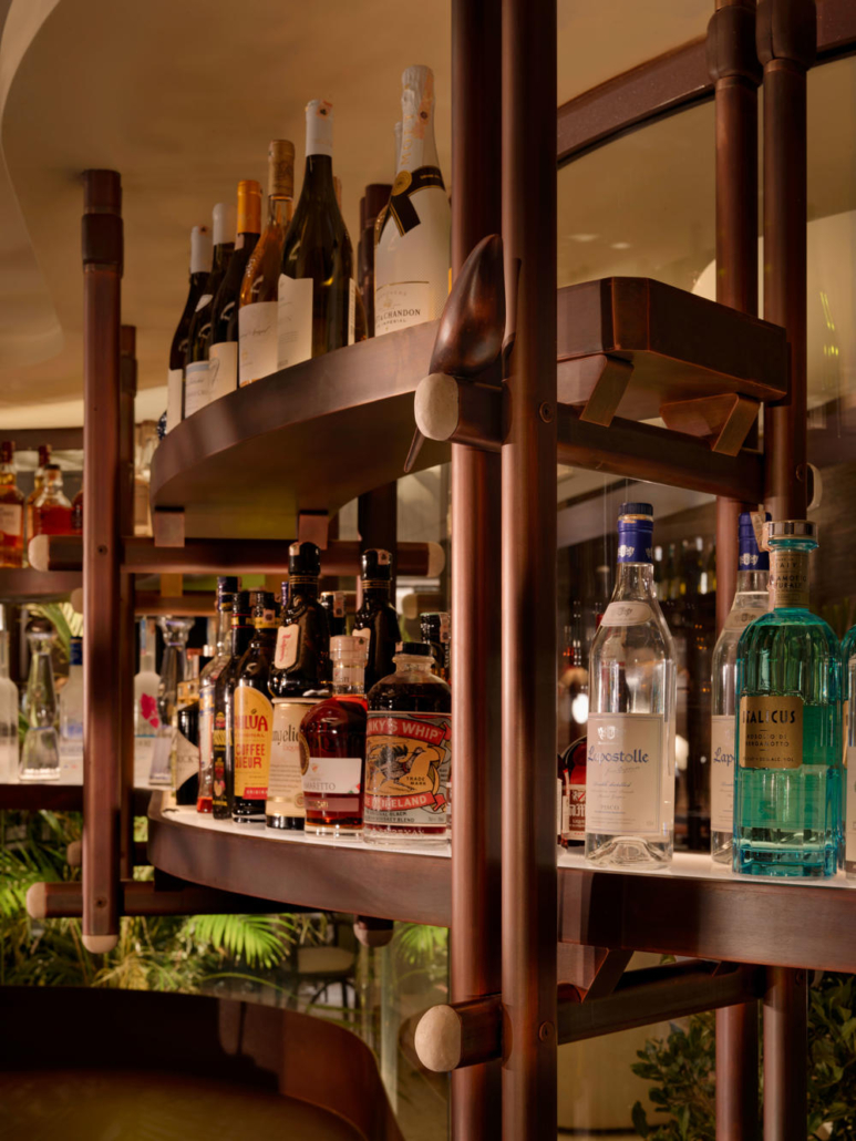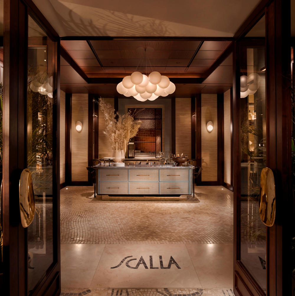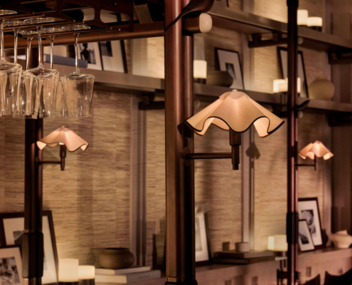 Dış mekanda, pergola ile örtülü alanın üzerinde yer alan eğrisel üst yapılar, aydınlatma ve akustik konfor çözümlerini barındırıyor. Kanepelerin arkasına konumlandırılan eğrisel ayırıcılar mekanı tanımlarken derinlik sağlıyor. Çeşitli malzemelerle bütünleştirilen bu yapısal dil, iç mekanda da devam ettiriliyor. Sistem, bakır kaplamalı özel alüminyum destekler kullanılarak inşa edilirken ahşap, deri ve açık tonlu mermer detaylarla tamamlanmış. Entegre duvar aplikleri, masa ve zemin lambalarının yapısal formlarına ilham vererek mekansal bütünlüğü güçlendirirken URBANJOBS’ın “cam perde” olarak tanımladığı cephe, zemin desenleri ve mobilya detaylarında tekrarlanan unsurlar, kesintisiz bir görsel ve işlevsel ritim yaratıyor. Scalla’nın metal çerçeve sistemi, servis istasyonlarından arka barlara, entegre raf ünitelerinden cephe teşhir sistemlerine kadar farklı işlevsel alanlarda kullanılarak mekansal kimliği tutarlı bir şekilde güçlendirmiş.