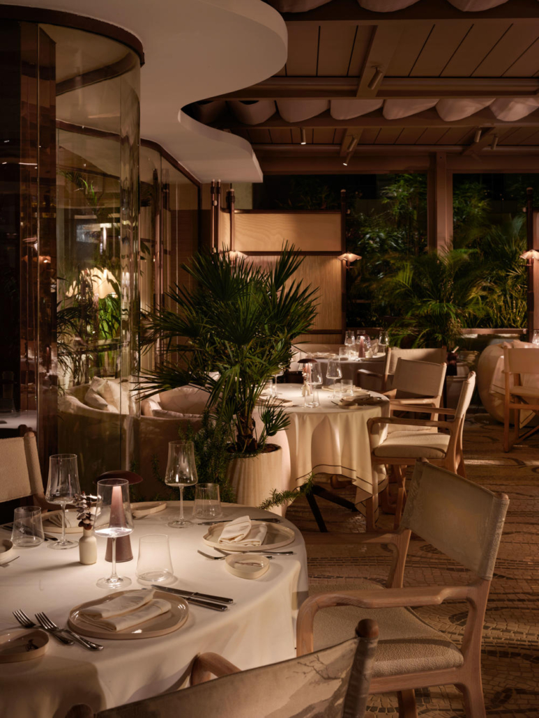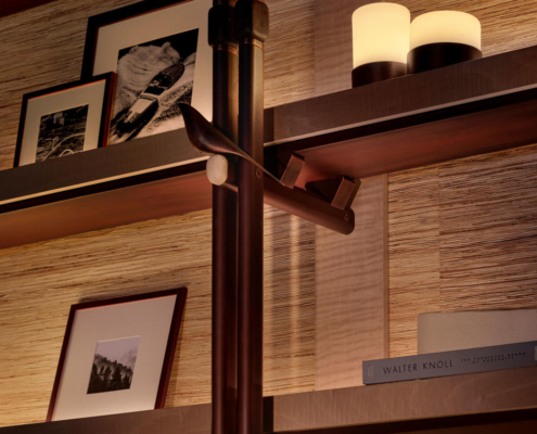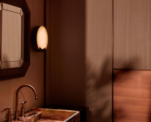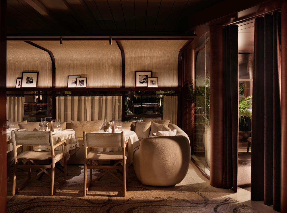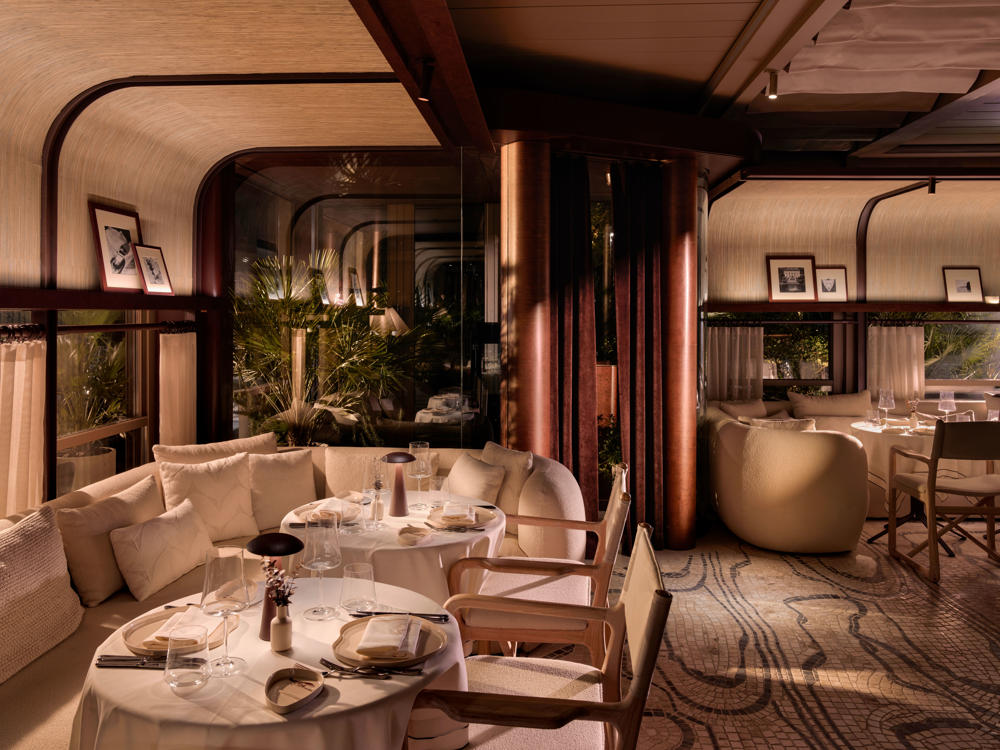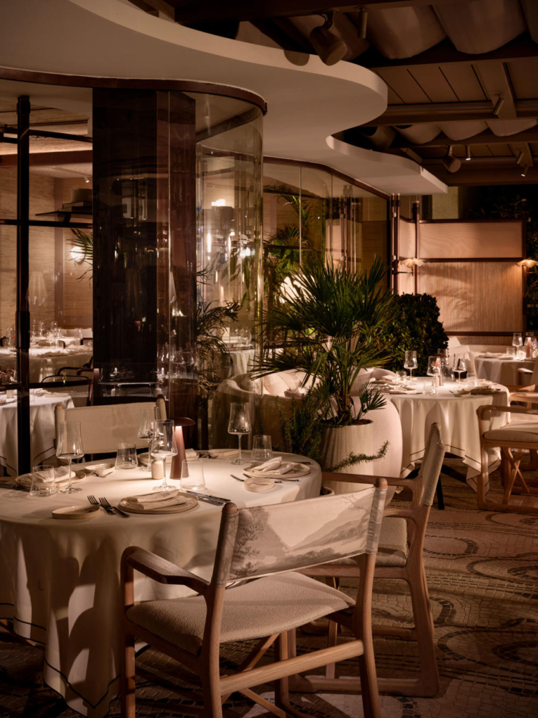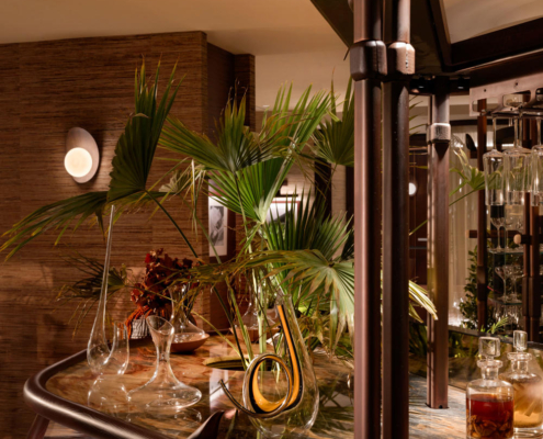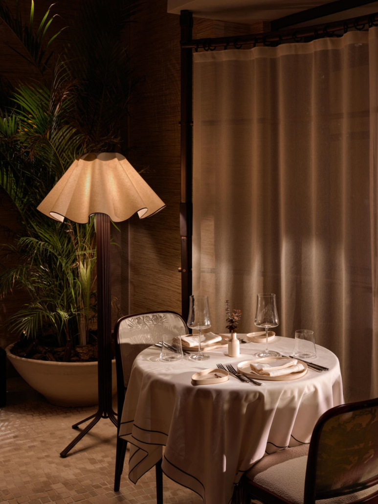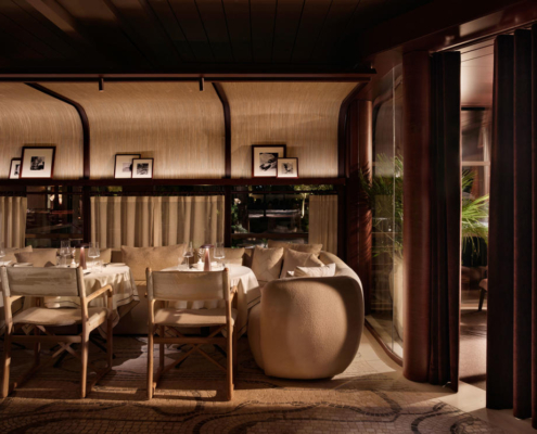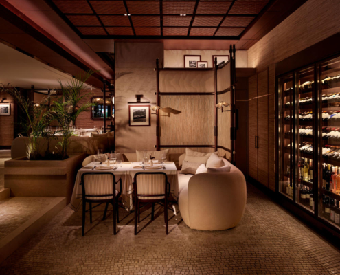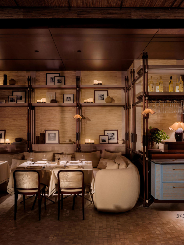 Dış mekanda, pergola ile örtülü alanın üzerinde yer alan eğrisel üst yapılar, aydınlatma ve akustik konfor çözümlerini barındırıyor. Kanepelerin arkasına konumlandırılan eğrisel ayırıcılar mekanı tanımlarken derinlik sağlıyor. Çeşitli malzemelerle bütünleştirilen bu yapısal dil, iç mekanda da devam ettiriliyor. Sistem, bakır kaplamalı özel alüminyum destekler kullanılarak inşa edilirken ahşap, deri ve açık tonlu mermer detaylarla tamamlanmış. Entegre duvar aplikleri, masa ve zemin lambalarının yapısal formlarına ilham vererek mekansal bütünlüğü güçlendirirken URBANJOBS’ın “cam perde” olarak tanımladığı cephe, zemin desenleri ve mobilya detaylarında tekrarlanan unsurlar, kesintisiz bir görsel ve işlevsel ritim yaratıyor. Scalla’nın metal çerçeve sistemi, servis istasyonlarından arka barlara, entegre raf ünitelerinden cephe teşhir sistemlerine kadar farklı işlevsel alanlarda kullanılarak mekansal kimliği tutarlı bir şekilde güçlendirmiş.