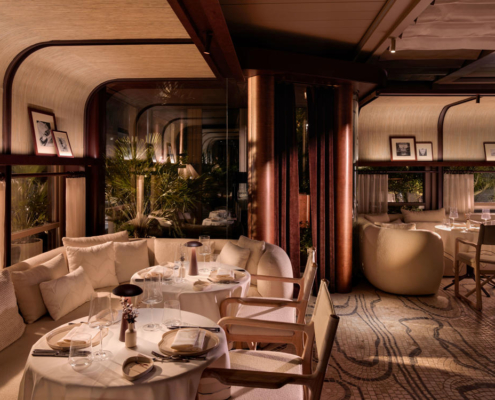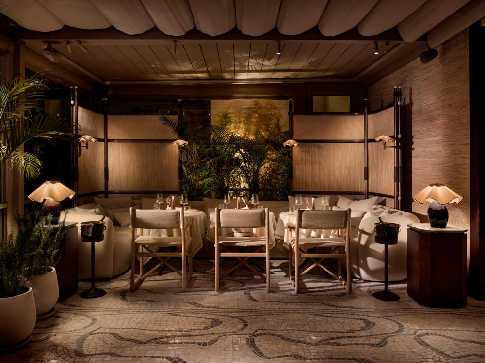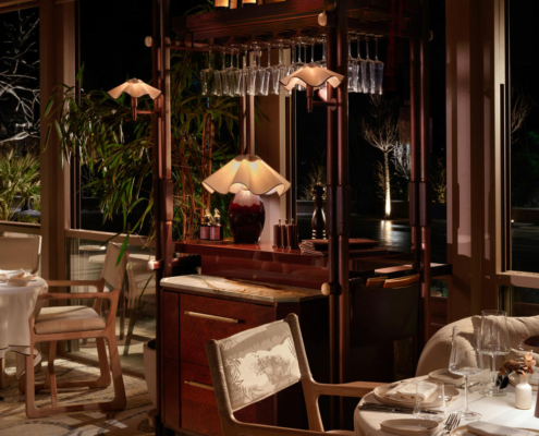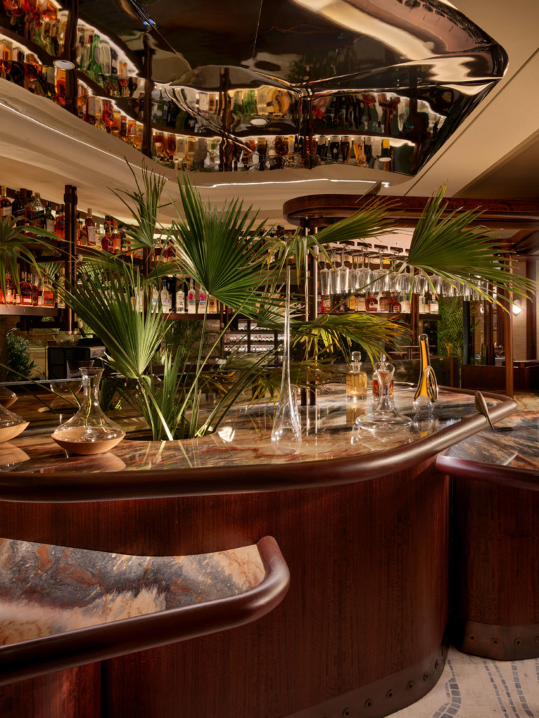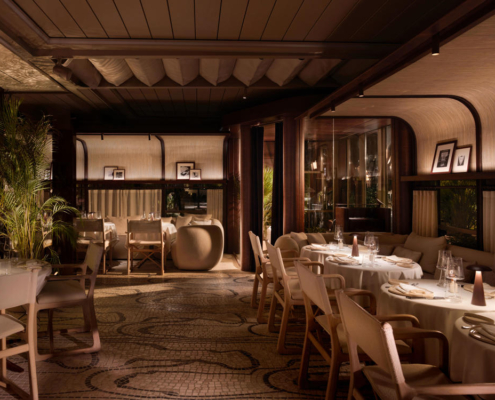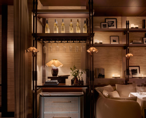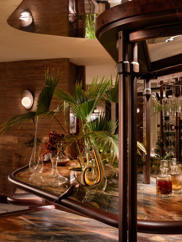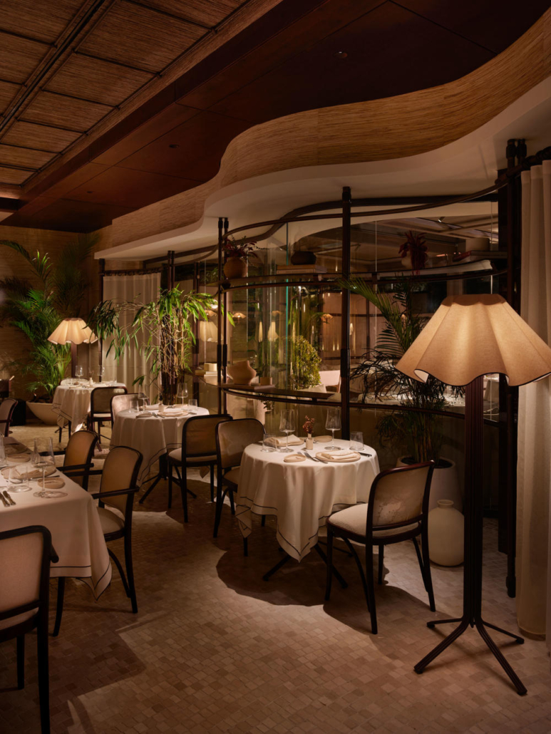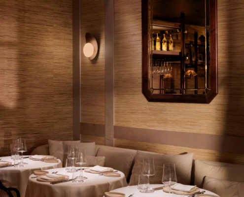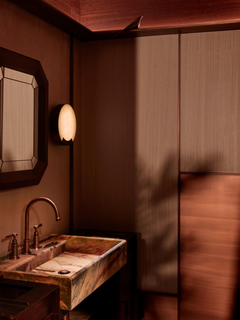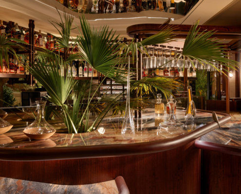 Dış mekanda, pergola ile örtülü alanın üzerinde yer alan eğrisel üst yapılar, aydınlatma ve akustik konfor çözümlerini barındırıyor. Kanepelerin arkasına konumlandırılan eğrisel ayırıcılar mekanı tanımlarken derinlik sağlıyor. Çeşitli malzemelerle bütünleştirilen bu yapısal dil, iç mekanda da devam ettiriliyor. Sistem, bakır kaplamalı özel alüminyum destekler kullanılarak inşa edilirken ahşap, deri ve açık tonlu mermer detaylarla tamamlanmış. Entegre duvar aplikleri, masa ve zemin lambalarının yapısal formlarına ilham vererek mekansal bütünlüğü güçlendirirken URBANJOBS’ın “cam perde” olarak tanımladığı cephe, zemin desenleri ve mobilya detaylarında tekrarlanan unsurlar, kesintisiz bir görsel ve işlevsel ritim yaratıyor. Scalla’nın metal çerçeve sistemi, servis istasyonlarından arka barlara, entegre raf ünitelerinden cephe teşhir sistemlerine kadar farklı işlevsel alanlarda kullanılarak mekansal kimliği tutarlı bir şekilde güçlendirmiş.