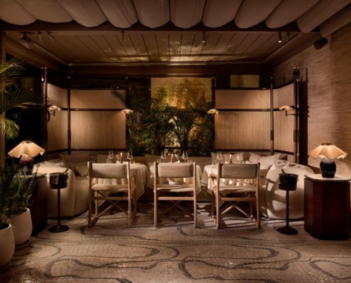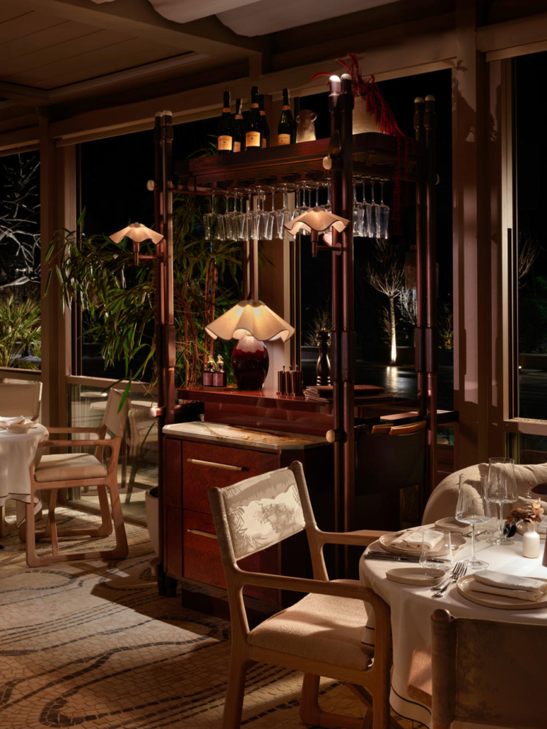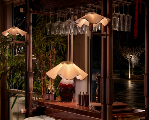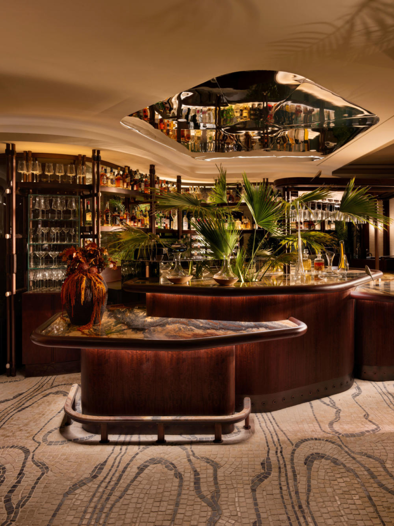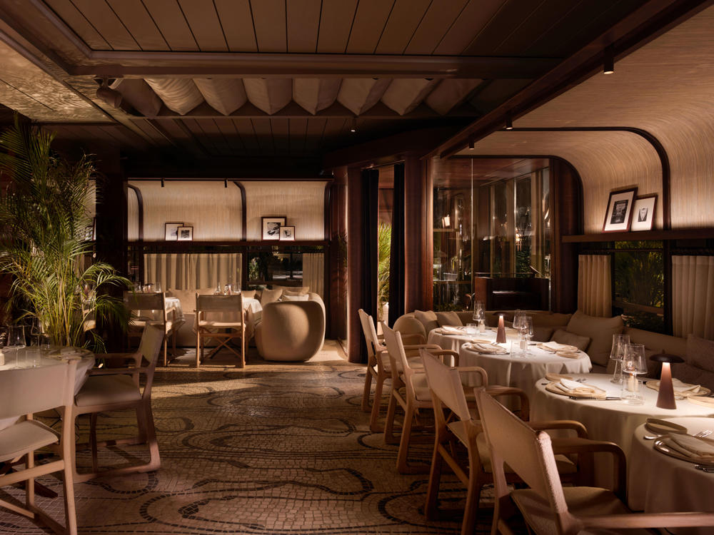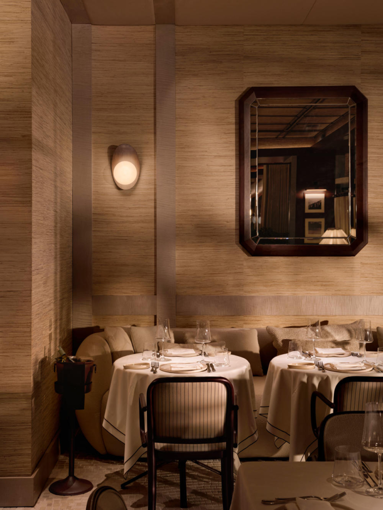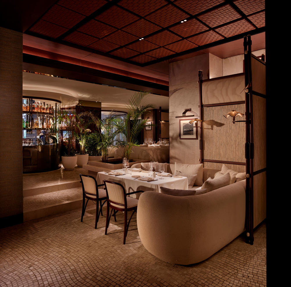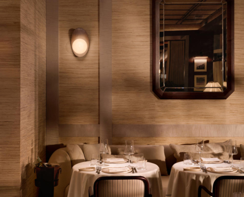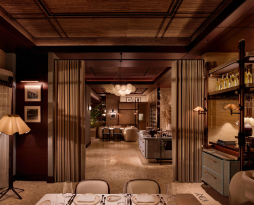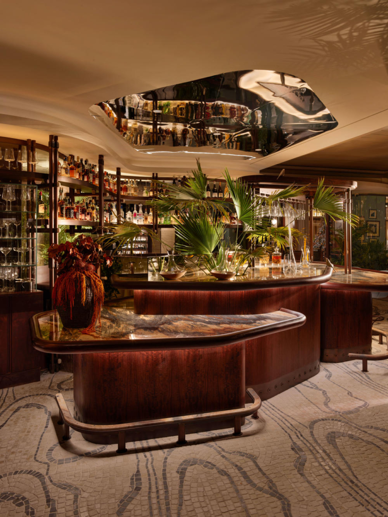 Dış mekanda, pergola ile örtülü alanın üzerinde yer alan eğrisel üst yapılar, aydınlatma ve akustik konfor çözümlerini barındırıyor. Kanepelerin arkasına konumlandırılan eğrisel ayırıcılar mekanı tanımlarken derinlik sağlıyor. Çeşitli malzemelerle bütünleştirilen bu yapısal dil, iç mekanda da devam ettiriliyor. Sistem, bakır kaplamalı özel alüminyum destekler kullanılarak inşa edilirken ahşap, deri ve açık tonlu mermer detaylarla tamamlanmış. Entegre duvar aplikleri, masa ve zemin lambalarının yapısal formlarına ilham vererek mekansal bütünlüğü güçlendirirken URBANJOBS’ın “cam perde” olarak tanımladığı cephe, zemin desenleri ve mobilya detaylarında tekrarlanan unsurlar, kesintisiz bir görsel ve işlevsel ritim yaratıyor. Scalla’nın metal çerçeve sistemi, servis istasyonlarından arka barlara, entegre raf ünitelerinden cephe teşhir sistemlerine kadar farklı işlevsel alanlarda kullanılarak mekansal kimliği tutarlı bir şekilde güçlendirmiş.