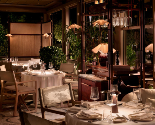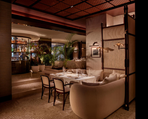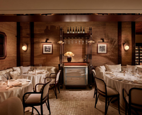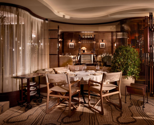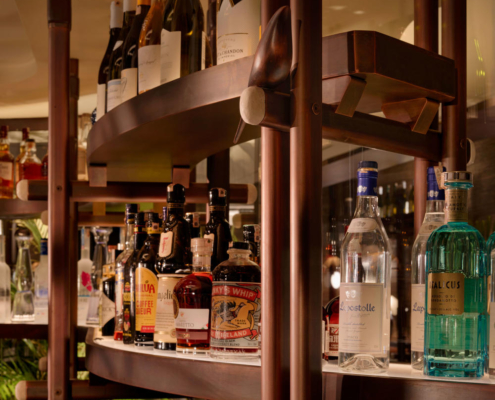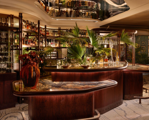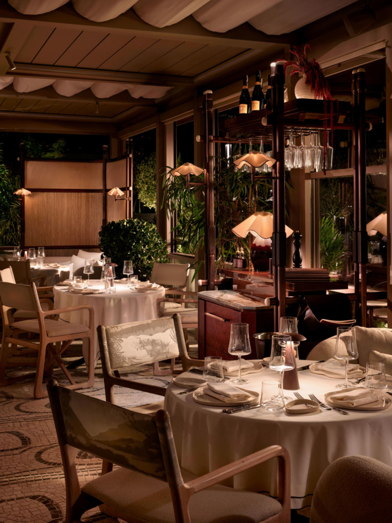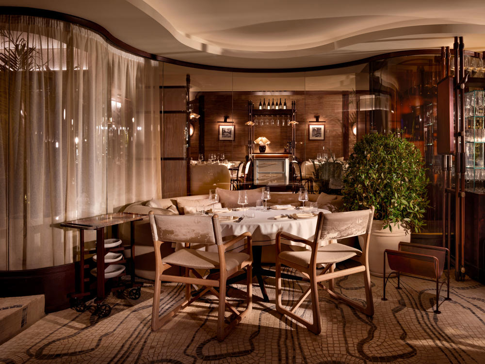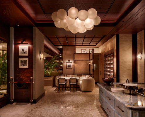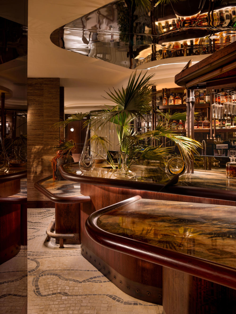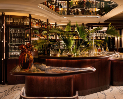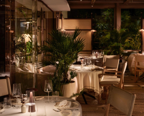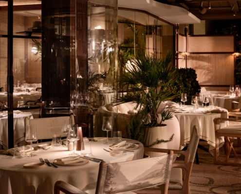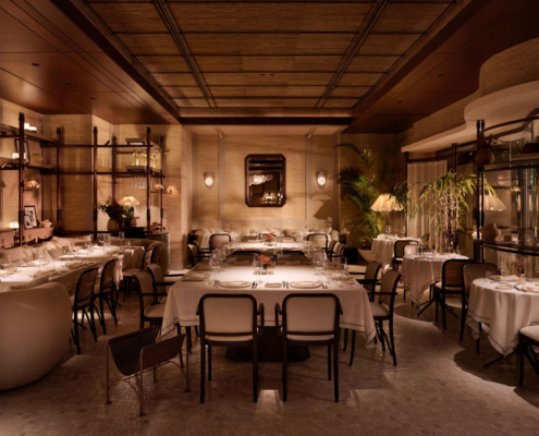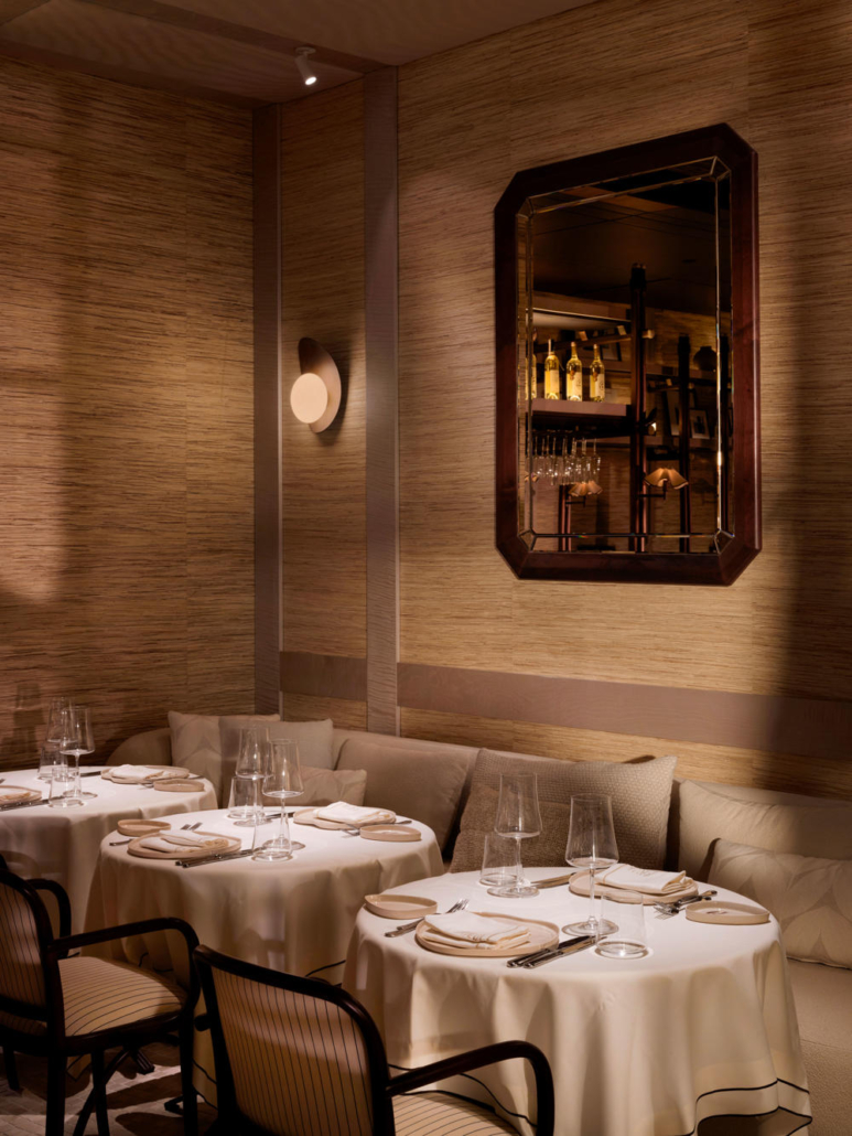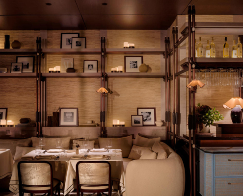 Dış mekanda, pergola ile örtülü alanın üzerinde yer alan eğrisel üst yapılar, aydınlatma ve akustik konfor çözümlerini barındırıyor. Kanepelerin arkasına konumlandırılan eğrisel ayırıcılar mekanı tanımlarken derinlik sağlıyor. Çeşitli malzemelerle bütünleştirilen bu yapısal dil, iç mekanda da devam ettiriliyor. Sistem, bakır kaplamalı özel alüminyum destekler kullanılarak inşa edilirken ahşap, deri ve açık tonlu mermer detaylarla tamamlanmış. Entegre duvar aplikleri, masa ve zemin lambalarının yapısal formlarına ilham vererek mekansal bütünlüğü güçlendirirken URBANJOBS’ın “cam perde” olarak tanımladığı cephe, zemin desenleri ve mobilya detaylarında tekrarlanan unsurlar, kesintisiz bir görsel ve işlevsel ritim yaratıyor. Scalla’nın metal çerçeve sistemi, servis istasyonlarından arka barlara, entegre raf ünitelerinden cephe teşhir sistemlerine kadar farklı işlevsel alanlarda kullanılarak mekansal kimliği tutarlı bir şekilde güçlendirmiş.