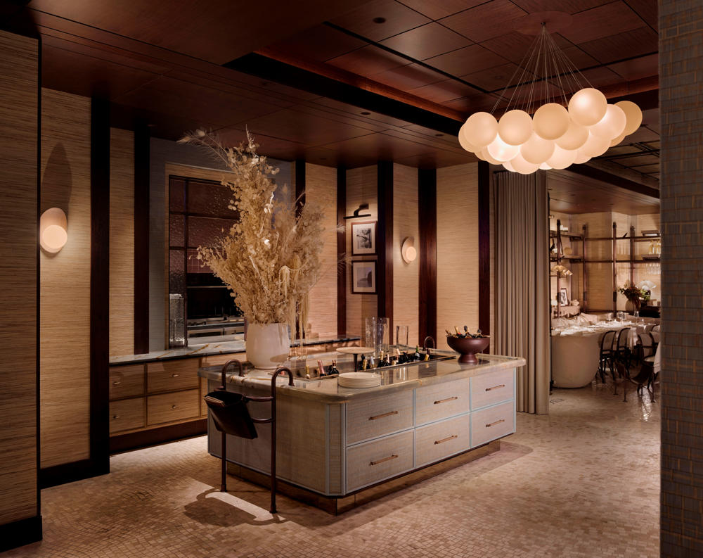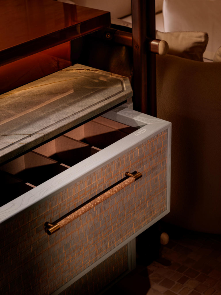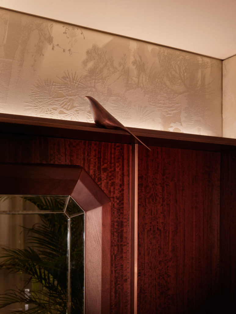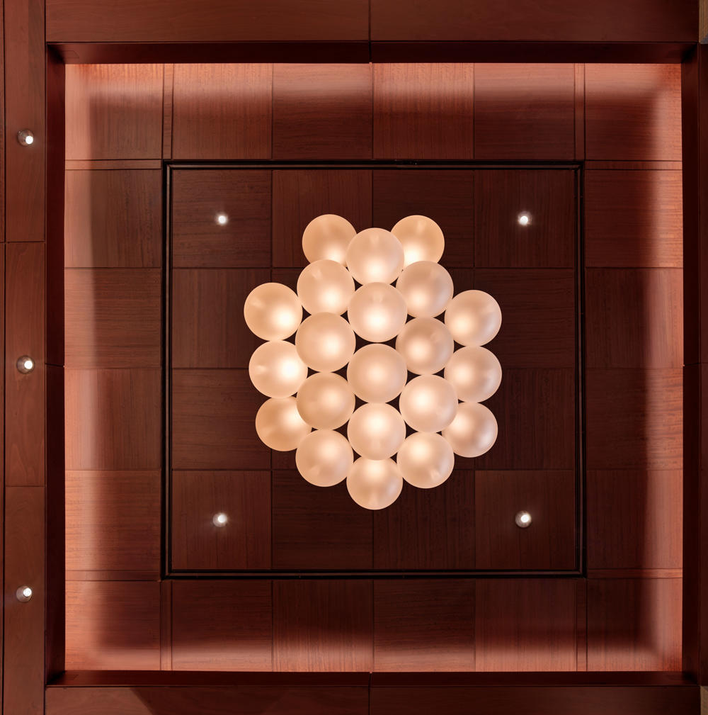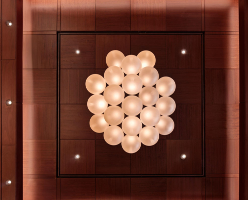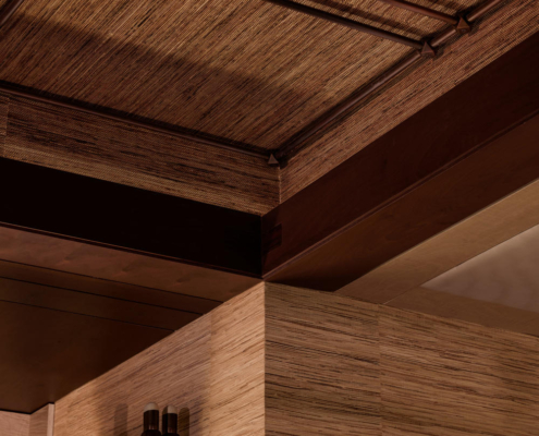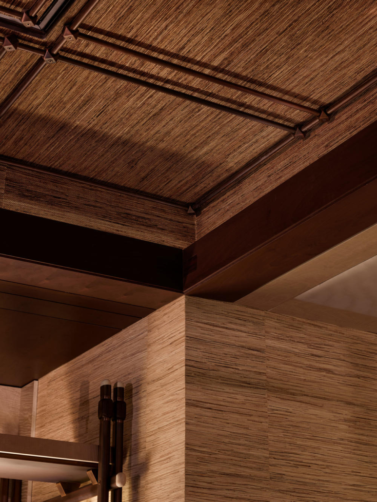 Tavan, farklı ihtiyaçlara yanıt verecek şekilde mekanı bütünleştiren bir mimari yüzey olarak tasarlanmış. Bazı alanlarda yükseltilmiş, bazı bölümlerde ise strüktürel kirişlerle geçişler tanımlanmış. Belirli bölümler örme deri ekler ile vurgulanırken daha düşük tavan yüksekliklerine sahip alanlarda, ev hissi veren samimi bir atmosfer oluşturulmuş.