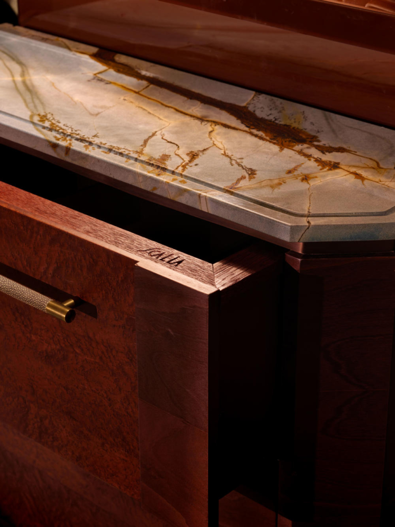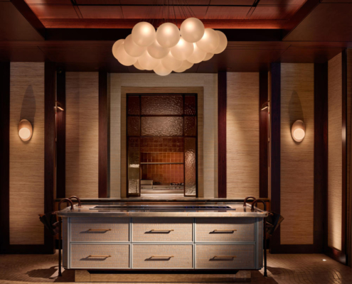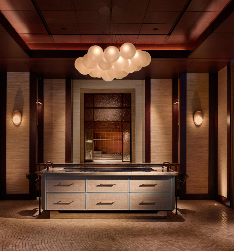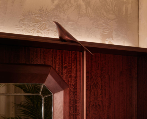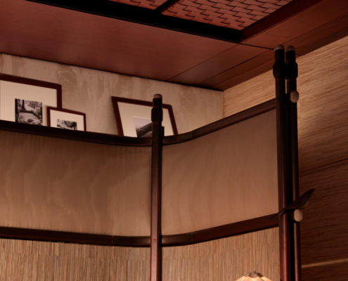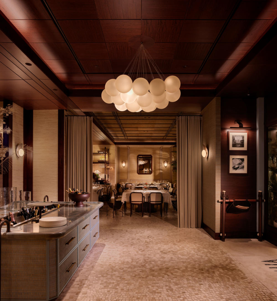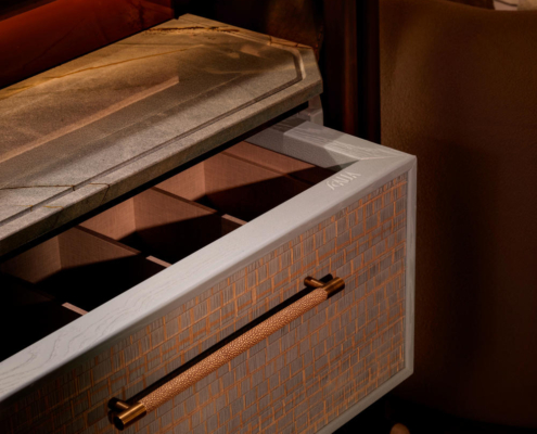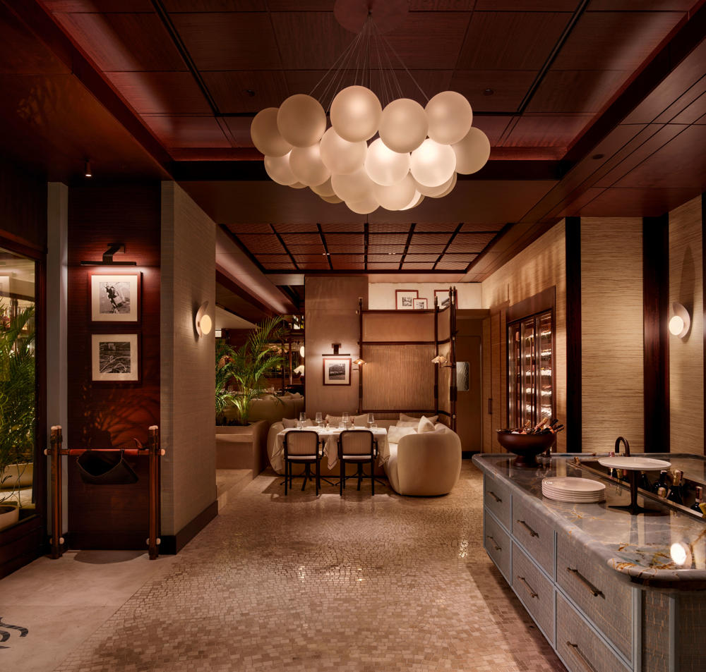 Tavan, farklı ihtiyaçlara yanıt verecek şekilde mekanı bütünleştiren bir mimari yüzey olarak tasarlanmış. Bazı alanlarda yükseltilmiş, bazı bölümlerde ise strüktürel kirişlerle geçişler tanımlanmış. Belirli bölümler örme deri ekler ile vurgulanırken daha düşük tavan yüksekliklerine sahip alanlarda, ev hissi veren samimi bir atmosfer oluşturulmuş.