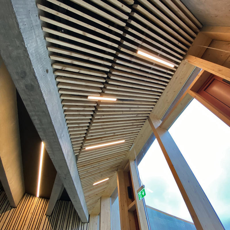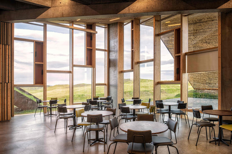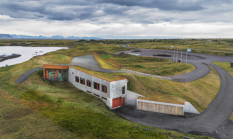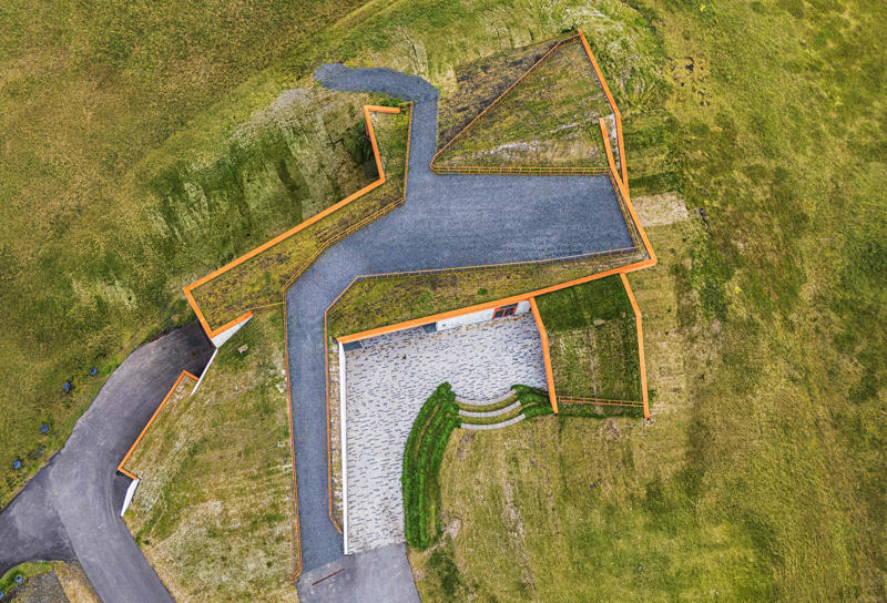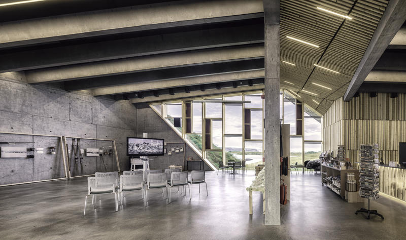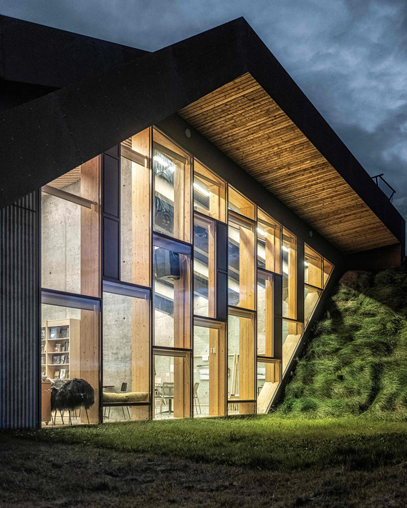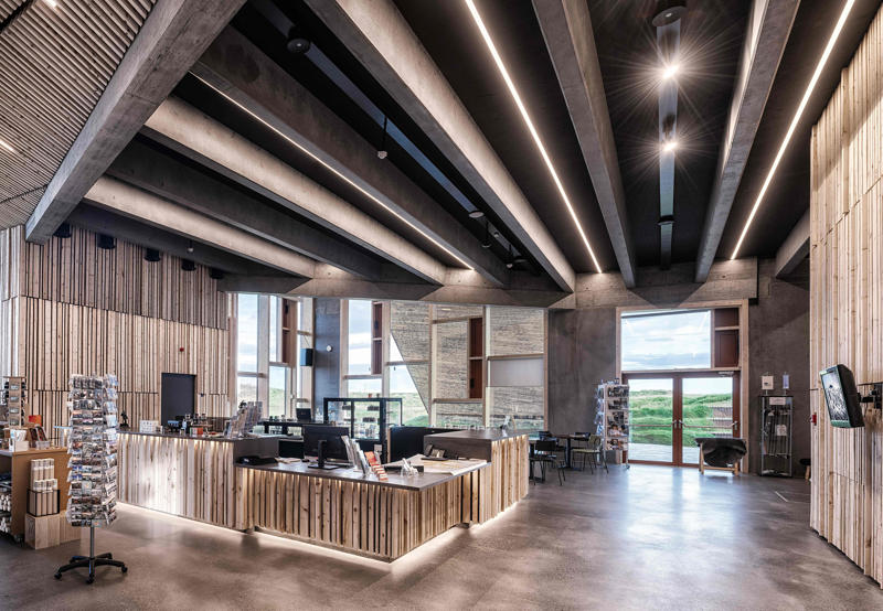 Kültürel ve bilgilendirici bir odak noktası olarak ele alınan ziyaretçi merkezi, Vatnajökull Ulusal Parkı için bir sergi alanı olmanın ötesinde, Skaftárhreppur bölgesinin tamamına hizmet veren bir bilgi merkezi işlevi de üstleniyor. Yapının çatı yüzeyi, doğrudan araziden elde edilen çimle kaplanarak erişilebilir bir kamusal yüzeye dönüşüyor; bu çatı yolu ve seyir platformu, ziyaretçilere Öræfajökull buzulu ve İzlanda’nın en yüksek noktası olan Hvannadalshnúkur manzarasını deneyimleme imkanı sunuyor. Sönghóll tepesinin eğimli arazisine kısmen gömülen yapı, görsel etkisini azaltırken zeminle güçlü bir ilişki kuruyor. Servis ve destek alanları topoğrafya içine yerleştirilerek, yapı bağımsız bir nesne olmaktan çok peyzajın doğal bir uzantısı gibi algılanıyor. Geniş cam açıklıklar, iç mekanı çevredeki doğal manzarayla ilişkilendirerek iç ve dış arasındaki sürekliliği güçlendiriyor.
