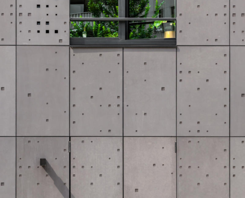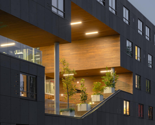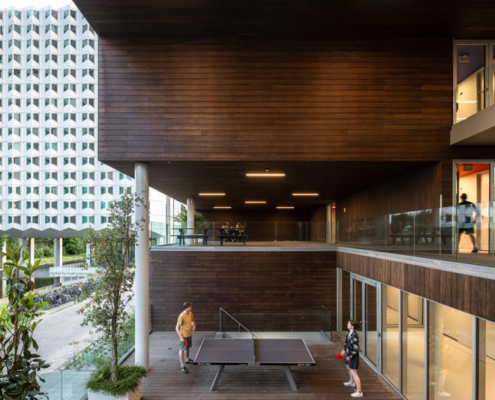 Tasarım, iç ve dış mekan deneyimleri arasında güçlü bir karşıtlık kuruyor. Dış cephe, mat siyah doğramalarla çerçevelenmiş grafit renkli Eternit TE 80 panellerle kaplanmış. Delikli paneller, yüzeyi farklı ritimlerle parçalıyor; gece olduğunda yapıyı ışık oyunlarıyla dönüştürüyor. İç mekanda, Sucupira Amarela ahşap zeminler, duvarlar ve tavanlar ortak alanlara sıcaklık ve bütünlük kazandırıyor. Kalp’te yer alan entegre mobilyalar ve bitkisel elemanlar, kullanıcıların serbestçe hareket edebileceği işlevsel bir atmosfer yaratıyor.