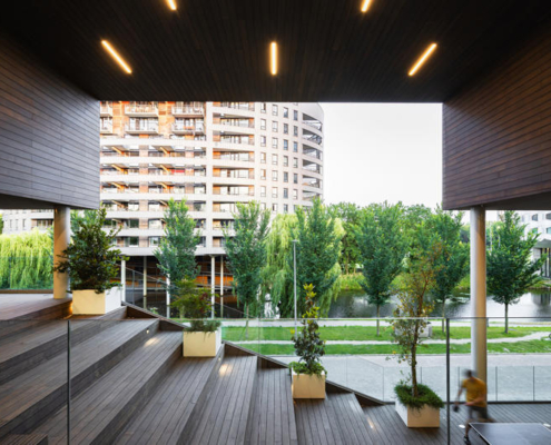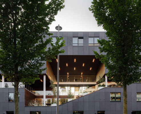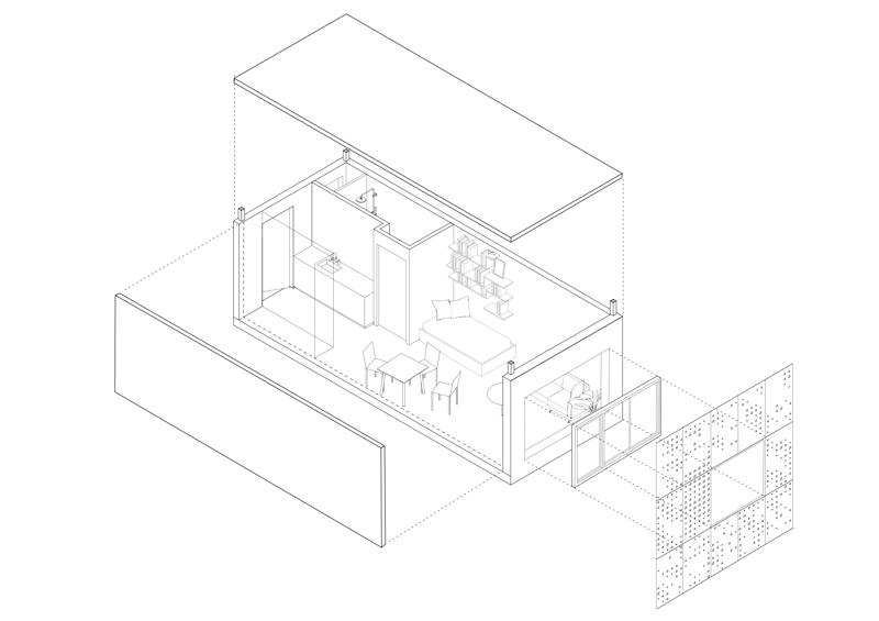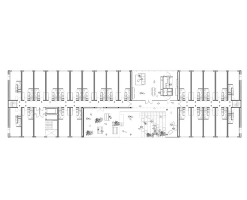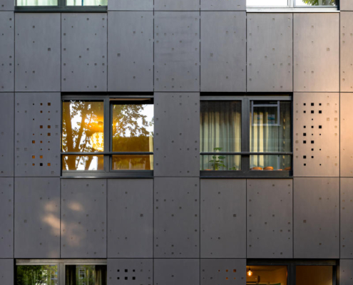 Tüm ortak işlevler yapı içinde çözülmüş; böylece çatı alanı tamamen sedum bitkileriyle kaplı yeşil bir peyzaj ve güneş panellerine ayrılmış. Studioninedots tarafından tasarlanan Suite 9, modüler üretim teknolojisini sosyal yaşamla birleştirerek Delft Teknoloji Üniversitesi’nin kampüsünde öğrenci konutuna yeni bir mimari kimlik kazandırıyor.