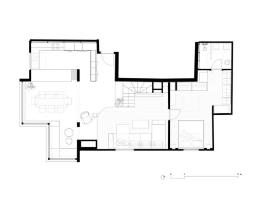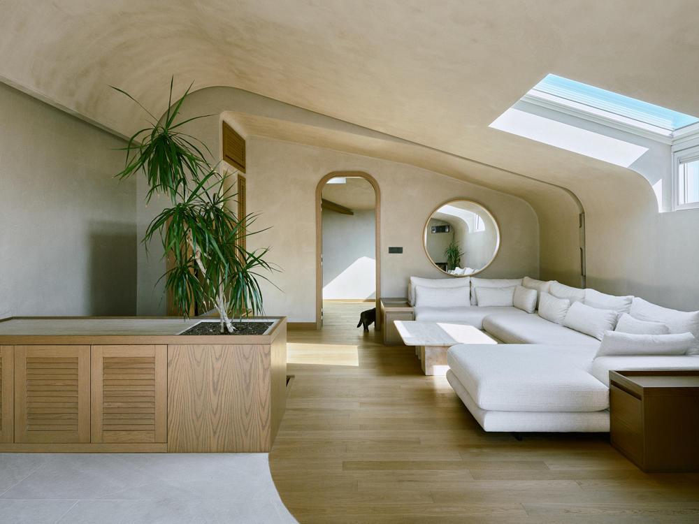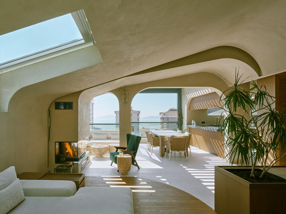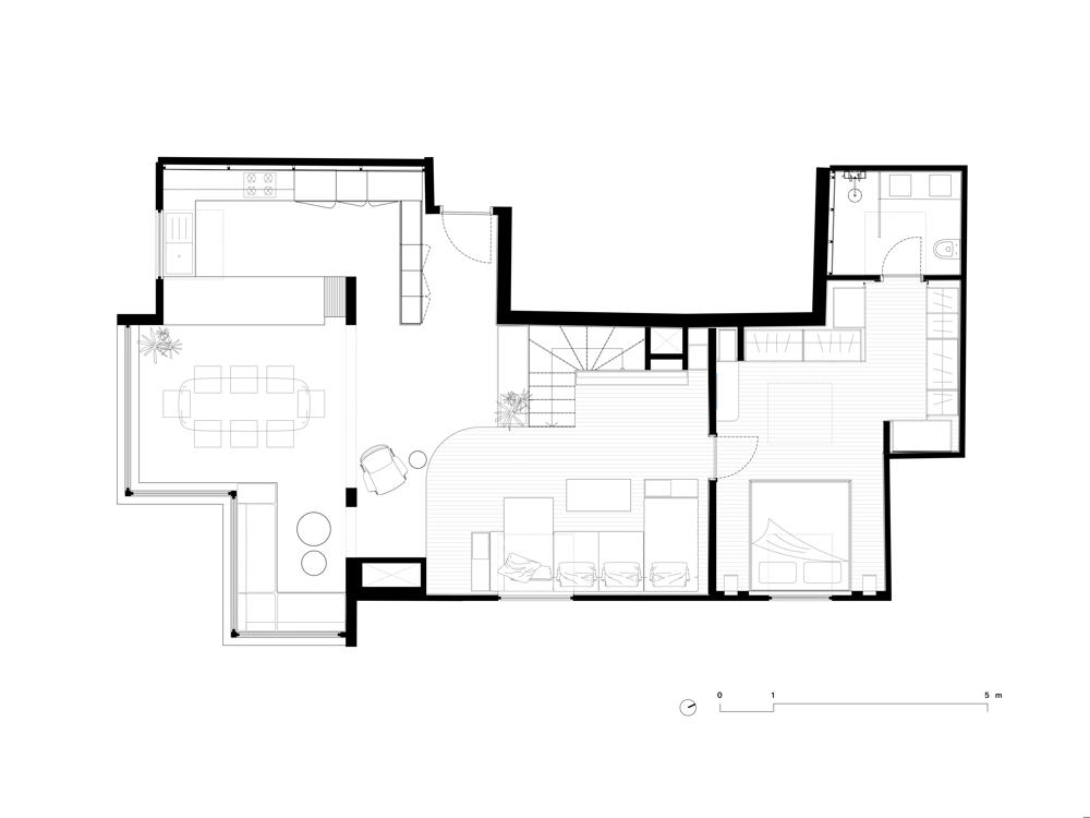 İç mekan ile dış mekan sınırını tamamen kaldırabilen yaşam alanı kurgusunda, ışık ve malzemenin sağladığı mekansal zenginlik ile plan şemasının hedeflediği işlevsellik dengesi gözetilmiş. Merdivenden ulaşılan ana yaşam alanı, yapı elemanlarını bütünleştiren ve mekanın üçüncü boyuttaki sınırlarını ortadan kaldıran kabuk ile sarmalanmış. Bu kabuğun eğrisel hatları, mekana yüksek ve ferah bir his kazandırırken manzaraya odaklanmayı da sağlıyor. Yer yer parçalanan kabuk, şömine ve kitaplığa dönüşmüş, yırtılan bölümlerinde aydınlatma elemanları entegre edilerek mekansal vurgular oluşturulmuş.