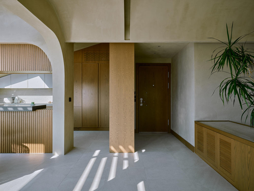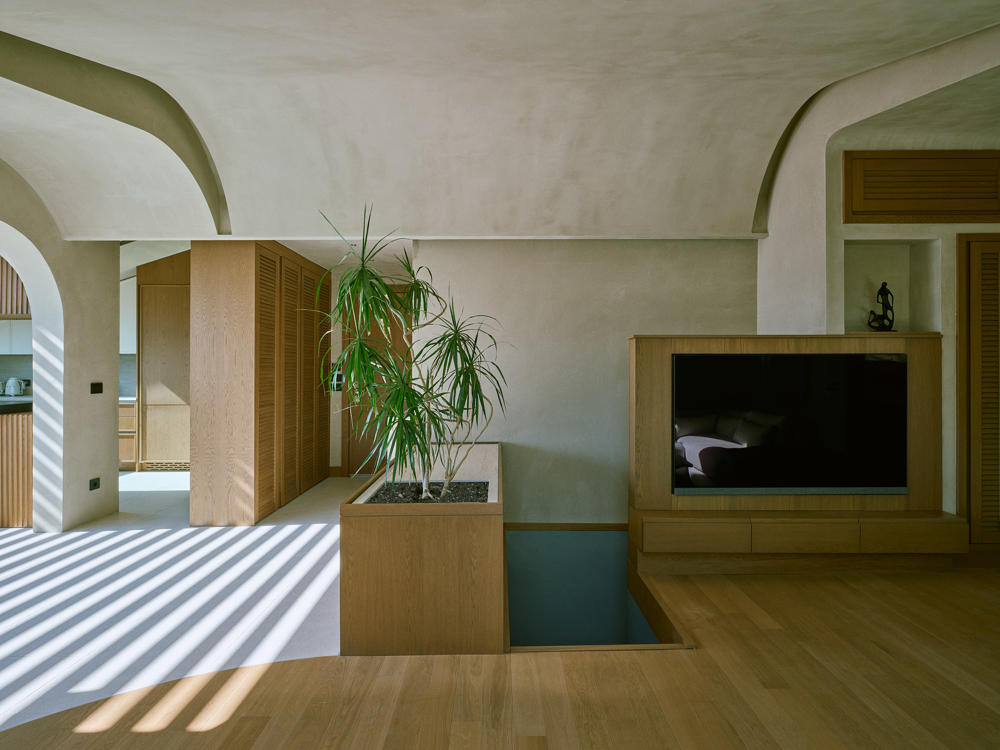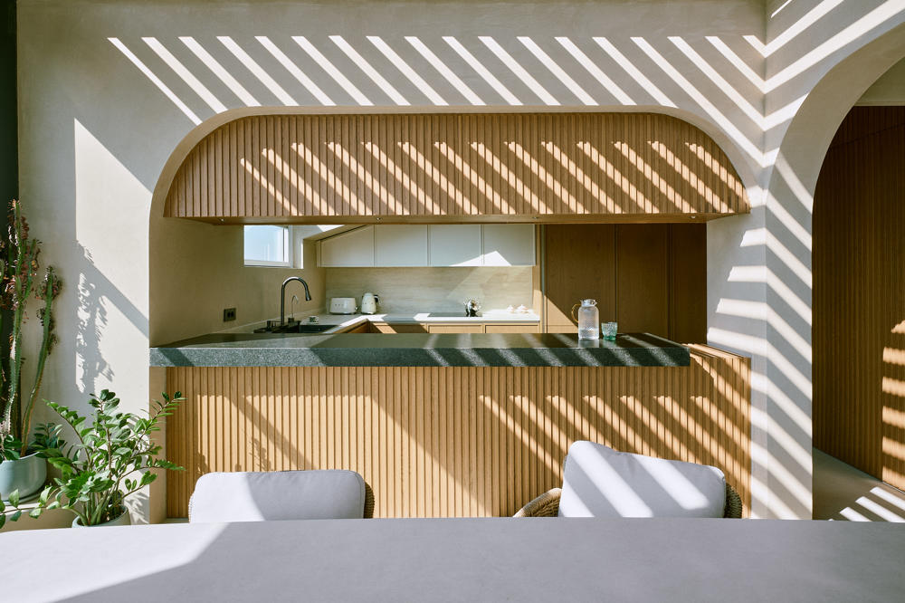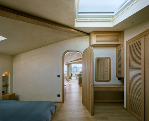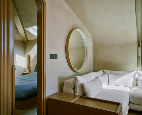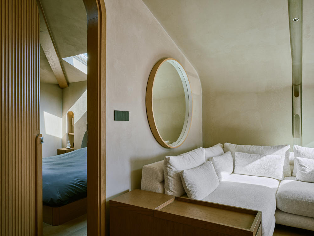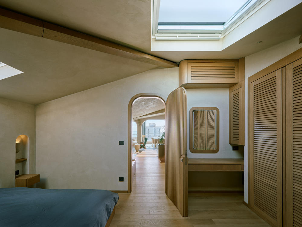 Yaşam alanından dinlenme ve istirahat alanlarına geçişte, zemin kaplaması alanın işlevsel dönüşümüne paralel olarak taş yüzeyden sıcak dokulu ahşaba evriliyor. Yatak odasında da aynı yalınlığı ve sakinliği sağlamak amacıyla malzeme paleti ve ışık dengesi özenle kurgulanmış.