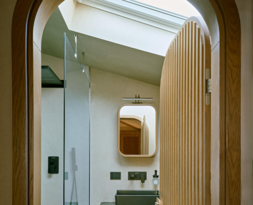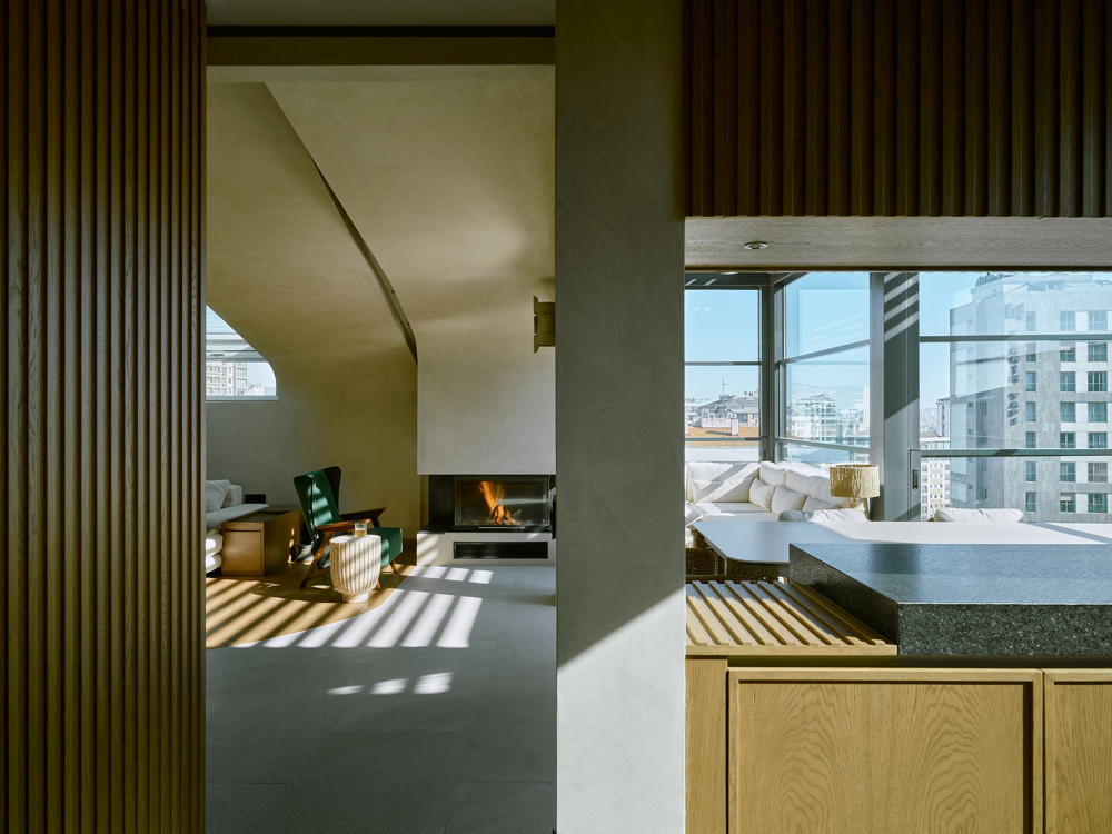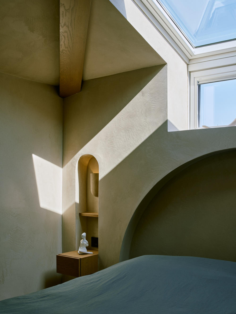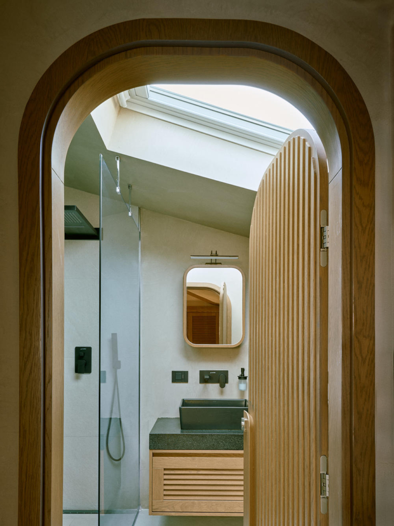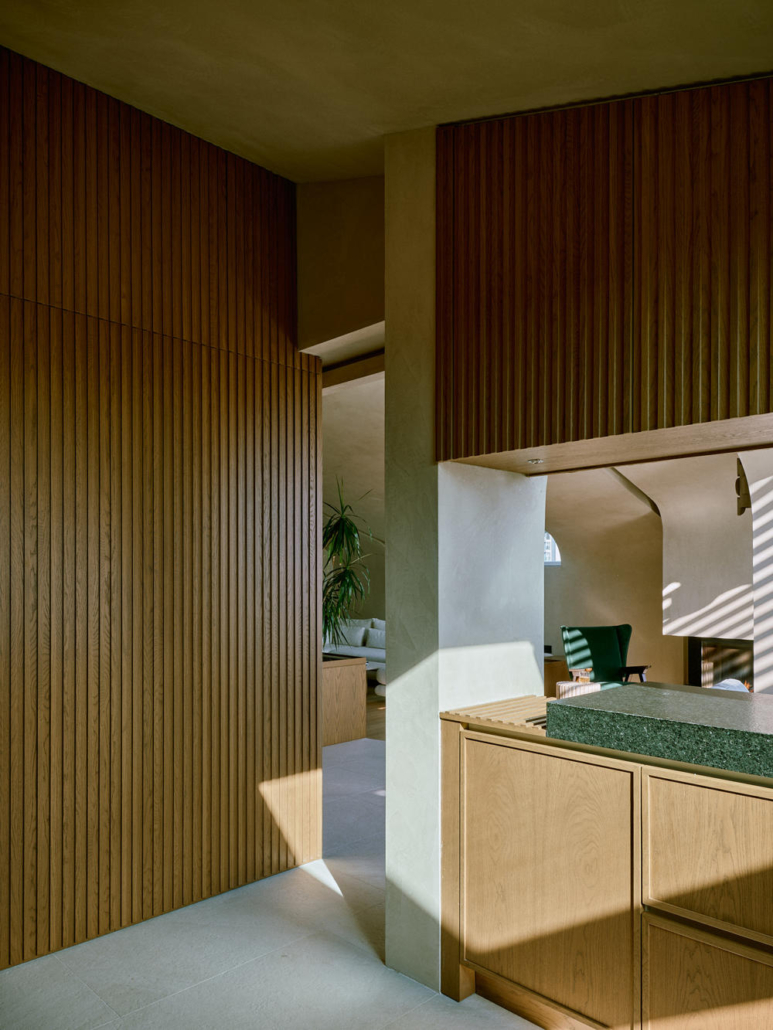 Yaşam alanından dinlenme ve istirahat alanlarına geçişte, zemin kaplaması alanın işlevsel dönüşümüne paralel olarak taş yüzeyden sıcak dokulu ahşaba evriliyor. Yatak odasında da aynı yalınlığı ve sakinliği sağlamak amacıyla malzeme paleti ve ışık dengesi özenle kurgulanmış.