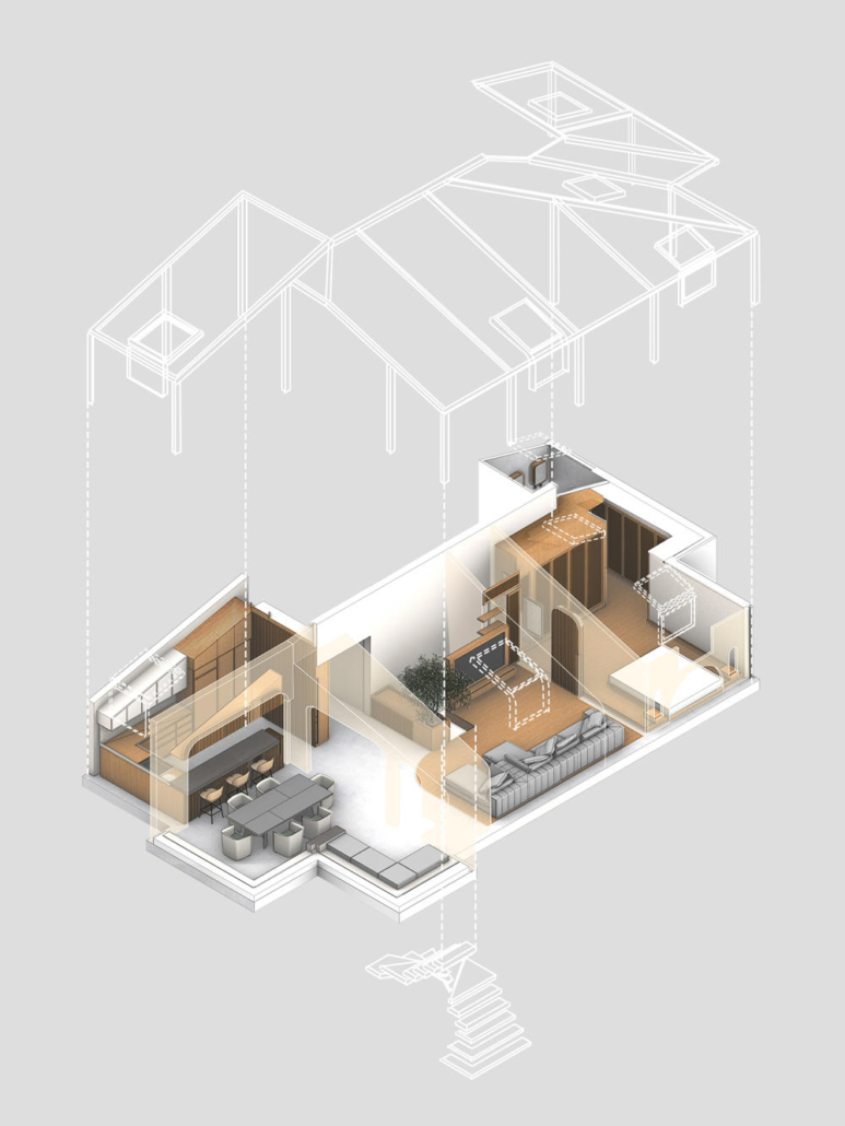 Tek cepheli hacimde ana tasarım sorunsalı olan ışık, hareketli ve sabit cephe/çatı sistemleri aracılığıyla mekanı zenginleştiren, ayıran, birleştiren ve tanımlayan bir yapı elemanına dönüşmüş. Işığın oluşturduğu omurga ile bütünleşen mekanlarda, doğal, mat ve pastel tonlardaki malzeme paleti ve akışkan formlar sayesinde samimi ve yalın bir atmosfer elde edilmesi amaçlanmış.