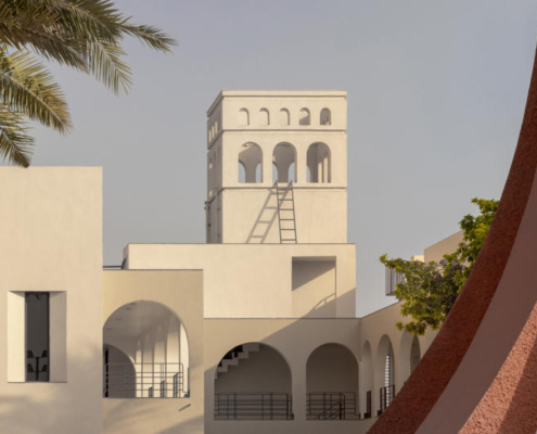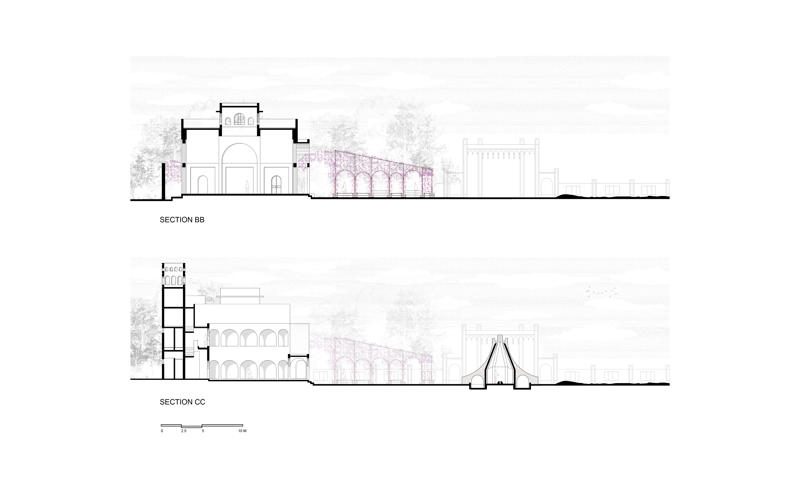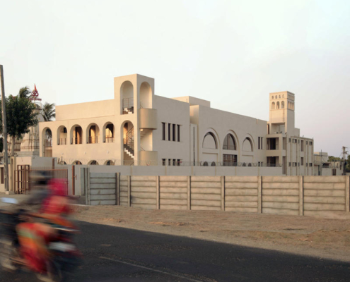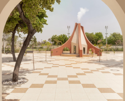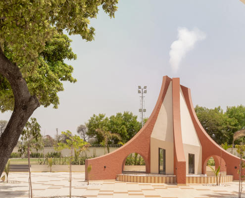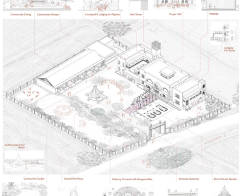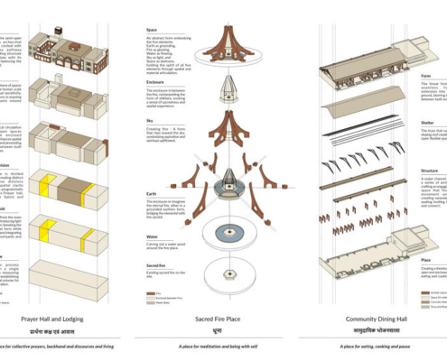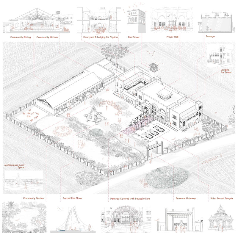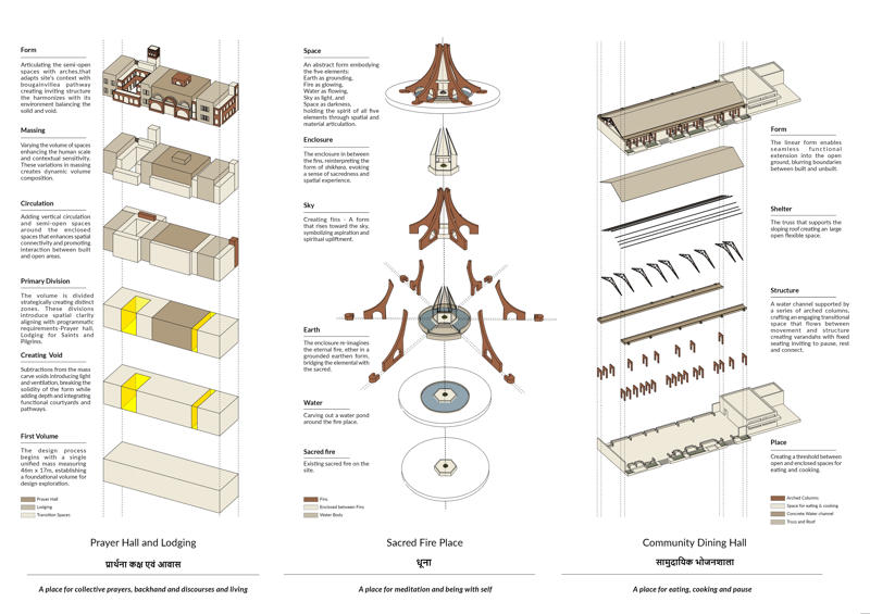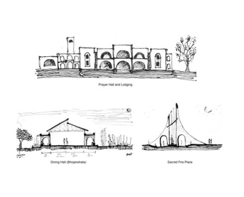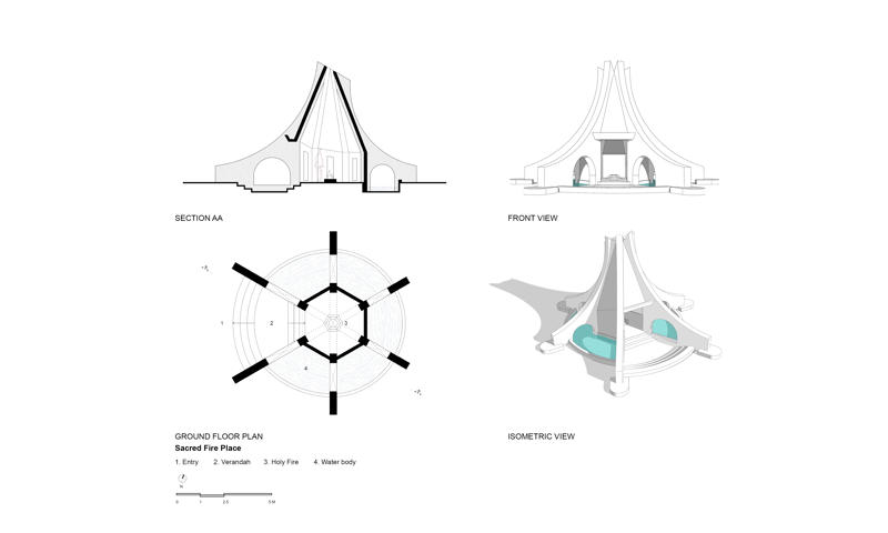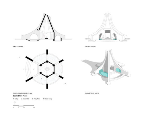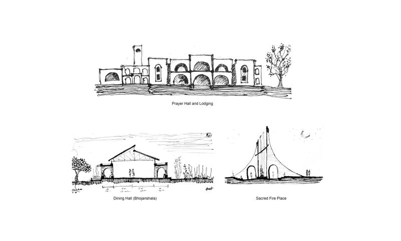 Tasarım araştırmaları, dua salonu ve konaklama bloğunun doğrusal kütlesinin mevcut tapınaklara ve araziye baskın gelmeden çözülmesine odaklanıyor. Kutsal ateş alanı ise tapınak kompleksinin odak noktası olarak tasarlanmış. Dua salonunda kemerler cepheye paralel olarak uzanıyor ve yüzeyi biçimlendiriyor. Avluda ise kemerler yarı açık mekanlar yaratıyor. Kuş kulesindeki küçük kemerler kuşlar için yuva nişleri oluşturuyor. Buna karşılık, yemek salonundaki kemerler cepheye dik yerleştirilmiş. Kutsal ateş alanı ise ters kemerlerle vurgulanmış.