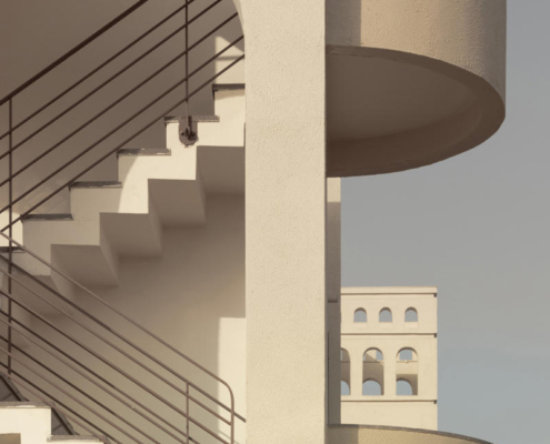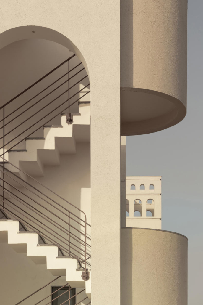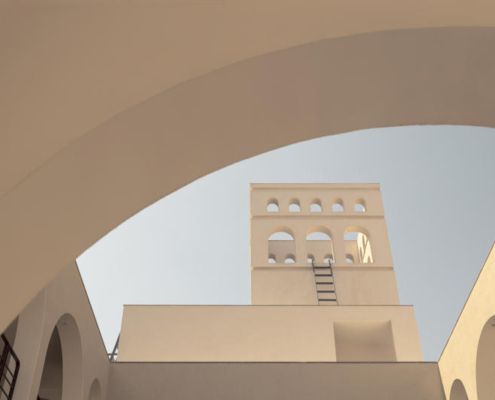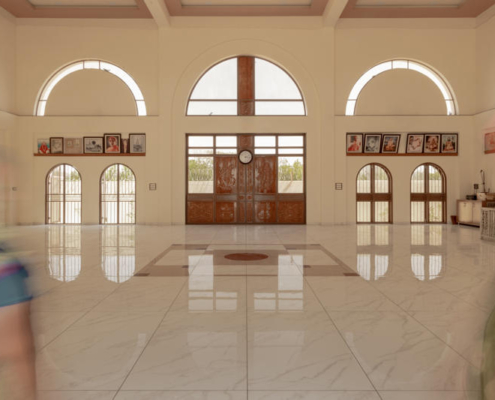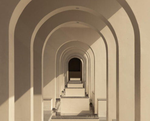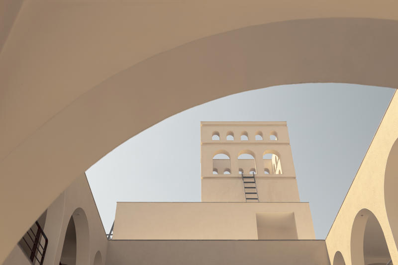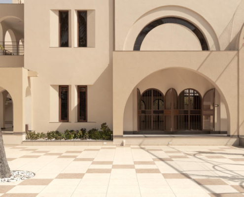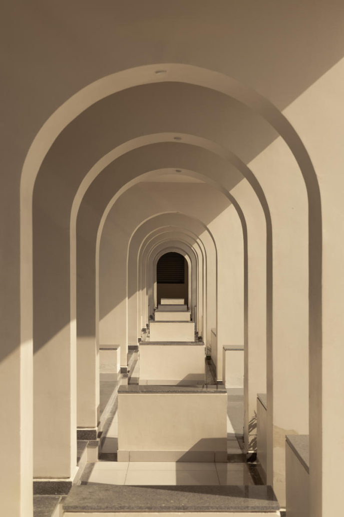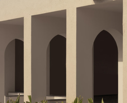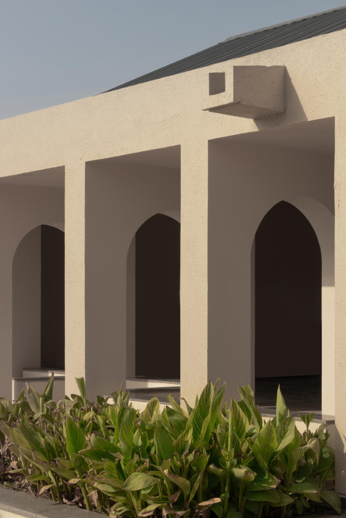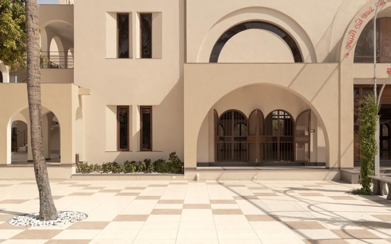 Kemerlerin merkezi bir tasarım unsuru olarak entegrasyonu, cemaatin kutsal alana çıkan begonvilli yolu çerçeveleyen kemerli geçitten ilham alıyor. Tasarımda kemerler yapısal, estetik ve işlevsel düzeylerde dikkatlice ele alınmış; ölçek, oran, yönelim ve malzeme açısından çeşitli varyasyonlarla işlenmiş. Dua salonunda cepheye paralel sıralanan kemerler, büyük yüzeyi biçimlendirerek mekana ritmik açıklıklar kazandırmış; ışıkla dinamik bir oyun yaratmış.