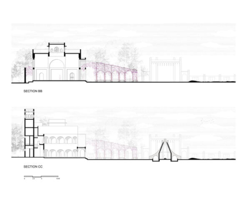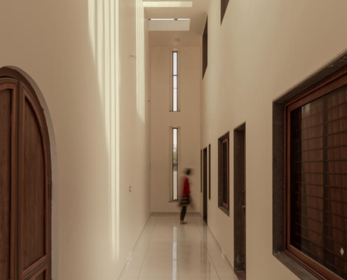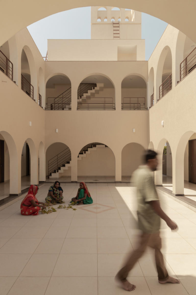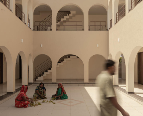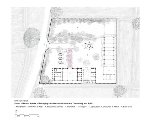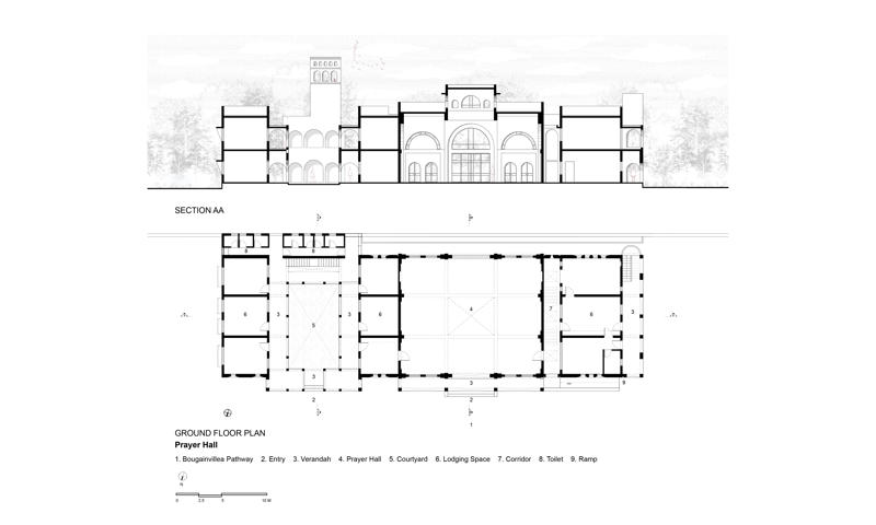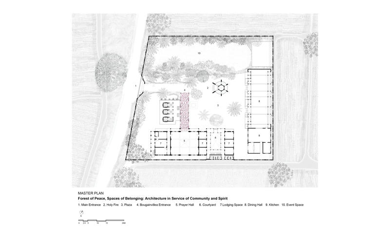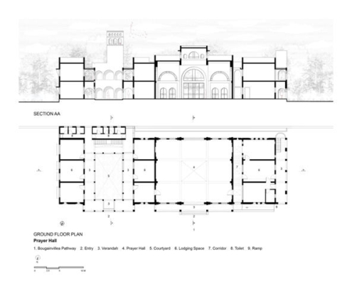 Planın mekansal organizasyonu, geleneksel tapınak kompleksi yerleşim düzenini takip ediyor. Açık bir avlu etrafında düzenlenmiş kamusal ve yarı-kamusal alanlar arasında bir hiyerarşi kurulmuş. Bu birbirine bağlı mekanlar, gayriresmi etkileşimi, ortak ritüelleri ve kuşaklar arası diyaloğu teşvik ediyor. Doğal ışık ve havalandırma yalnızca pasif özellikler değil, aynı zamanda aktif tasarım araçları olarak kullanılmış. Kemerli açıklıklar, pencereler ve hava geçişleri gün boyunca ışık ve havanın akışını yönlendirerek yapay sistemlere olan bağımlılığı azaltmış ve duyusal deneyimi zenginleştirmiş.