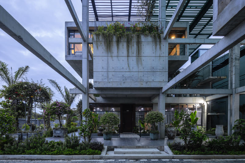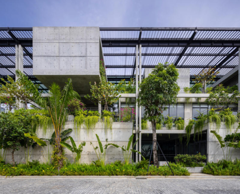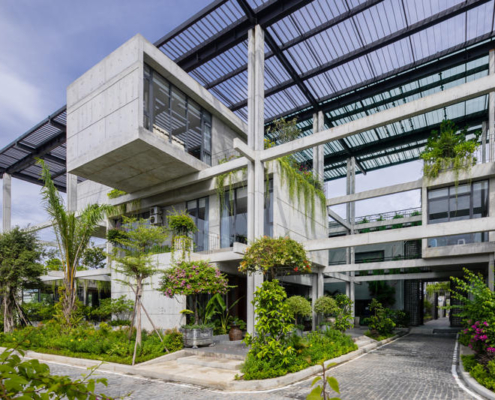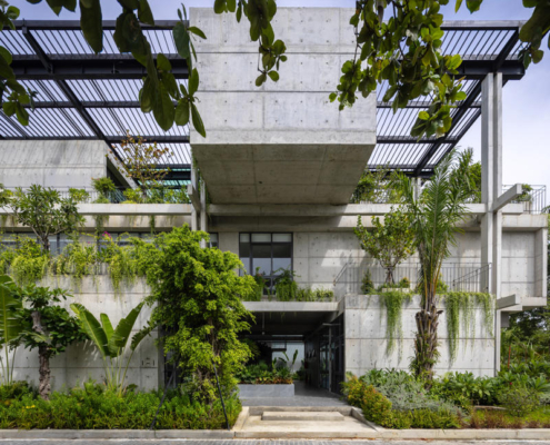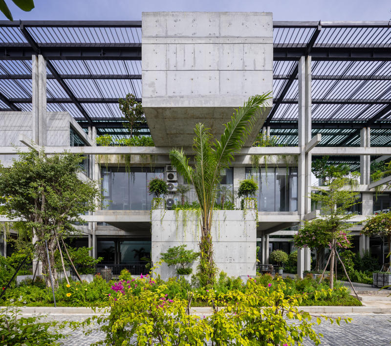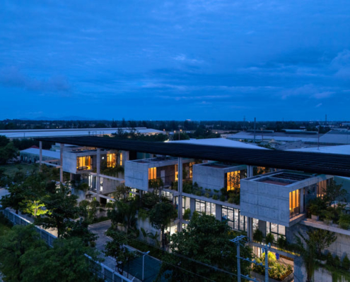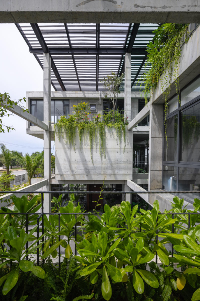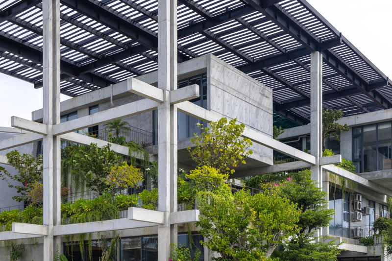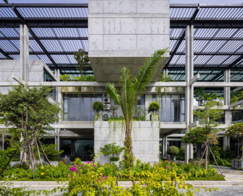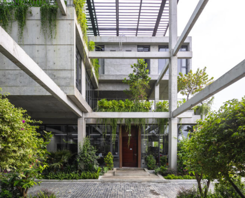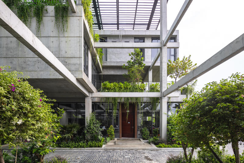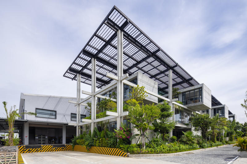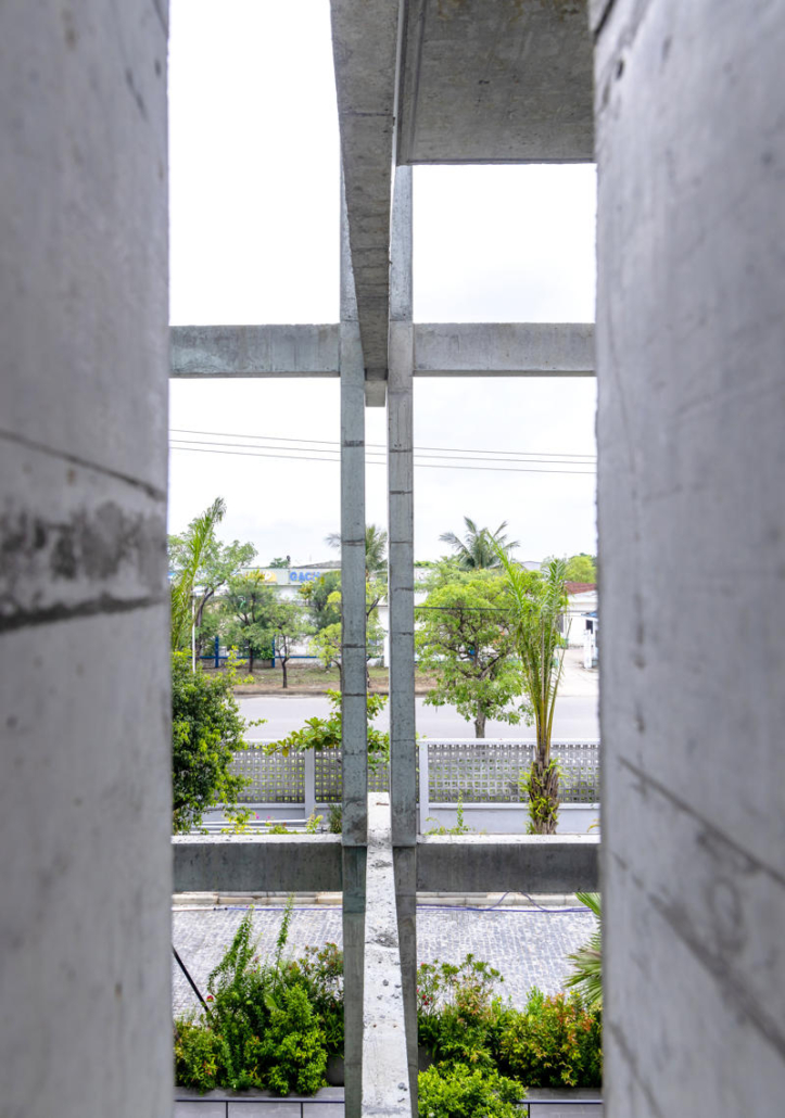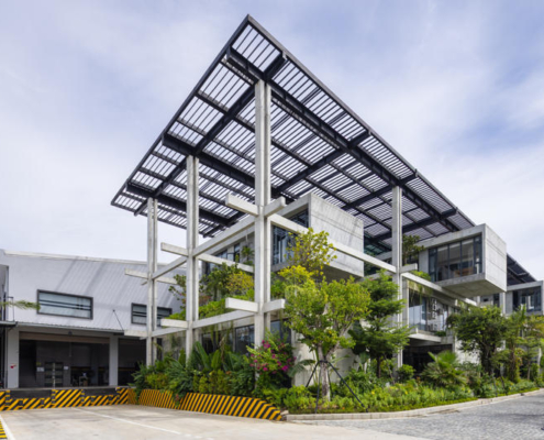 Ho Khue Architects tarafından dönüşüm projesi gerçekleştirilen Da Nang’daki Tekstil Fabrikası Ofisi’nde geleneksel dokuma tezgahının ahşap iskeletinden esinlenerek beton kütleler geçirgen bir strüktür içinde yeniden kurgulanıyor.