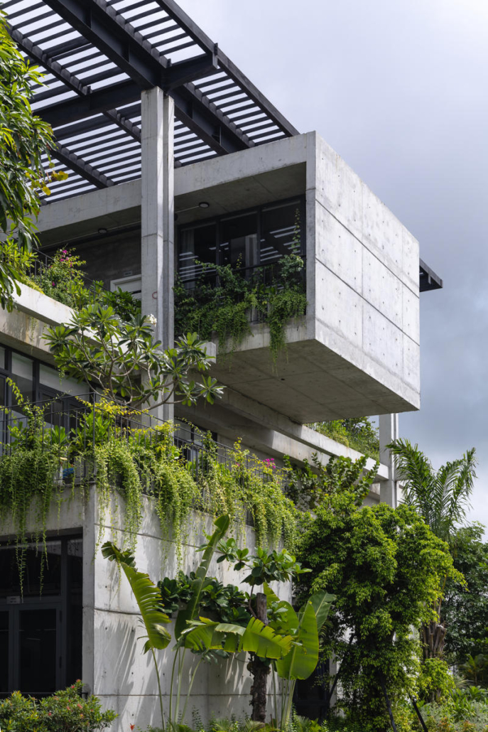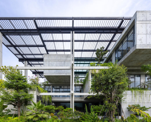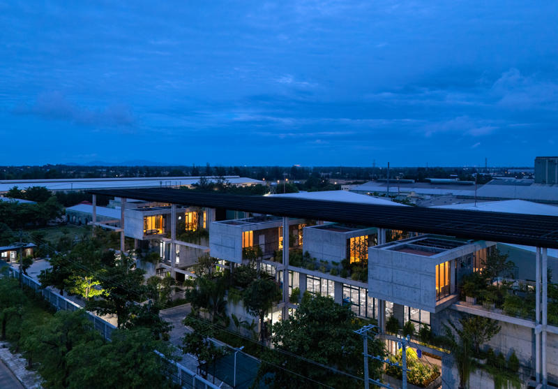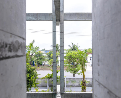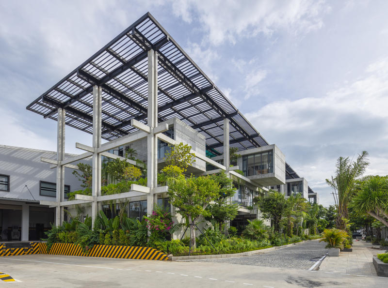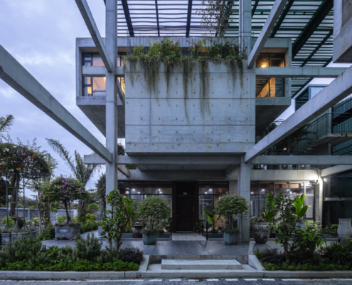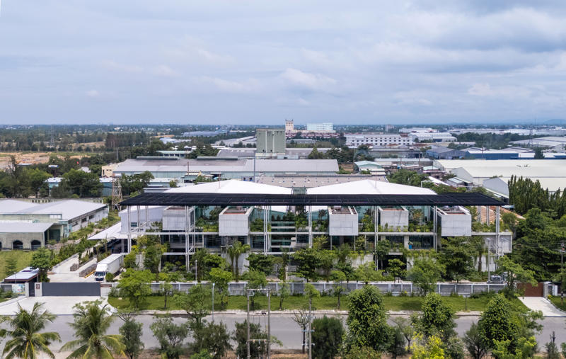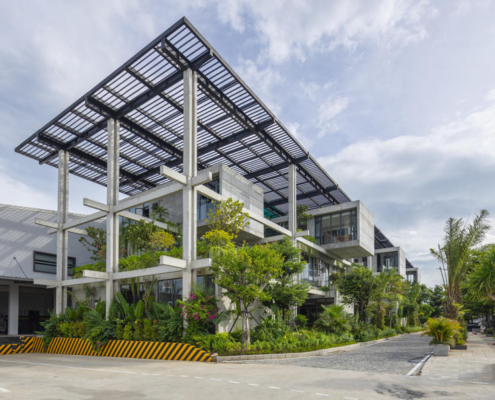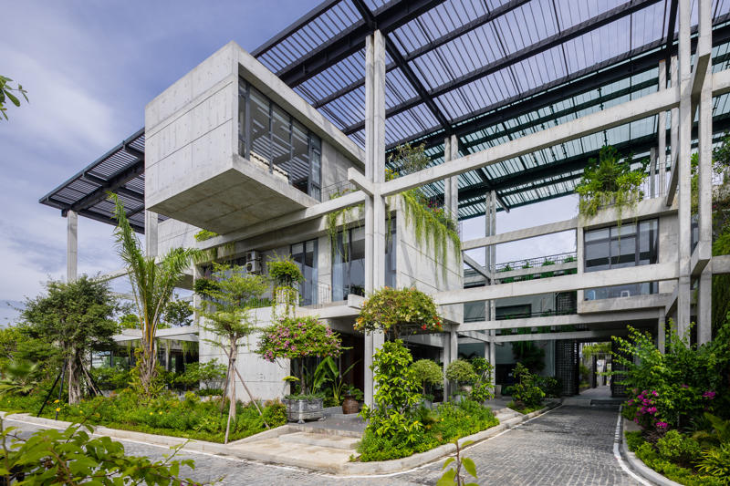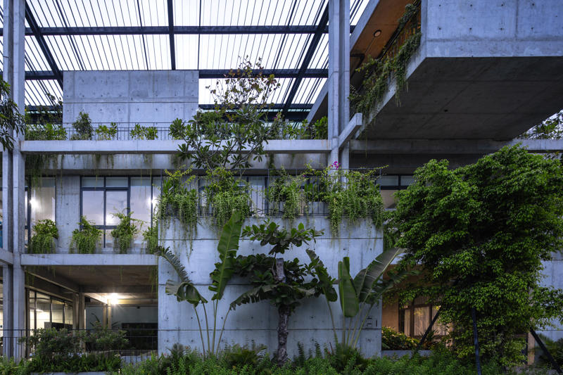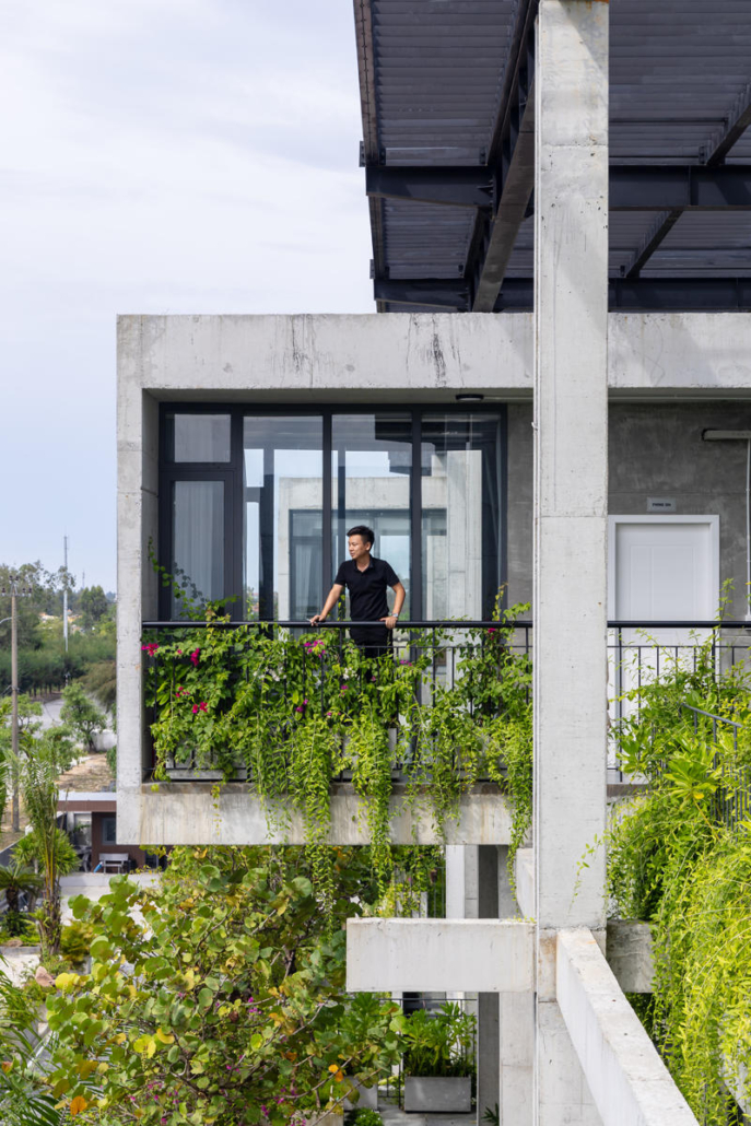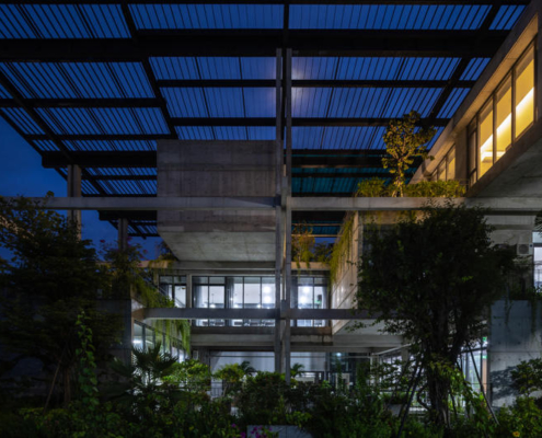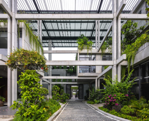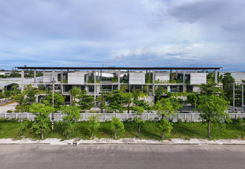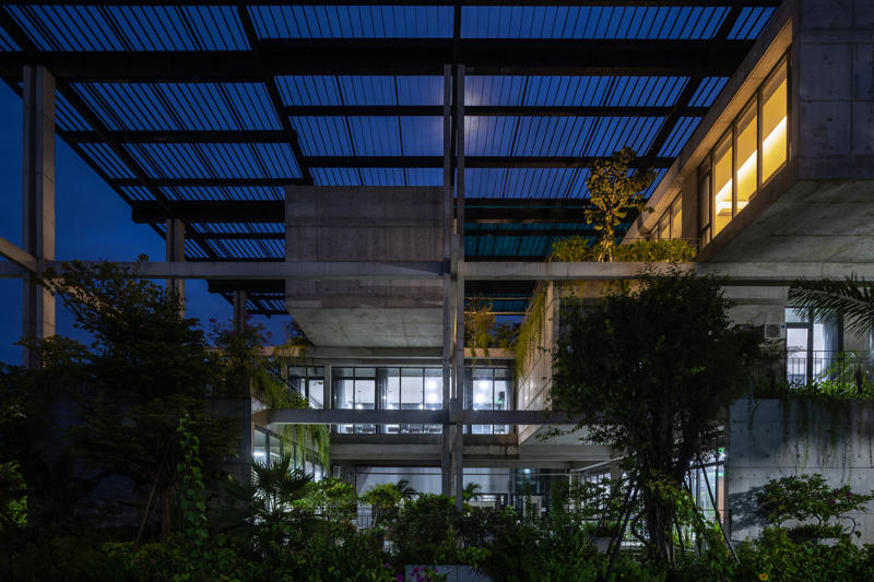Ho Khue Architects tarafından dönüşüm projesi gerçekleştirilen Da Nang’daki Tekstil Fabrikası Ofisi’nde geleneksel dokuma tezgahının ahşap iskeletinden esinlenerek beton kütleler geçirgen bir strüktür içinde yeniden kurgulanıyor.