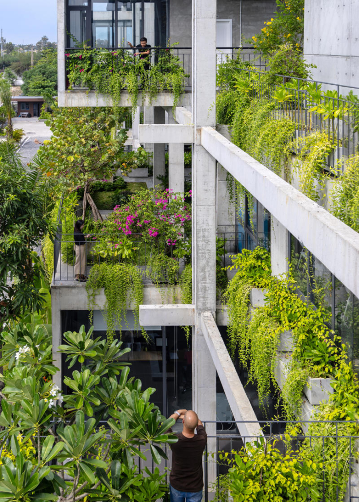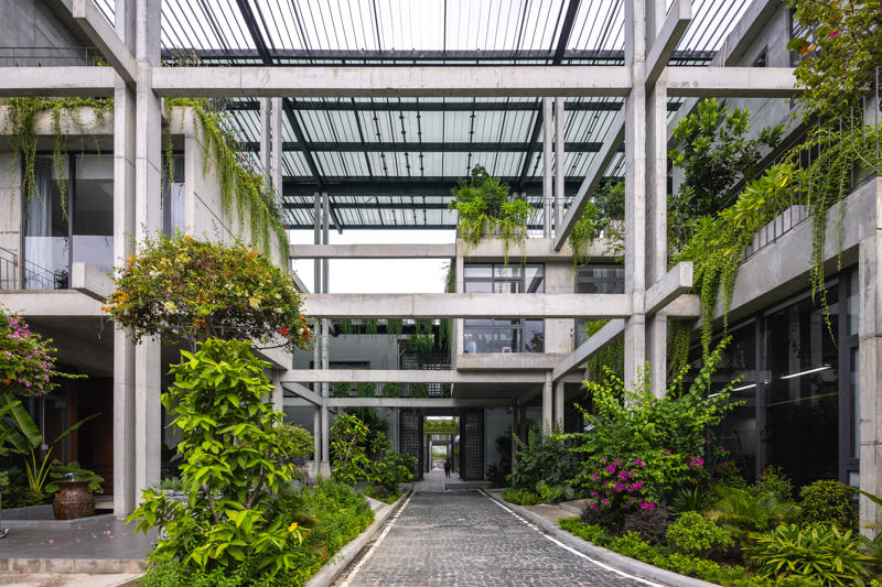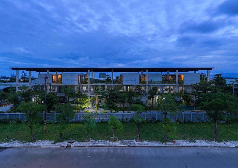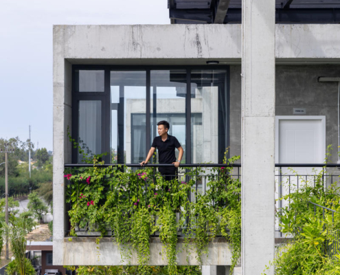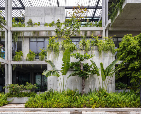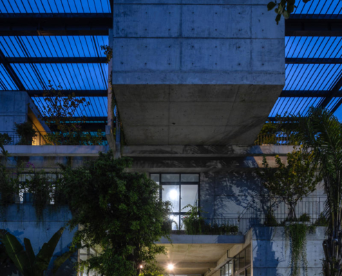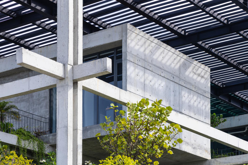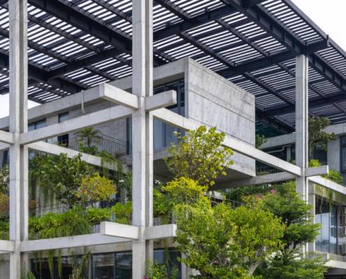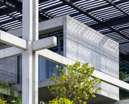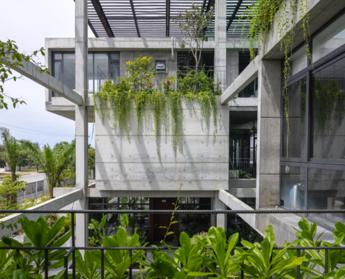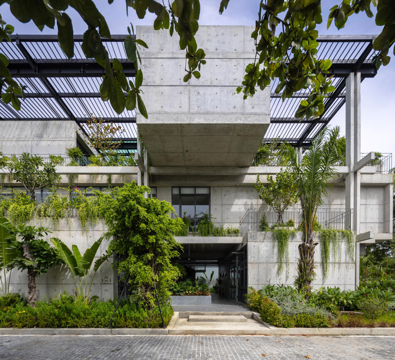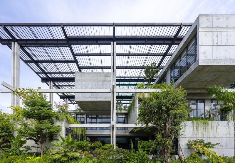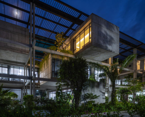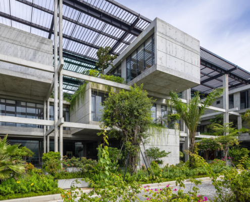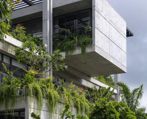 Ho Khue Architects tarafından dönüşüm projesi gerçekleştirilen Da Nang’daki Tekstil Fabrikası Ofisi’nde geleneksel dokuma tezgahının ahşap iskeletinden esinlenerek beton kütleler geçirgen bir strüktür içinde yeniden kurgulanıyor.