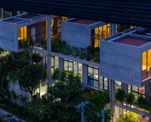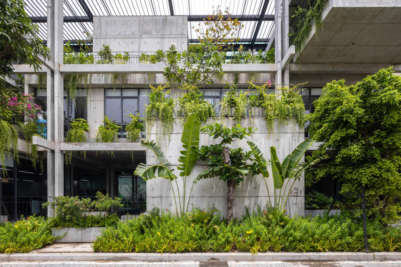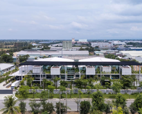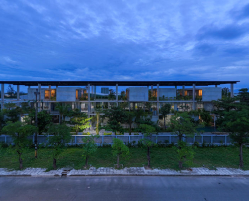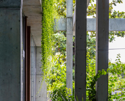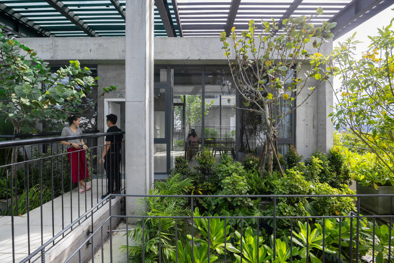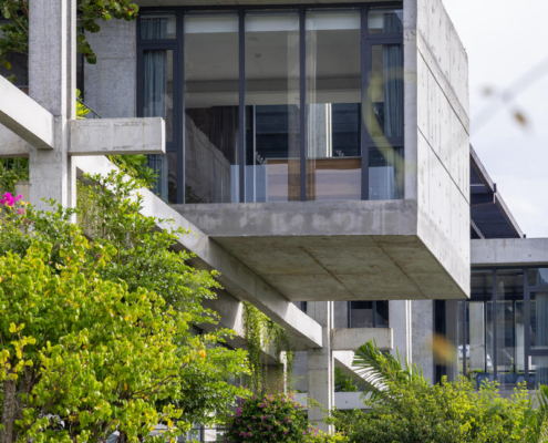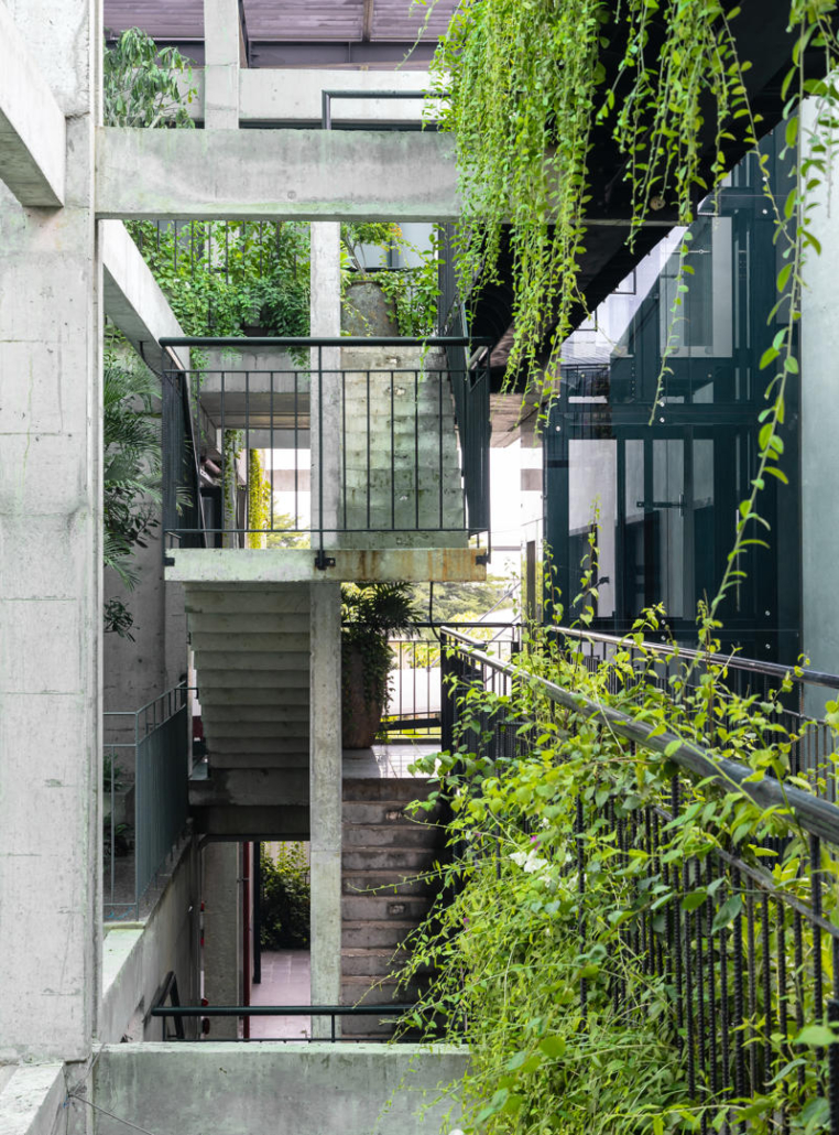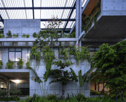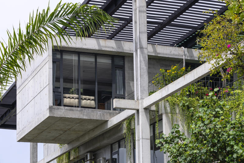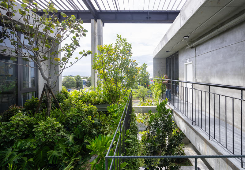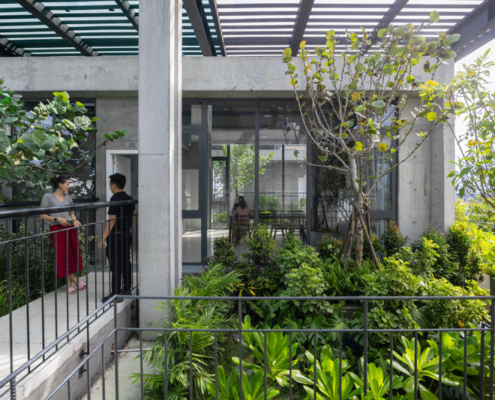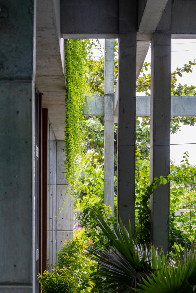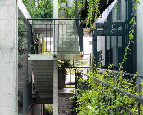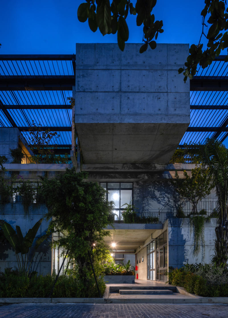Ho Khue Architects tarafından dönüşüm projesi gerçekleştirilen Da Nang’daki Tekstil Fabrikası Ofisi’nde geleneksel dokuma tezgahının ahşap iskeletinden esinlenerek beton kütleler geçirgen bir strüktür içinde yeniden kurgulanıyor.