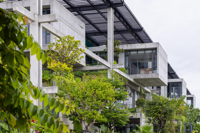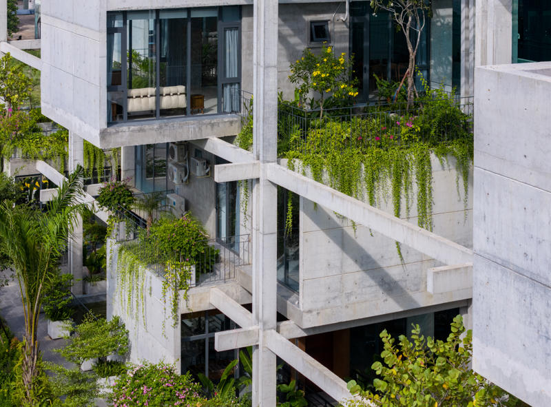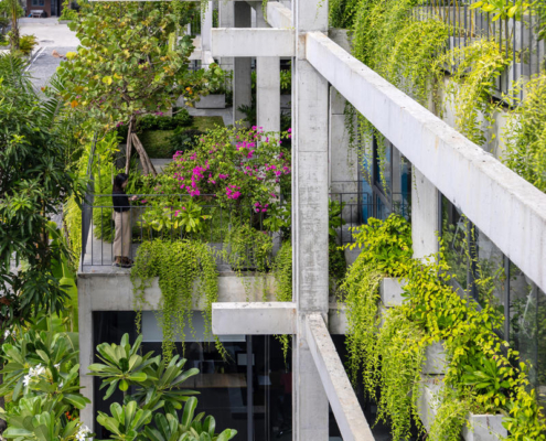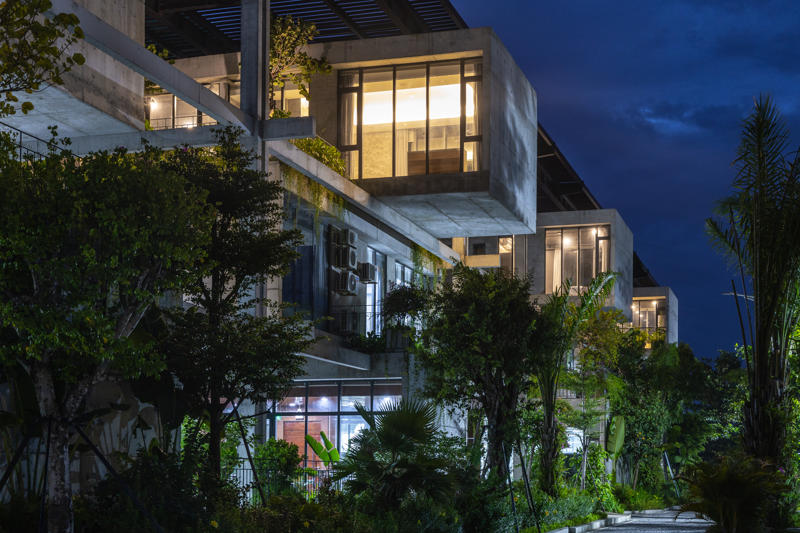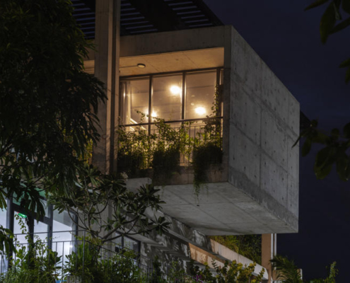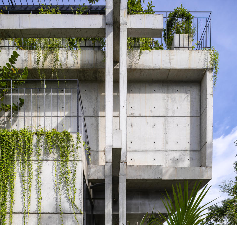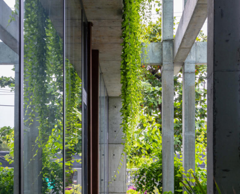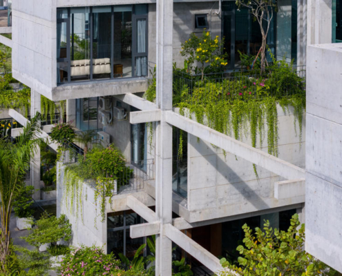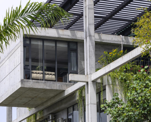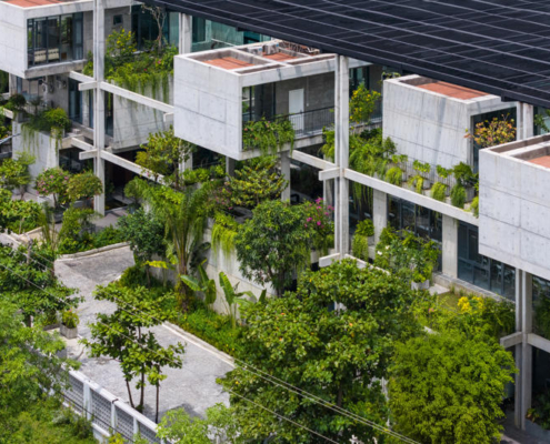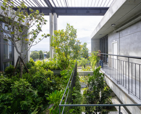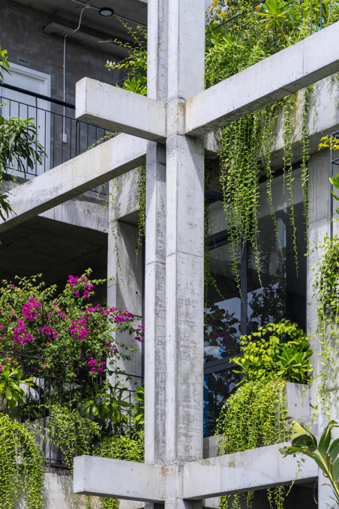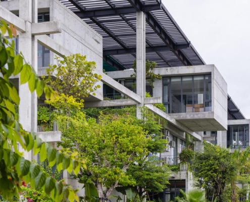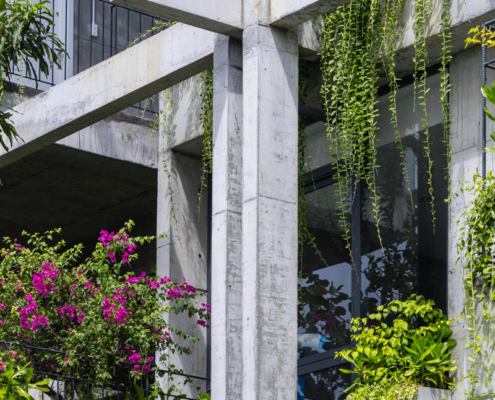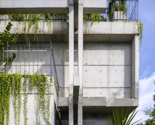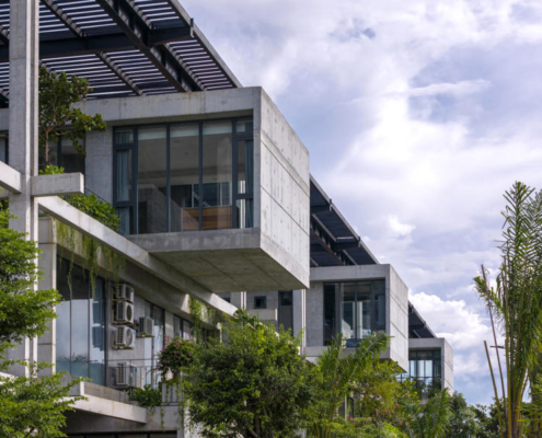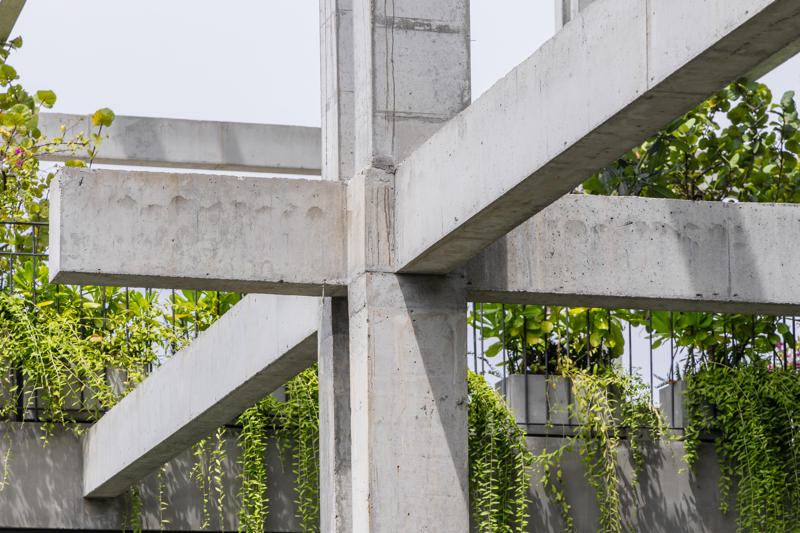 Ho Khue Architects tarafından dönüşüm projesi gerçekleştirilen Da Nang’daki Tekstil Fabrikası Ofisi’nde geleneksel dokuma tezgahının ahşap iskeletinden esinlenerek beton kütleler geçirgen bir strüktür içinde yeniden kurgulanıyor.