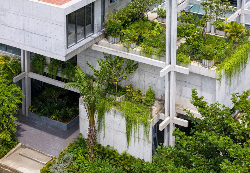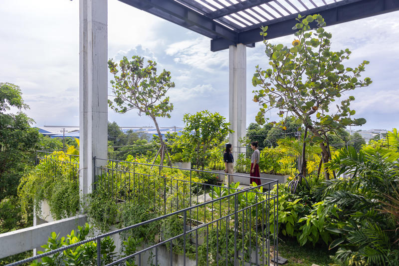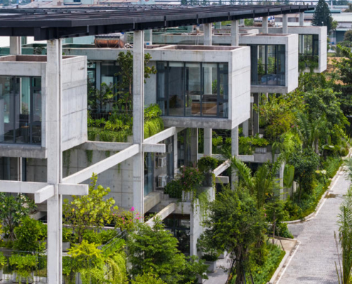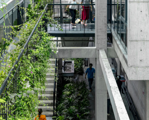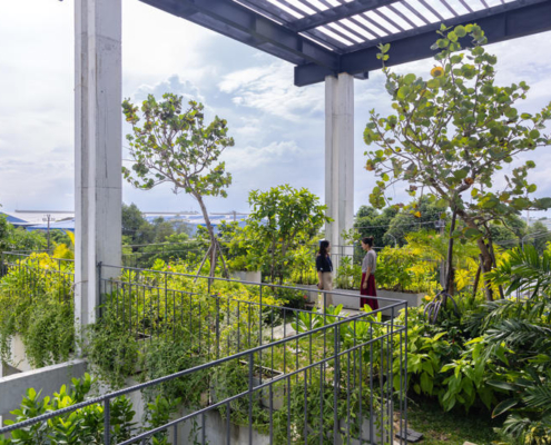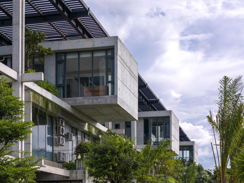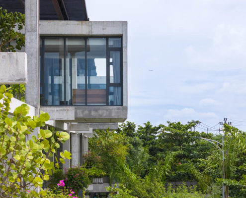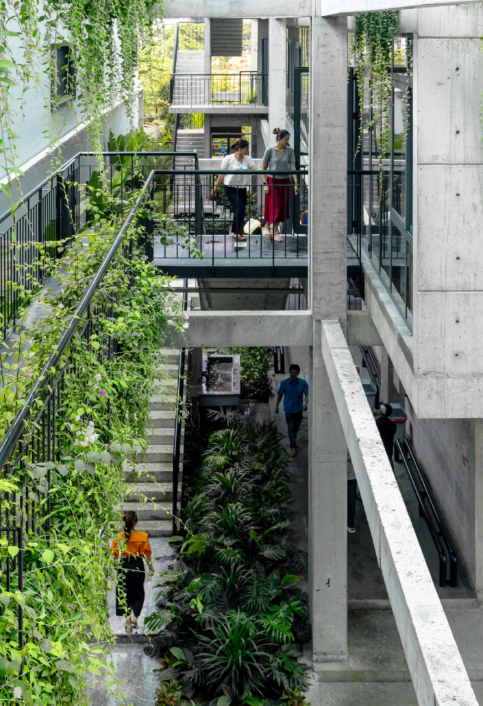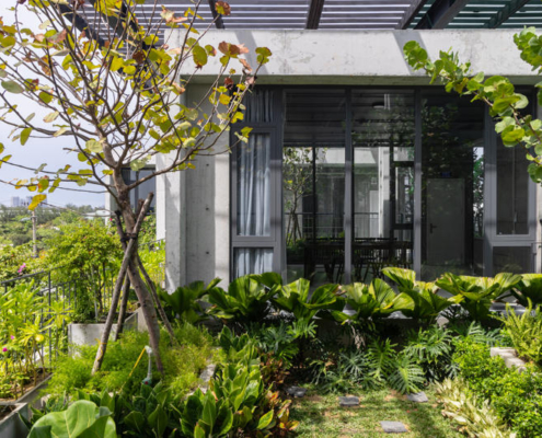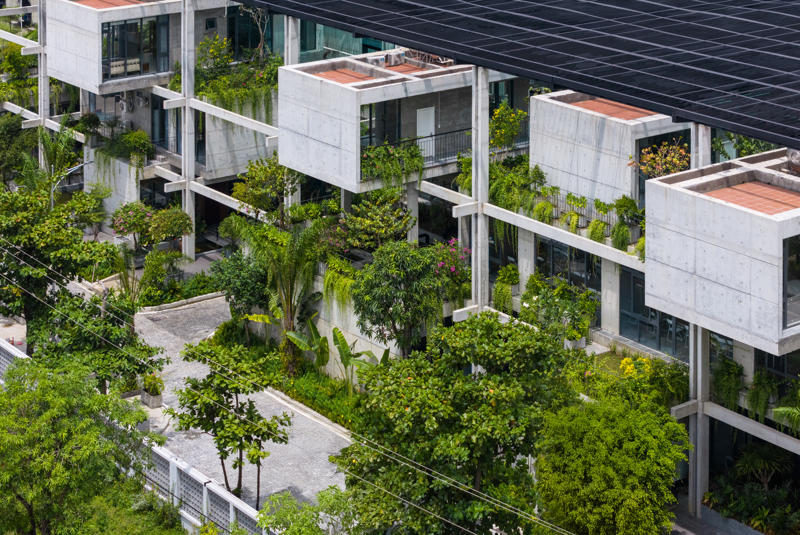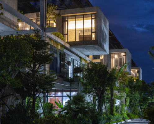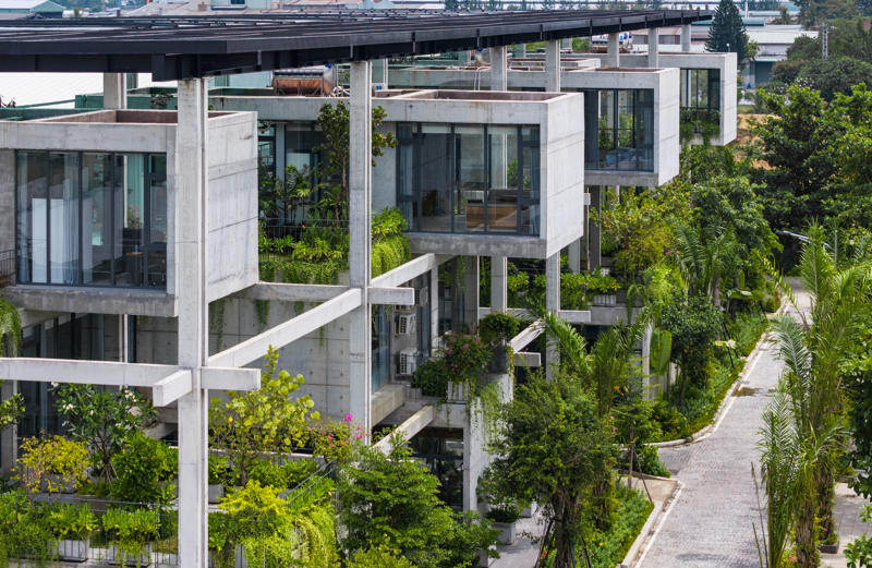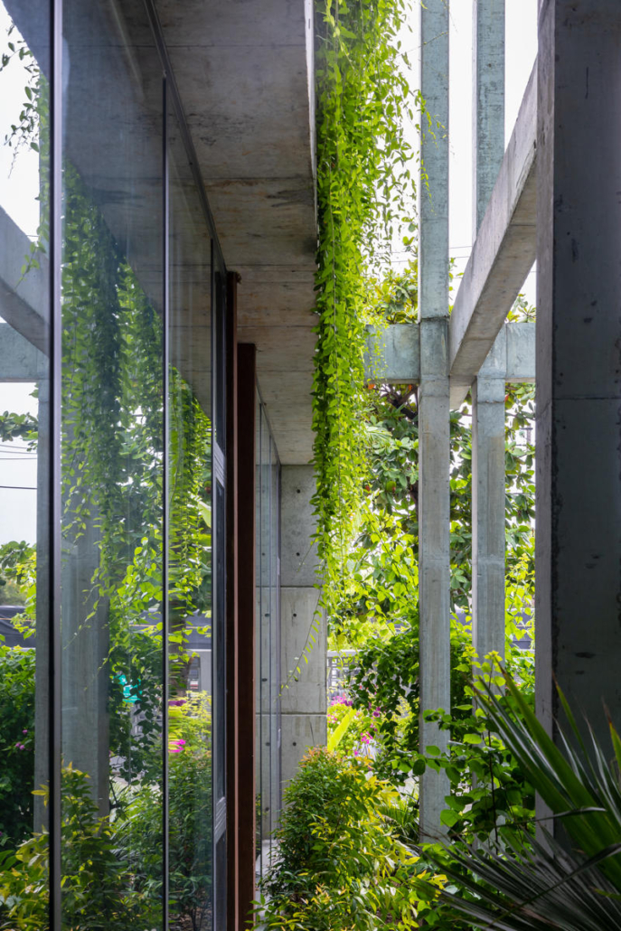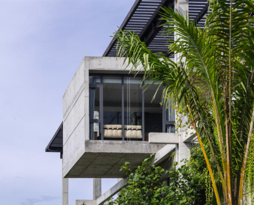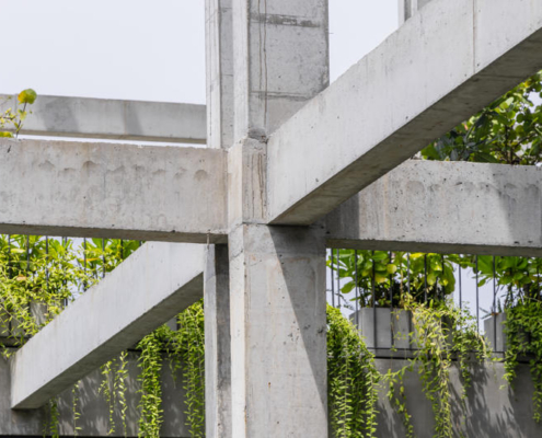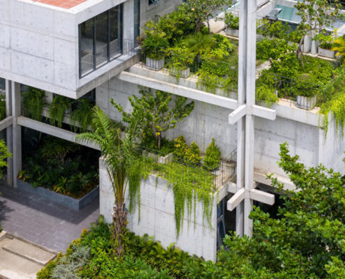 Ho Khue Architects tarafından dönüşüm projesi gerçekleştirilen Da Nang’daki Tekstil Fabrikası Ofisi’nde geleneksel dokuma tezgahının ahşap iskeletinden esinlenerek beton kütleler geçirgen bir strüktür içinde yeniden kurgulanıyor.