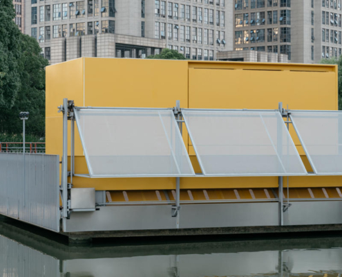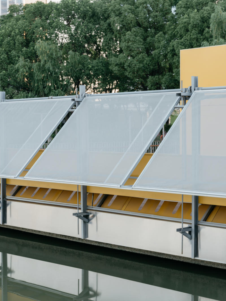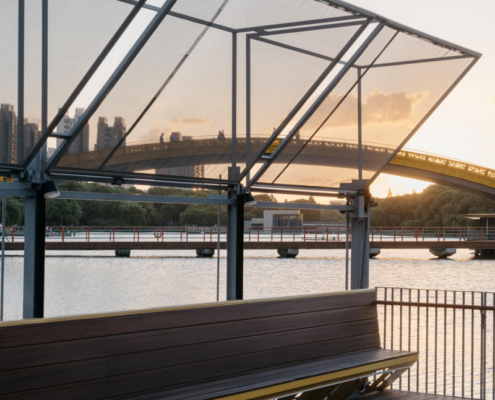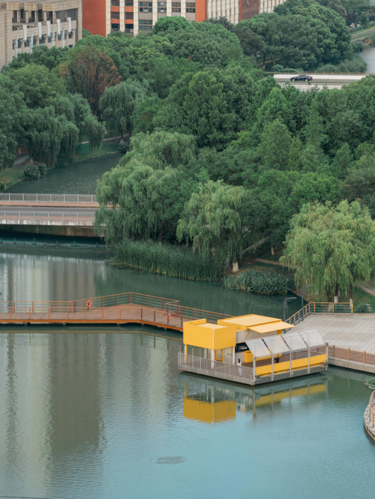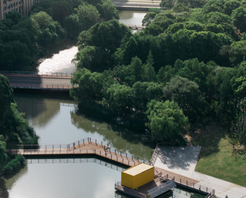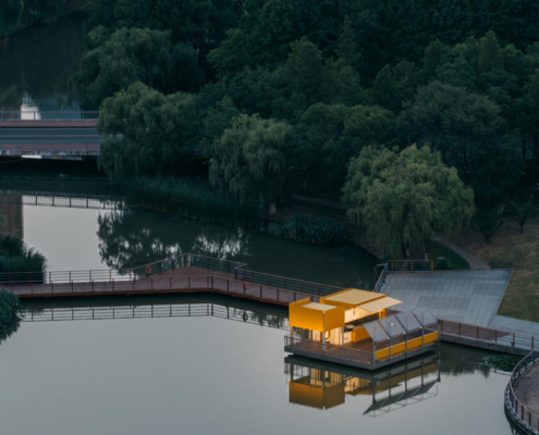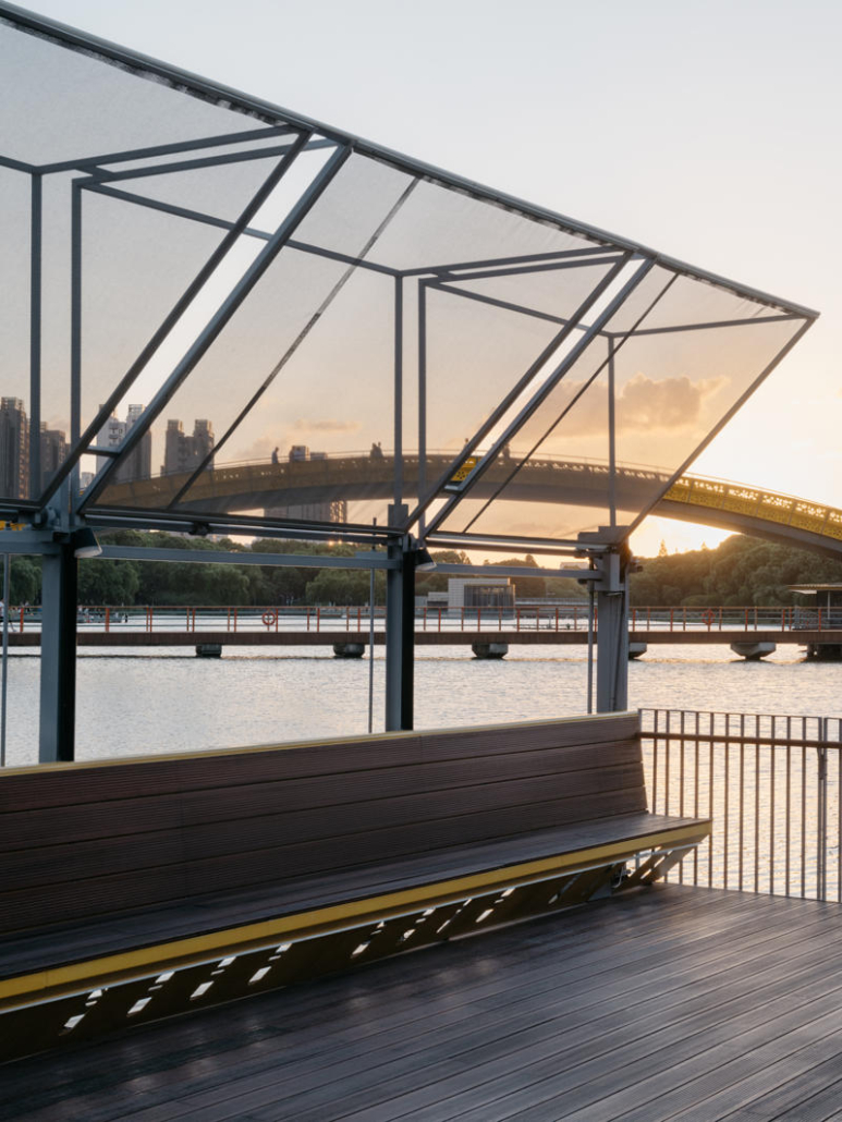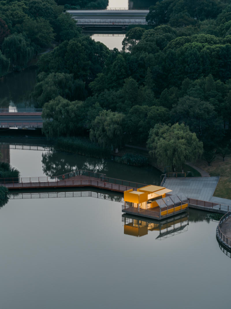 Bloom Box, Huqiao Kunshan’daki göl kıyısı platformunda, eskimiş ve uzun süredir kullanılmayan bir gölgelik yapısının yerine, hafif ve esnek bir müdahale ile tasarlanmış. Tasarımın amacı, bu göz ardı edilen alanı yeniden canlandırmak ve insanların durmak, beklemek ve vakit geçirmek isteyeceği “yaşayan” bir durak oluşturmak olarak aktarılıyor. Tasarımda, erken modernizmin “makine” yaklaşımı yerine; zaman, hava koşulları ve kullanıcı eylemlerine yanıt veren insan ve doğa odaklı bir mimari hedeflenmiş.