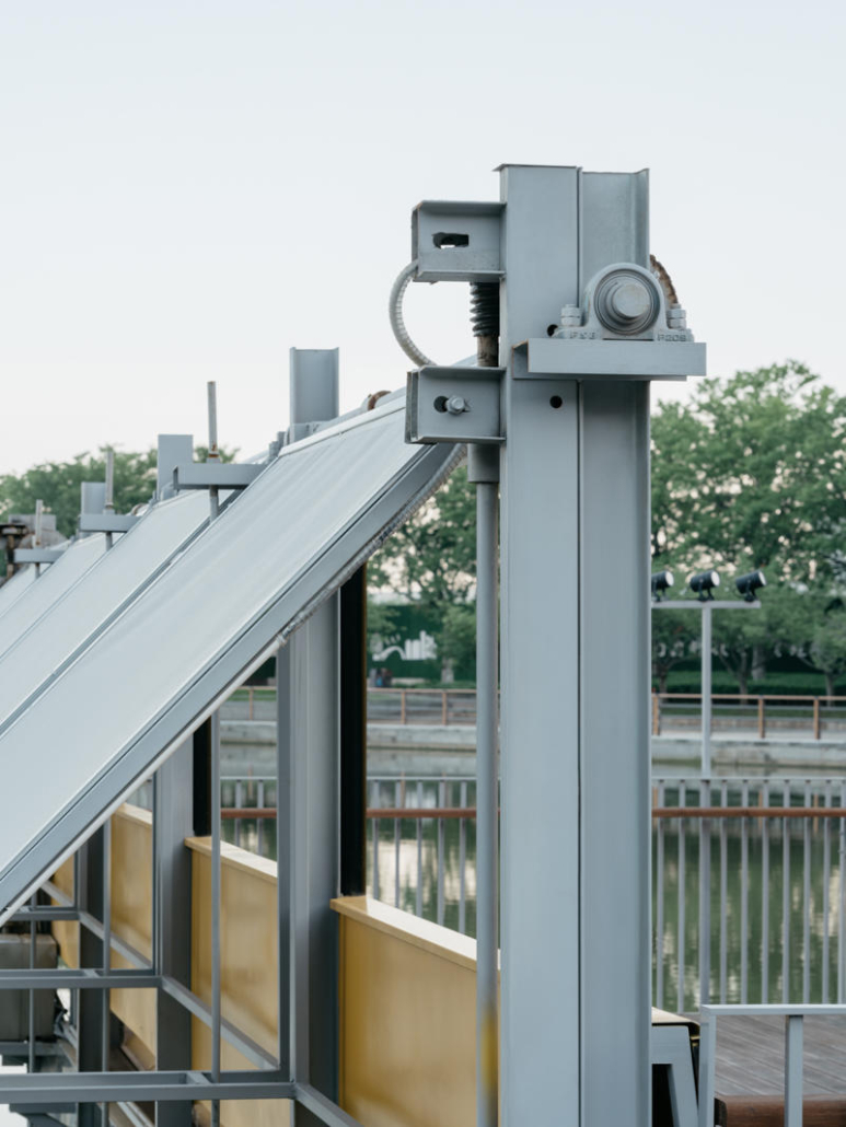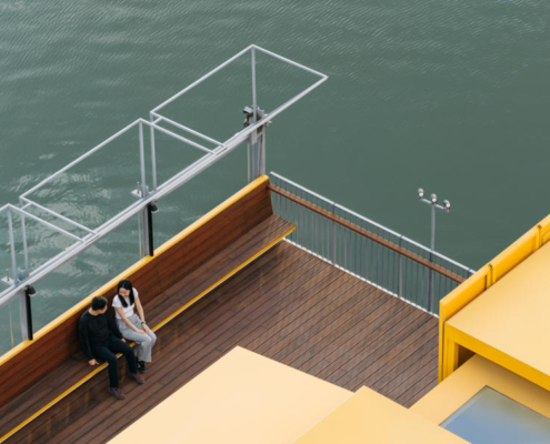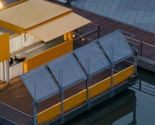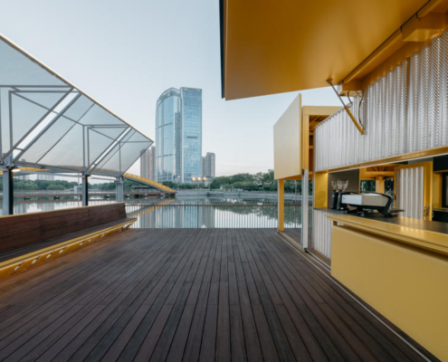 Hafif çelik taşıyıcı sistem, alüminyum paneller ve bambu yüzeylerden oluşan strüktür, mevcut platforma minimum müdahaleyle yerleştirilmiş. “Sabit iskelet ve dinamik kabuk” stratejisi, yapının farklı ışık koşulları, mevsim ve işletme senaryolarına sürekli adapte olmasını sağlarken uzun ömürlü ve sürdürülebilir bir mekansal çerçeve ortaya çıkarıyor. Bloom Box, yalnızca bir kahve ve çiçek satış birimi değil; yürüyüş sırasında karşılaşılan sıcak bir içecek deneyimi, su kenarında ebeveynler için bir oturma durağı, hafta sonu çiçek pazarının başlangıç noktası ya da küçük buluşmalar için samimi bir köşe oluyor.