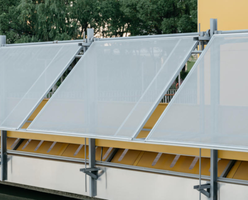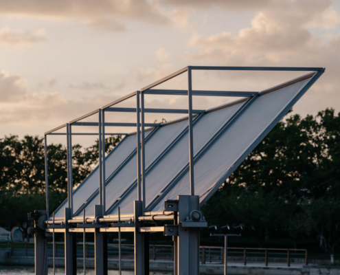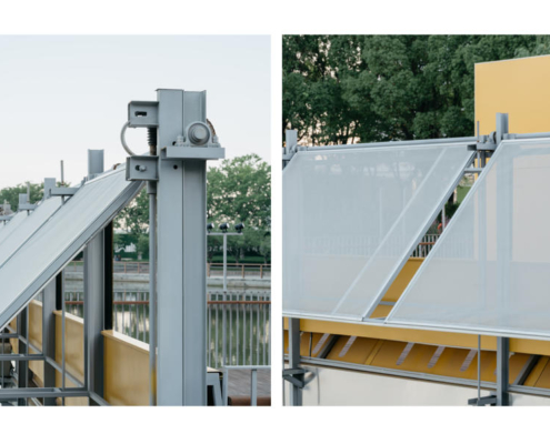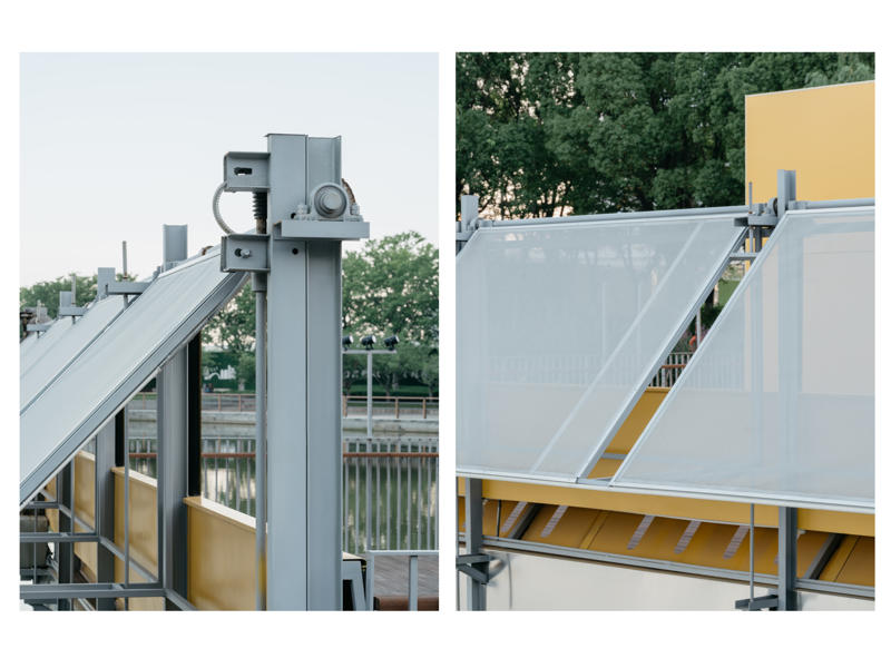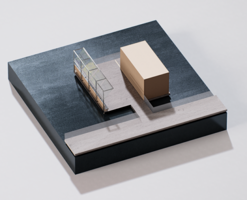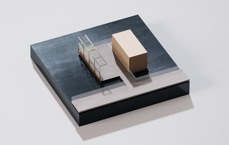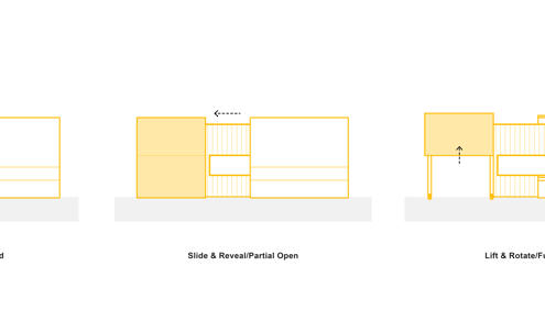 Tasarlanan yapının kutu formundaki hacminin kayarak, katlanarak ve yukarı açılarak çalışan hareketli cephe elemanları, yapı kullanımdaysa tamamen açılarak kentliye davetkar bir karakter sunarken, kullanım dışı kaldığında ise kompakt bir hacme geri dönüyor. Bu hareket, yapıyı kentsel ritmin bir parçası haline getiriyor. Katlanır kapılar, kayar paneller ve yarı geçirgen malzemelerle iç dış ilişkisi bulanıklaştırılmış böylece bir dizi “ara mekan” kurgulanmış. Bu alanlar gölge, geçirgenlik ve esneklik sağlayarak yapının farklı kullanım senaryolarına uyumunu artırmış.
