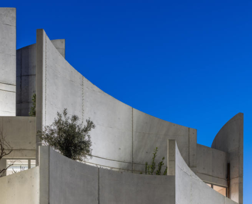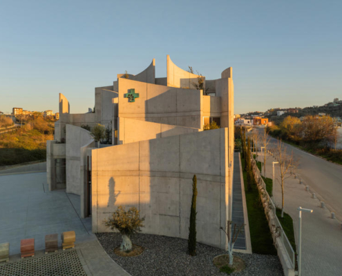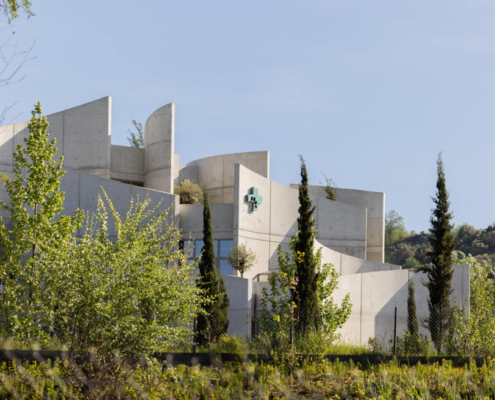 Davide Macullo Architects imzalı Tiran Veteriner Hastanesi, kıvrımlı beton kütlelerin peyzajla bütünleşen plan kurgusu içinde bir araya gelmesiyle tasarlanmış.