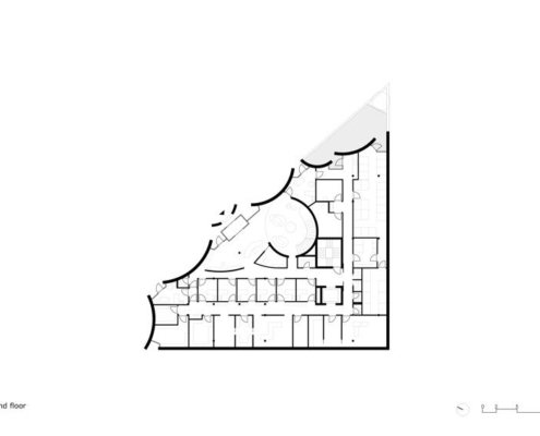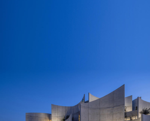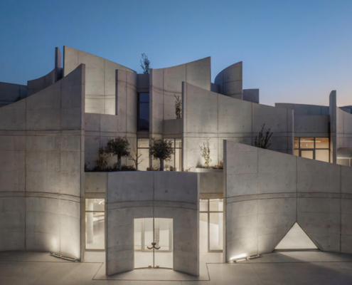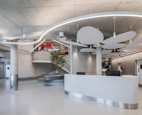 Bu felsefe, Tiran’daki Veteriner Hastanesi projesinde vücut buluyor. Tutku, heyecan ve vizyon fiziksel bir mekana dönüşüyor. Hastanenin yumuşak ve akışkan dış cephesi, planın yapısal mantığıyla karşıtlık kurarak hayranlık ve uyum duygusu yaratıyor. Mekan psikolojisi ve antropolojik ilkelerden beslenen basit geometriler, hareket ve yaşam dolu bir yere dönüşerek dinamik kıvrımlara evriliyor. Akışkan formlar, kapalı alanlara dair ilkel korkuları ortadan kaldırarak açık ve özgürleştirici bir ortam yaratıyor.