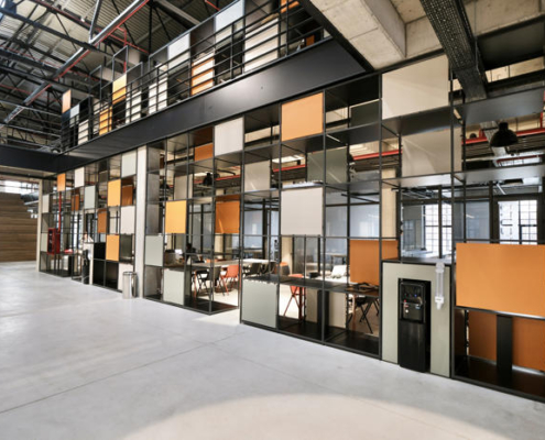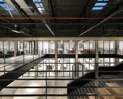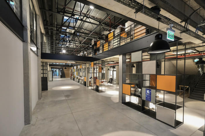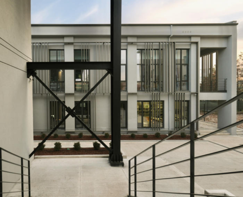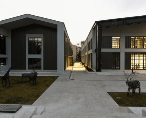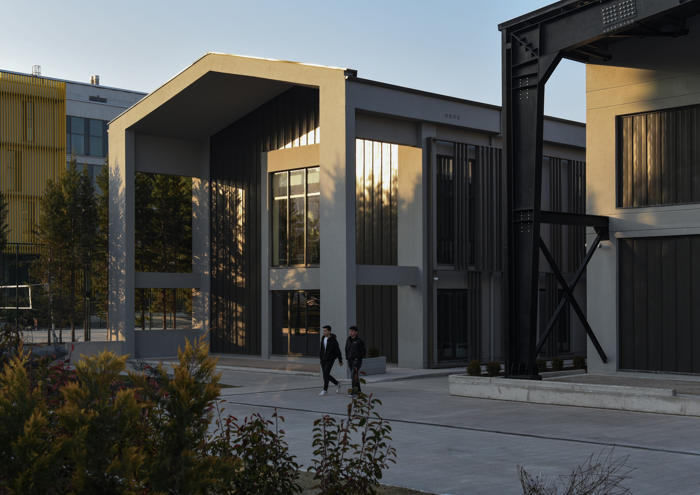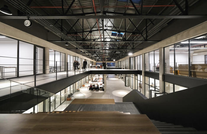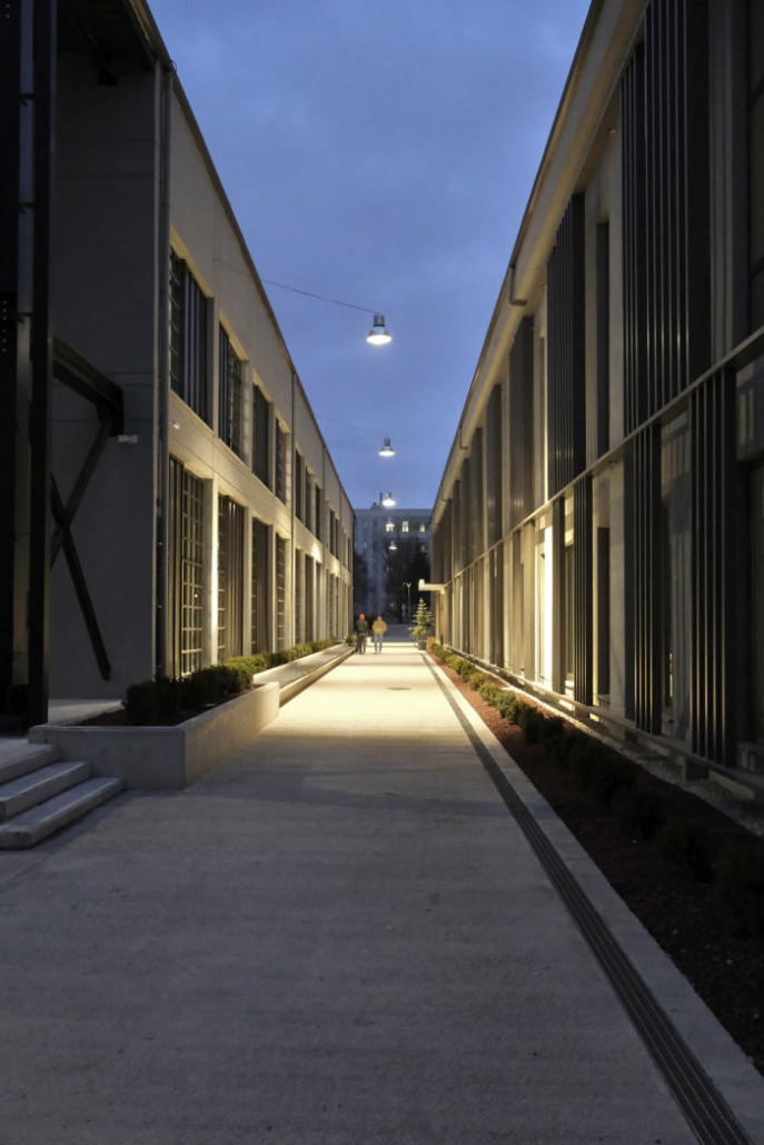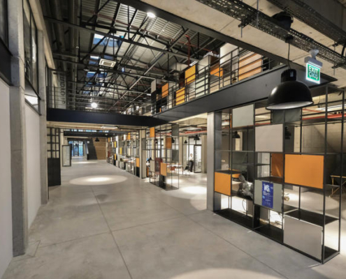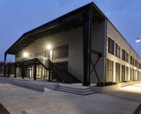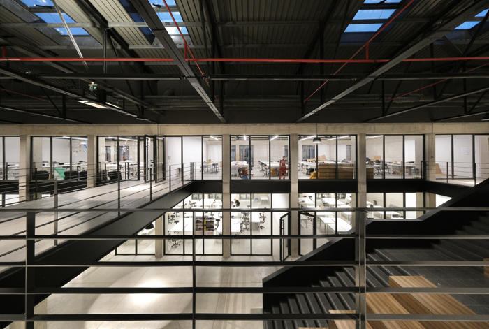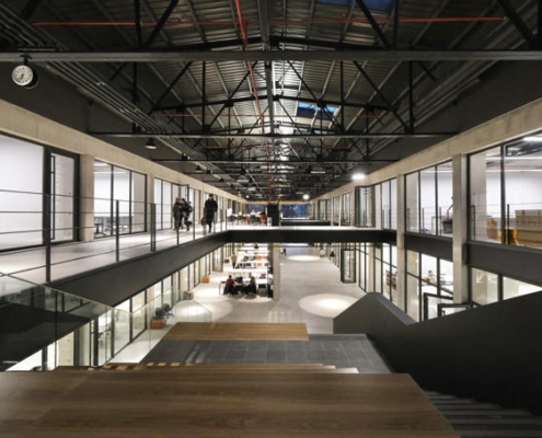 Açık Ortak Mekan ve Açık Amfi: Eğitim yapısının kavramsal ve mekânsal odağını oluşturan açık ortak alan, çeperlerde konumlanan stüdyoların ortasında bir sokak, avlu ya da galeri gibi işlerlik kazanıyor. Endüstriyel geçmişe referans veren bu alan, akademik ve sosyal yaşantıyı kesiştiren bir buluşma noktası. Zemin ve birinci katı birleştiren açık amfi ise kampüs içi dolaşımı binaya entegre ederken mekanın sürekliliğini destekliyor.