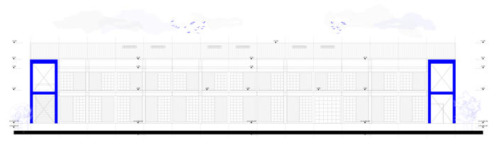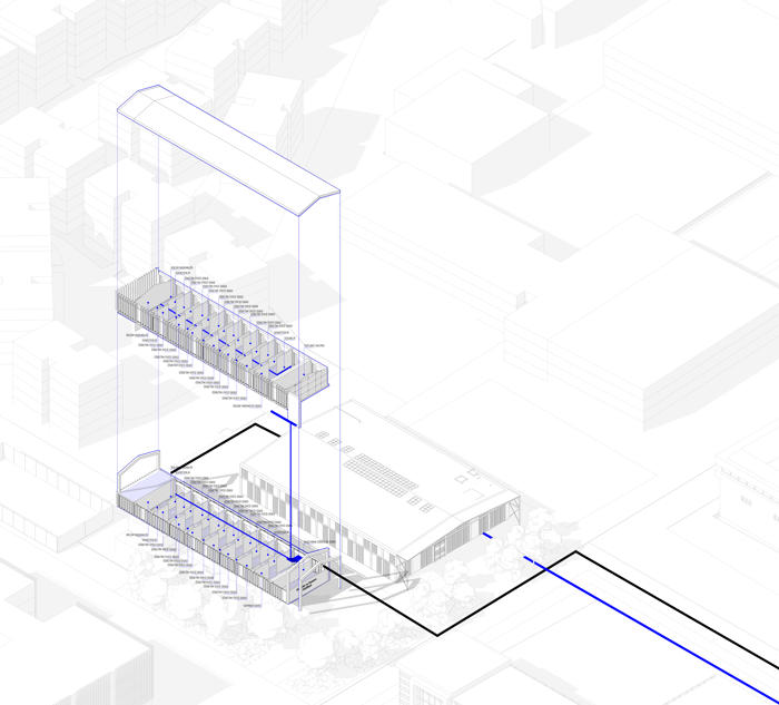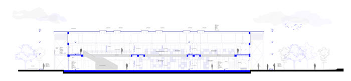 Açık Konstrüksiyon: Ortak açık mekanı bölen konstrüksiyon, sergi alanı, depolama birimi, mekanı strüktüre eden yapısal bir araç ve dolaşımı yönlendiren bir düzenleyici. Aynı zamanda öğrencilerin üretim süreçlerini görünür kılan bir vitrin görevi de üstleniyor ve öğrenme süreçlerinin kamusallaşmasına katkı sunuyor.