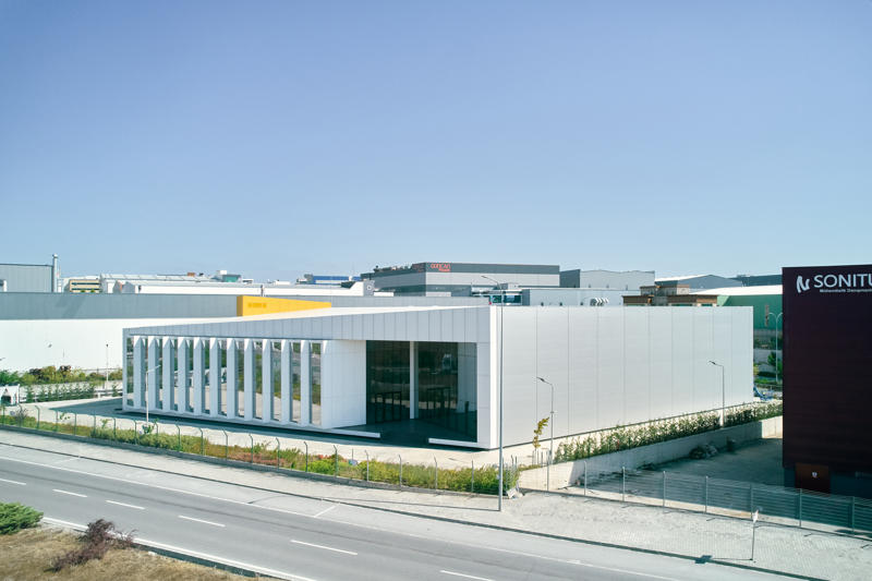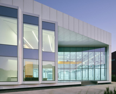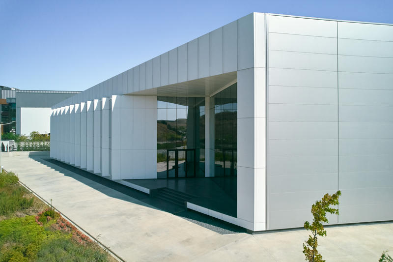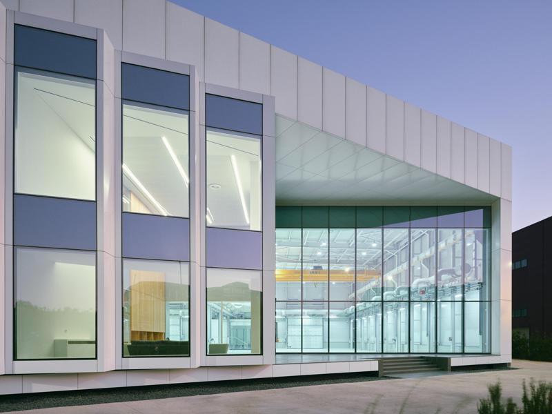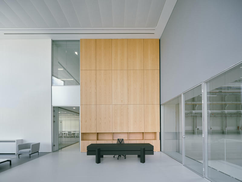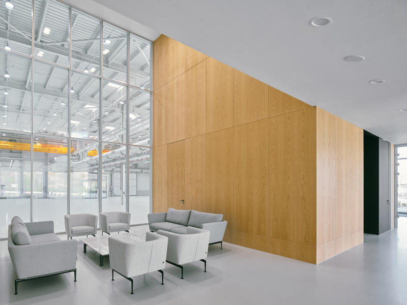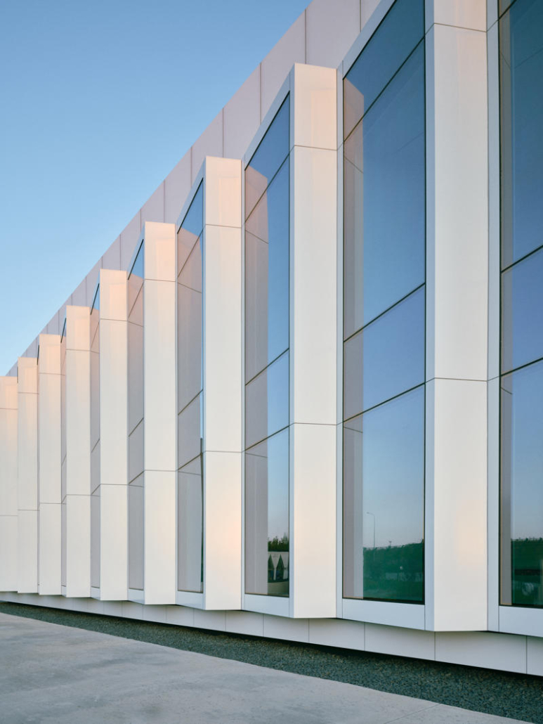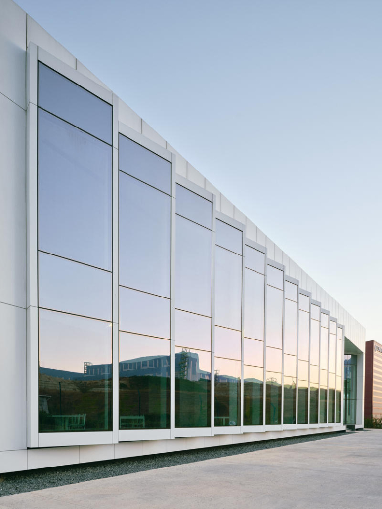Üçgen şeklindeki idari birimin dar köşesi yapının ana girişini ve odak noktasını tanımlıyor. Tamamen cam olarak tasarlanan üretim holünün cephesi giriş saçağının altına kadar yükseliyor. Bu sayede bina kullanıcıları ve diğer ziyaretçiler yapıyla karşılaştıkları ilk noktada üretim holünü görebiliyorlar. Kuzeye bakan cephe aynı zamanda üretim holünün gün boyu doğal ışık almasını ve çalışanların dışarıyı görebilmesini sağlıyor. İdari birimin testere cephesi ise akşamüstü batıdan gelen güneş ışığını keserken ofis alanlarının doğal ışıktan faydalanmasını mümkün hale getiriyor.