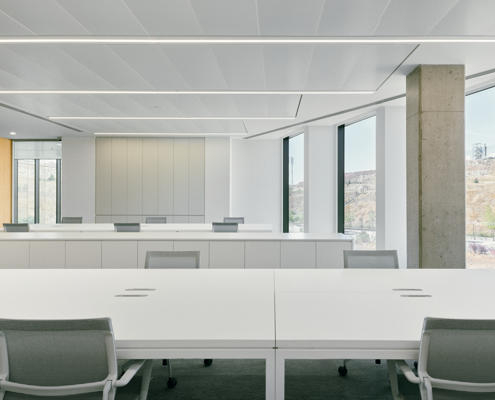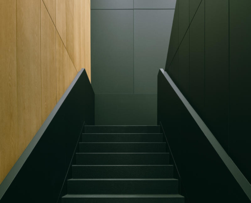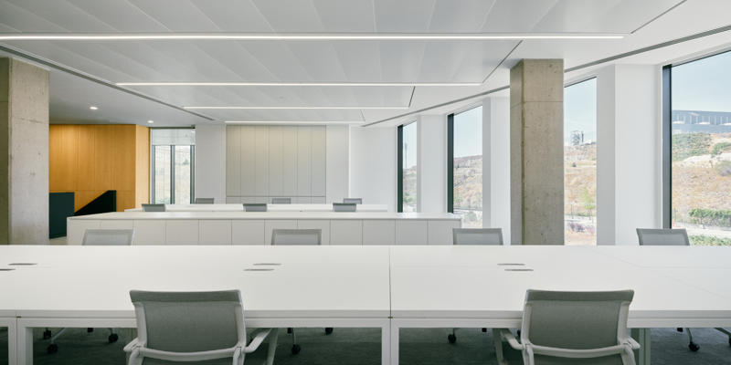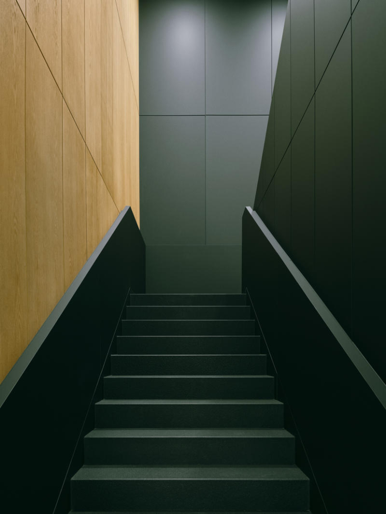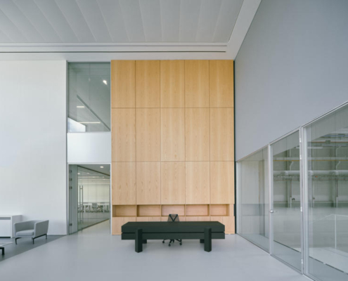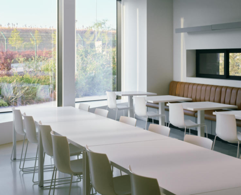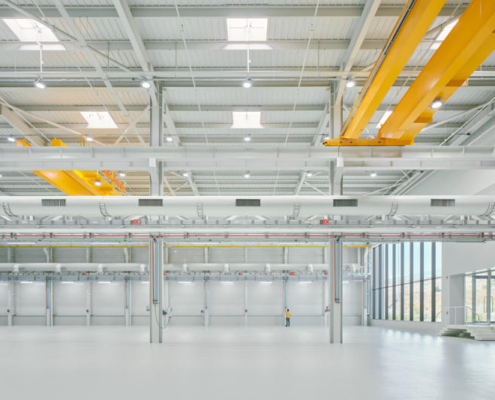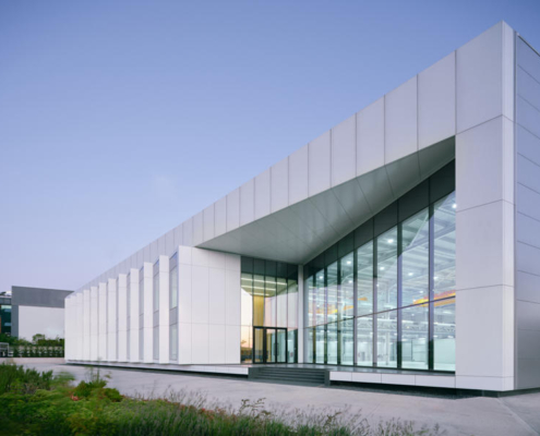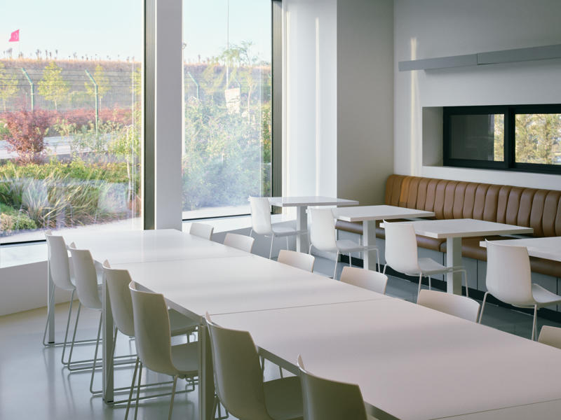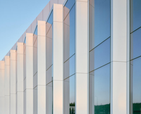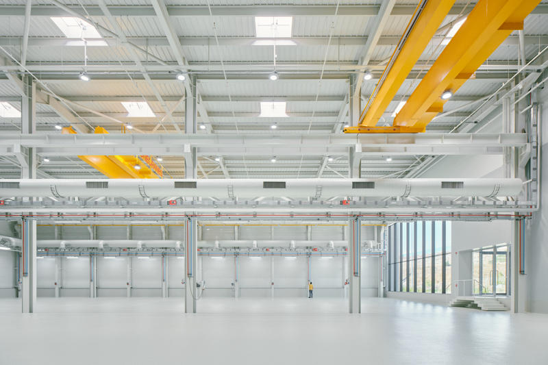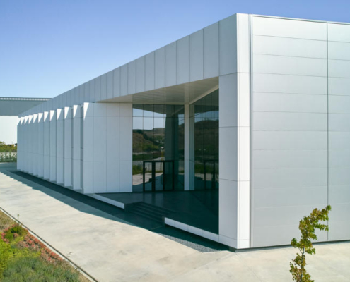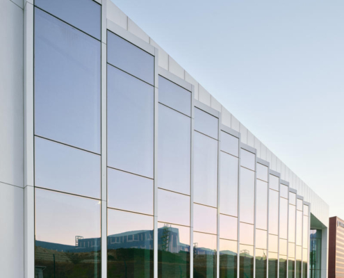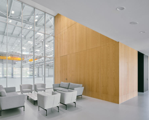 Üçgen şeklindeki idari birimin dar köşesi yapının ana girişini ve odak noktasını tanımlıyor. Tamamen cam olarak tasarlanan üretim holünün cephesi giriş saçağının altına kadar yükseliyor. Bu sayede bina kullanıcıları ve diğer ziyaretçiler yapıyla karşılaştıkları ilk noktada üretim holünü görebiliyorlar. Kuzeye bakan cephe aynı zamanda üretim holünün gün boyu doğal ışık almasını ve çalışanların dışarıyı görebilmesini sağlıyor. İdari birimin testere cephesi ise akşamüstü batıdan gelen güneş ışığını keserken ofis alanlarının doğal ışıktan faydalanmasını mümkün hale getiriyor.