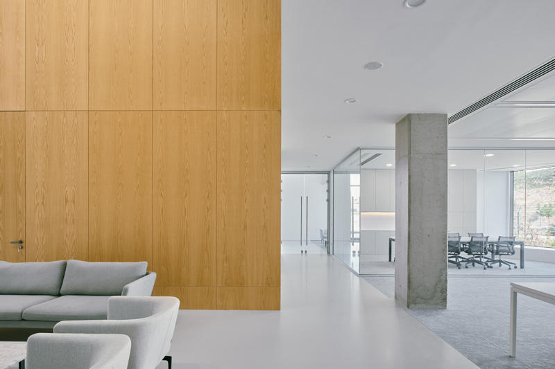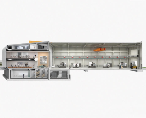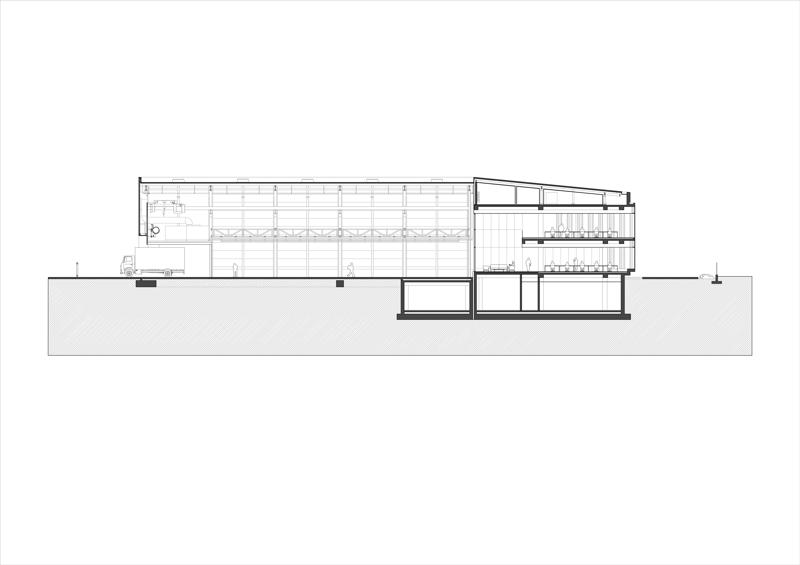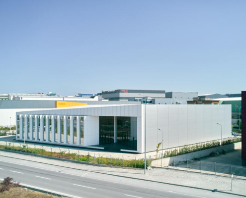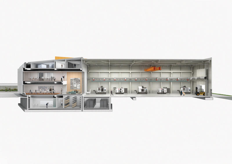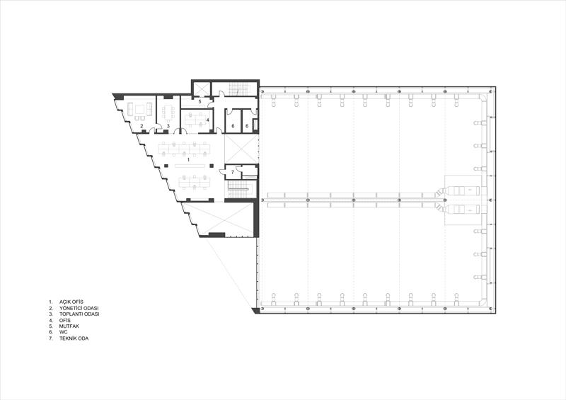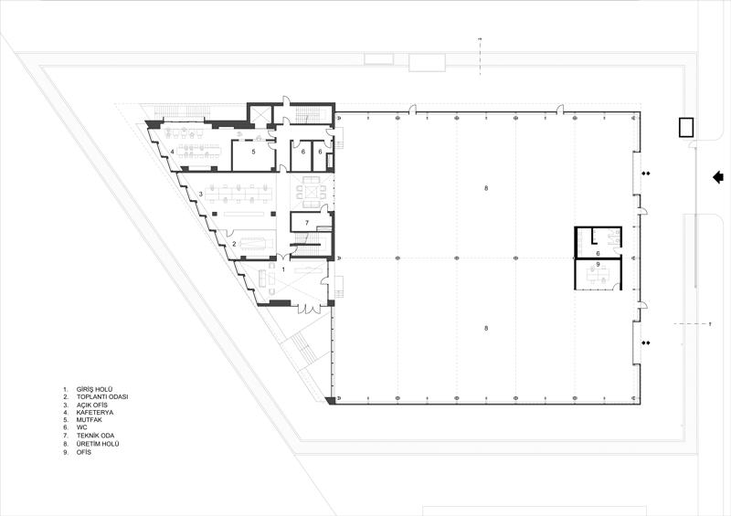 Tek bir kütle olarak ele alınan üretim bloğu ile idari blok, yapısal nedenlerle dilatasyonla ayrılmış iki farklı strüktür olarak tasarlanmış. Üretim holü tek katlı çelik bir yapı, idari blok çok katlı betonarme bir strüktür olarak tasarlanmış. İdari binanın bodrum katı teknik hacimleri, personel giyinme alanlarını ve depoları barındırırken üst katlar ofis alanı olarak düzenlenmiş. Zemin katta giriş holü ve açık ofislerle ilişkili oturma alanları, çift kat yüksekliğinde cam yüzeylerle üretime bakıyor. Bu görsel ilişkinin dışında idari blok üretime iki noktadan bağlnıyor. Giriş holüne ek olarak ofis bloğunun diğer ucundaki bir koridorla üretim alanı yapının tüm kullanıcılarının bir araya geldiği kafeteryaya bağlanıyor.