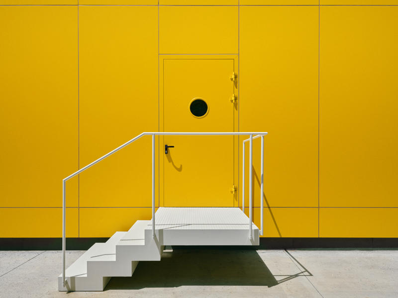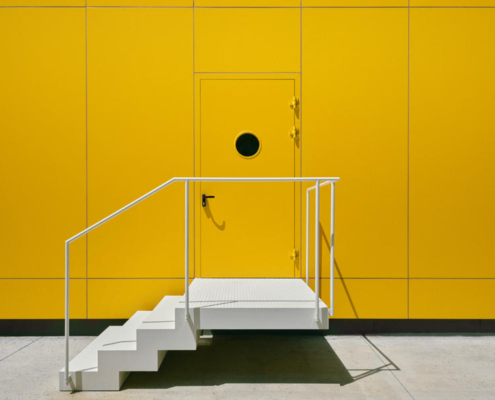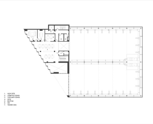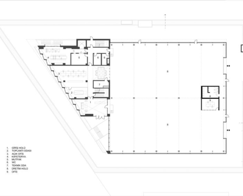 FIELDS tasarımı Üçgen CNC Fabrika ve Ofis, kısıtlı parsel koşullarına uyum sağlayan yerleşim kurgusu, üretim ve idari işlevleri tek bir kütlede bir araya getiren tasarım anlayışı, ışık kullanımı ve renk kodlarıyla öne çıkan bir endüstriyel yapı olarak tasarlanmış.