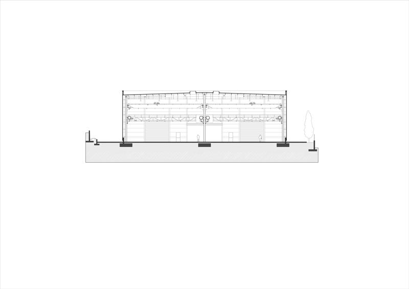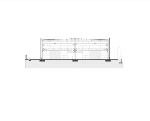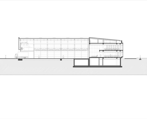 FIELDS tasarımı Üçgen CNC Fabrika ve Ofis projesi Dilovası’ndaki bir organize sanayi bölgesi (OSB) içerisinde yer alıyor. Proje alanının dik yamuk şekli ve araç girişinin tek cepheden olması vaziyet planı kararlarını ciddi anlamda sınırlandırmış. Dikdörtgen üretim holü OSB yolu cephesi tarafına konumlandırılmış. Parselin şeklinin dikte ettiği bu karar, üretim holüne en kısa yoldan araç girişi sağlamak konusunda avantaj sağlıyor. Çekme mesafeleri içerisinde üretim holünden geriye kalan alan idari birime ayrılmış. Üretim ve idari birimler iki farklı blok olarak ele alınmamış; yapı, ikisinin geometrik olarak bütünleştiği tek bir kütle olarak düşünülmüş.