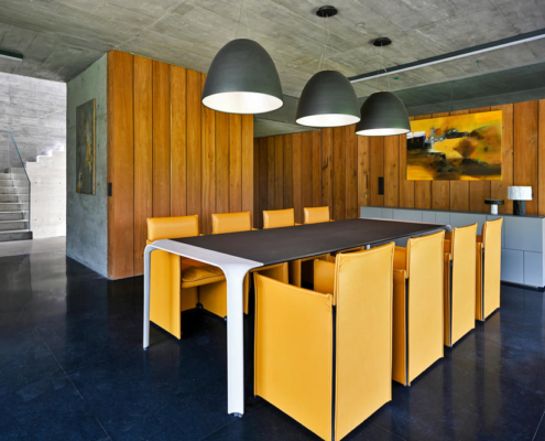 80 yıla yayılmış olan dört jenerasyonunun da kendi beklentileri ve özel hayatlarının gereklilikleri projede göz önünde bulundurulmuş. Sadece ziyaret için gelecek olan çocuklarının evi daha az kullanılan ikinci katta yer alırken, orta katta oğulları, eşi ve çocukları ile bakımlarından sorumlu oldukları ebeveynlerinin yaşam alanları bulunuyor. Evin asıl sahibi olan çift ise diğer köşede konumlanan alanda yaşıyor. Daireleri bir tarafta doğaya öbür tarafta ise avluya doğru açılan cömert açıklıklara sahip. Ortak aile alanları ise zemin katta; havuz ve çevresi, bahçe kenarındaki sofra, girişteki alet edevat alanı ve tüm evin yöneldiği geniş Hint mutfağı olarak düzenlenmiş. Mutfak ile sofra arasında yalnızca bir kapı yer alıyor.