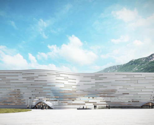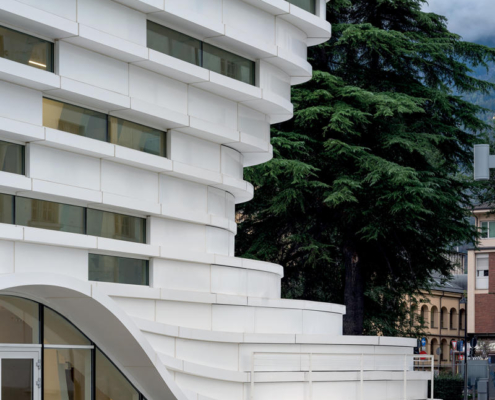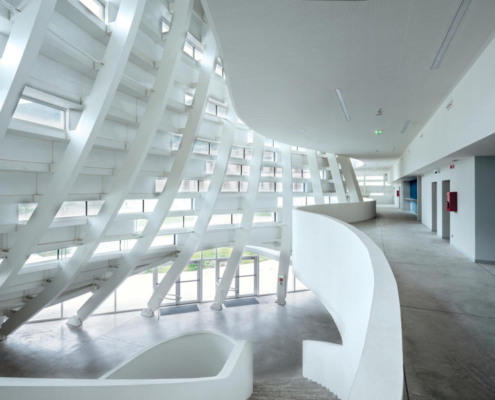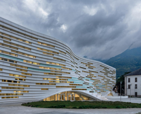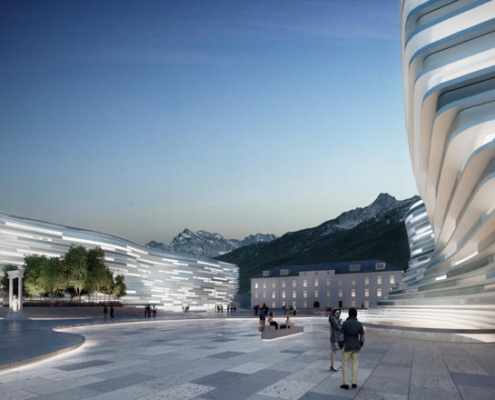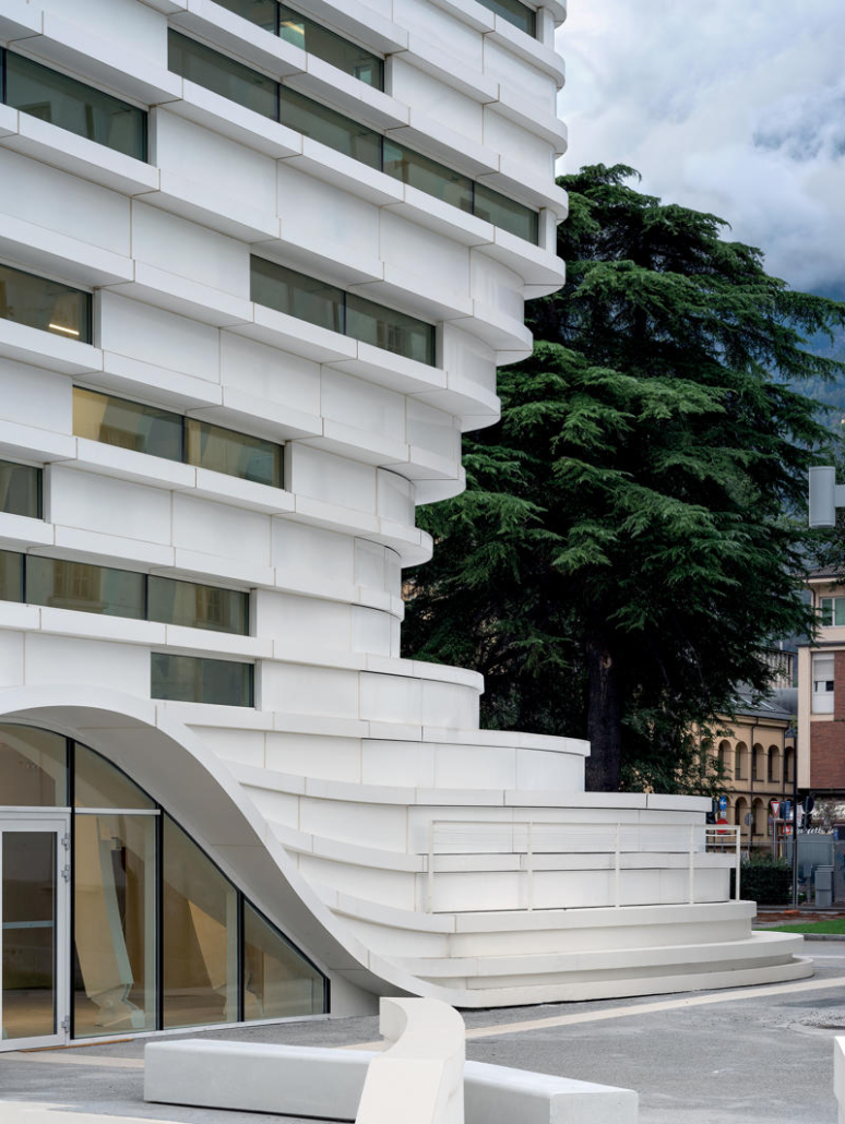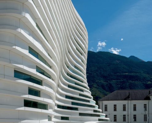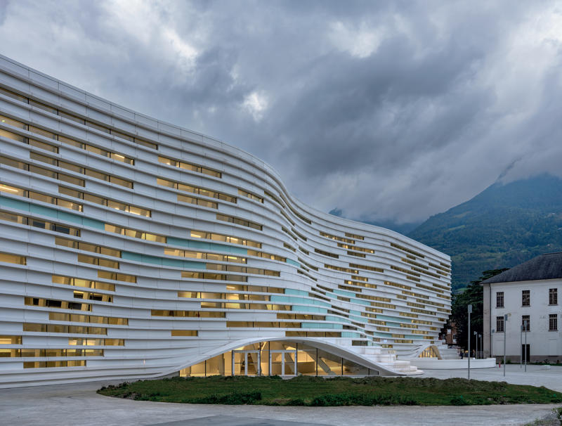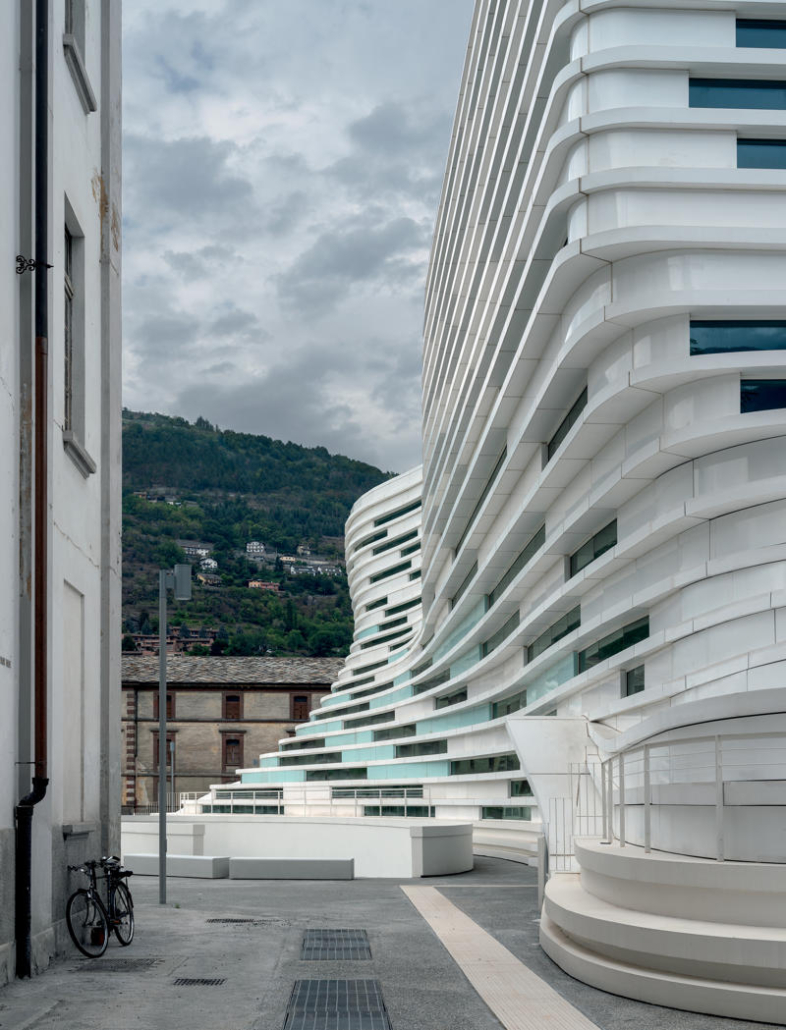 Aosta’daki yeni üniversite kampüsü, çağdaş mimarinin peyzaj ve iklimle nasıl uyum sağlayabileceğini gösteren bir örnek sunuyor. Projenin esin kaynağı olan “buzdağı,” salt biçimsel bir tercih değil, aynı zamanda bağlama güçlü bir gönderme içeriyor. Bir yandan renk ve biçimleriyle karlarla örtülü Alp manzarasına bağlanırken, diğer yandan üstün enerji performansı sağlayan bir form yaratıyor. Yeni bina, bitki organizmalarında gözlemlenen yapısal biçimlerden ilham alan ve işlevsel bağımsızlığa sahip bir organizasyon modeline göre tasarlanmış. Proje, iki katı yer altında olmak üzere toplam altı kattan oluşuyor.