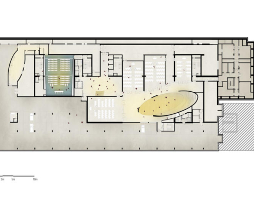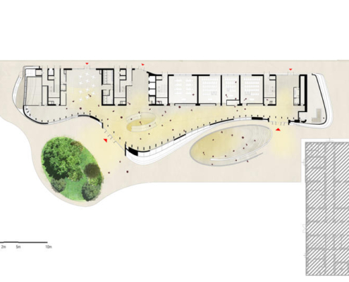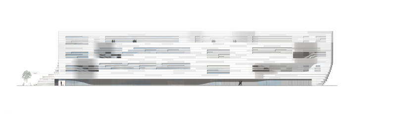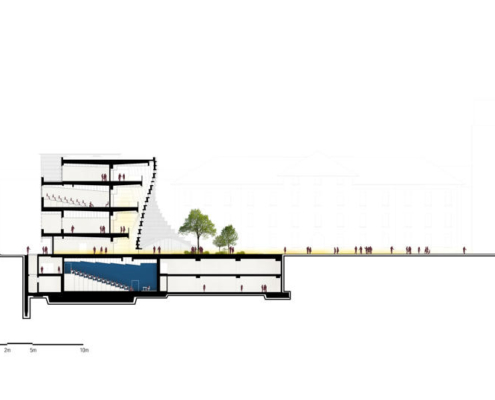 Öğretim alanlarına yakın cephelerde, üst katlara çıkıldıkça cephe yoğunluğu azaltılarak doğal ışığın geçişi optimize edilmiş. Cephenin geometrik özellikleri ve kullanılan malzemeler kat ve yönelimlere göre değişkenlik gösteriyor. Ana üniversite meydanına bakan cephe ise sıkıştırılarak biçimlendirilmiş ve böylece kentsel bir süsleme elemanına dönüşüyor. Kafeterya ve ana salon girişi zemin katta, binanın uç noktalarına yakın konumlandırılarak meydanla görsel ve fiziksel geçiş kolaylaştırılmış. Tüm yer üstü katlarında şehre bakan derslikler yer alıyor. Tesisat, servis galerileri ve bakım alanları ise bodrum katlarda toplanmış. 176 kişi kapasiteli ana salon ise -2. katta yer alıyor. Daha önce kapalı olan alanın kente açılması, sadece askeri geçmişin izlerini ortaya çıkarmakla kalmıyor, aynı zamanda kente yeni yaşam ve paylaşım alanları sunuyor.