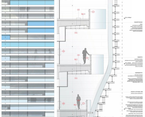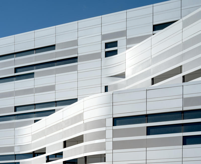 Binanın kentle ilişkisini ve tanınabilirliğini belirleyen en önemli öge cephe sistemi. Bu sistem, kente bakan yüzeyle meydana bakan yüzey arasında farklı biçimlerde ele alınmış. Meydana bakan cephede, sirkülasyon alanlarına bitişik olarak, metal şeritler ve Betacryl akrilik taşından yapılmış yatay kutulardan oluşan çerçeveli bir kabuk yaratılmış. Bu unsurlar, cam ve opak cephe bölümlerinin taşıyıcı yapısını oluştururken aynı zamanda etkili bir güneş kırıcı işlevi görüyor. Bina yapısı, geniş betonarme döşemelerin bir dizi duvar üzerine oturtulmasıyla tasarlanmış. Bu çözüm, destek elemanlarına ihtiyaç duymadan geniş alanlar yaratılmasını sağlarken dersliklerin yerleşiminde de avantaj sunuyor.