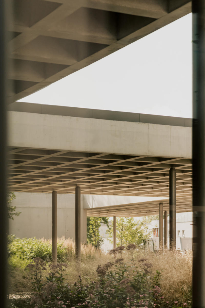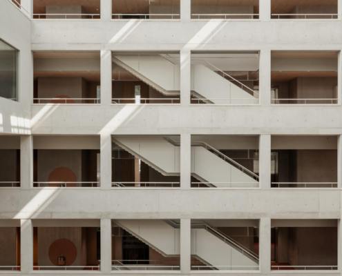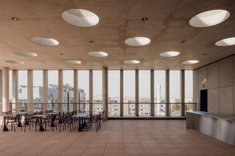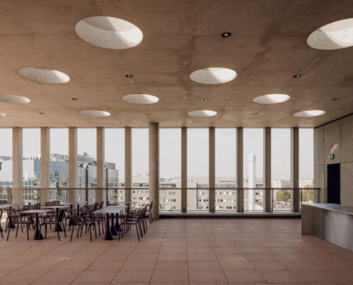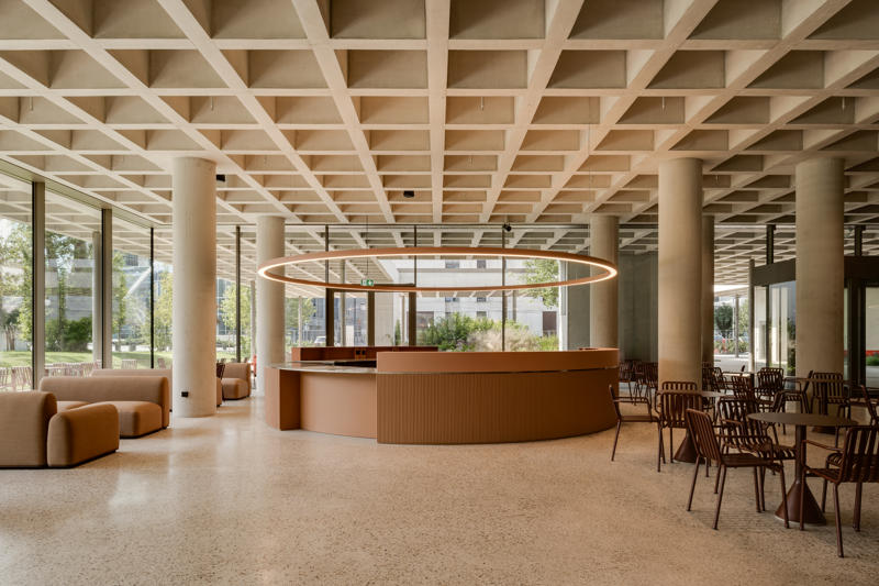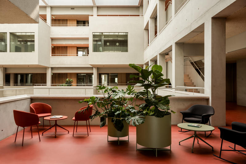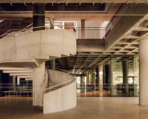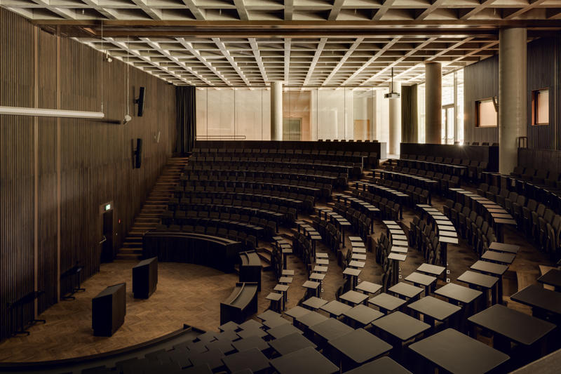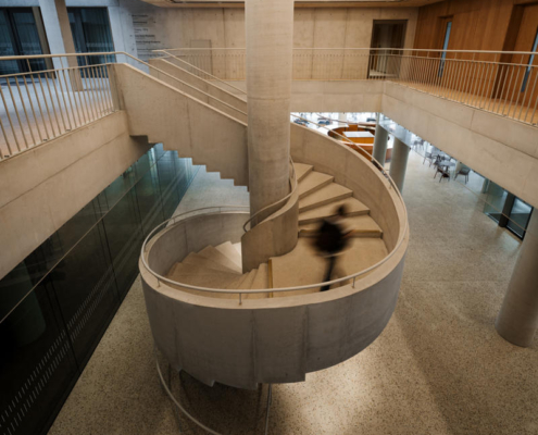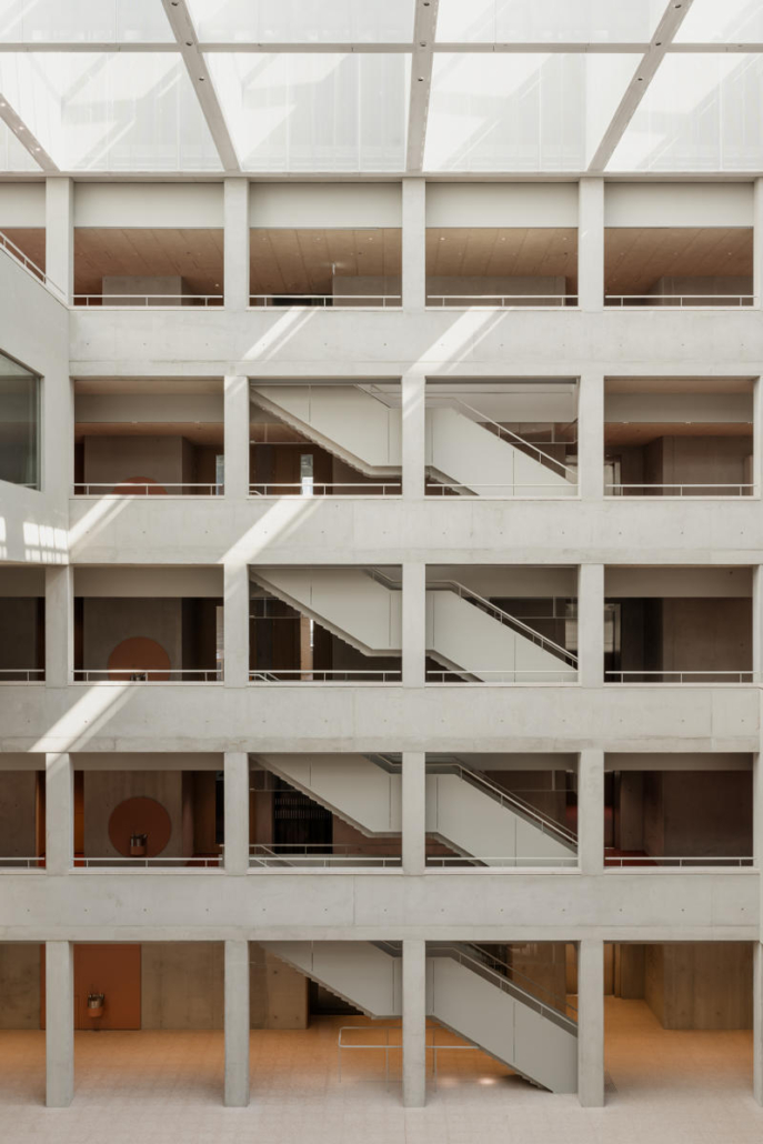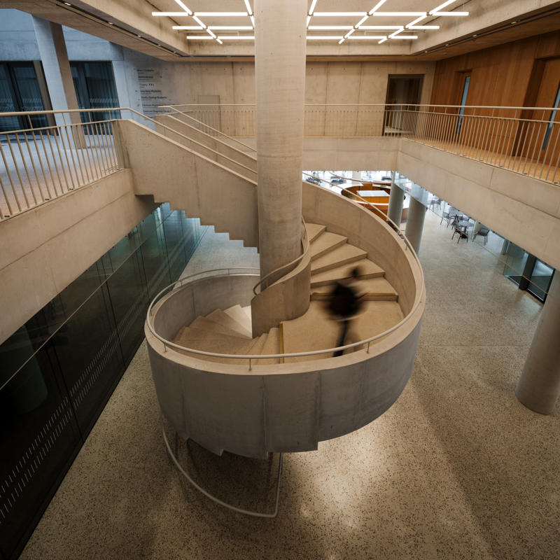İki ana bölge olan “halka açık” ve “fakülteye özel” bölgeler, heykelsi spiral merdivenlerle birbirine bağlanarak mekansal bir kontrpuan oluşturuyor. Biri şehre açılırken, diğeri içe dönük olup odaklanma ve işbirliğini teşvik ediyor. Projenin ana fikri, hem gerçek hem de sembolik anlamda açıklık yaratmak olmuş. Mimari; geniş cam yüzeyler, çerçeveli manzaralar, koridorlar yerine galeriler, çatı bahçeleri ve çok sayıda ortak alan ile ışığı ve insanları içeri davet ediyor. Mimarlar bu binayı ekolojik brutalist olarak tanımlıyorlar. Ham betonun dürüstlüğü ile çevre dostu çözümlerin ve mimariye entegre edilmiş bol yeşilliklerin birleşimi olarak betimliyorlar. Büyük ölçekli alanları şekillendirme kapasitesi ve uzun vadeli dayanıklılığı nedeniyle seçilen beton, yapısal elemanlarda, cephelerde ve iç mekanlarda kullanıldı. Gereksiz kaplama katmanları olmadan, ham ve etkileyici haliyle ortaya çıkıyor. Bu malzeme tutarlılığı; betonun pürüzlülüğünün, ahşabın sıcaklığı, doğal ışık, yeşillik ve ince renk vurguları ile tamamlandığı sakin ve uyumlu bir kompozisyonun yaratılmasını sağlıyor.
