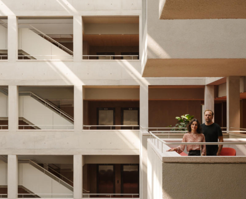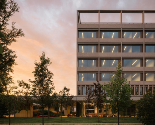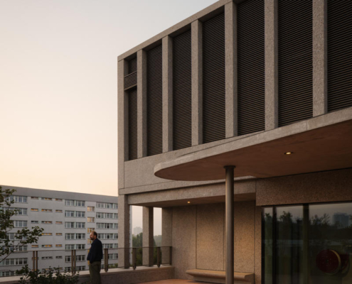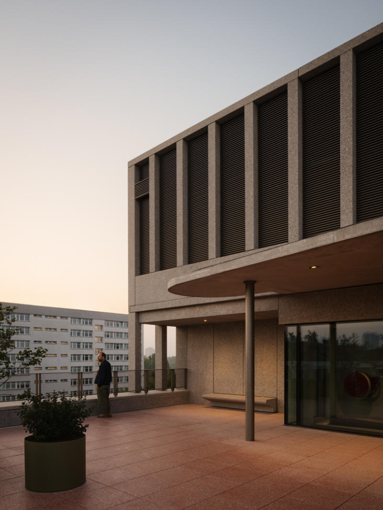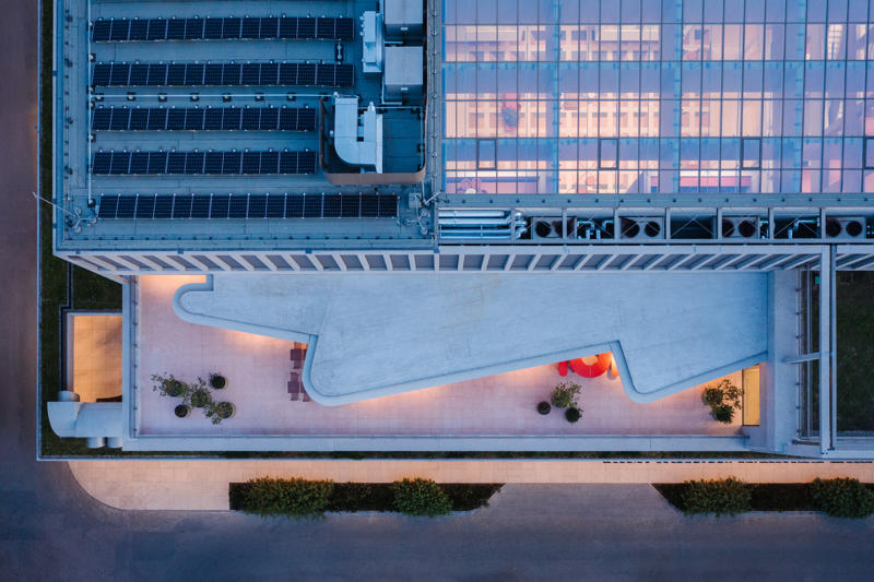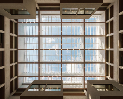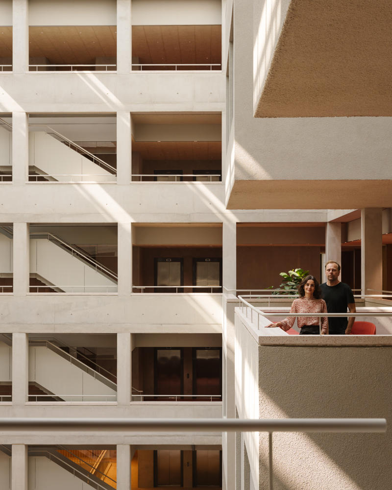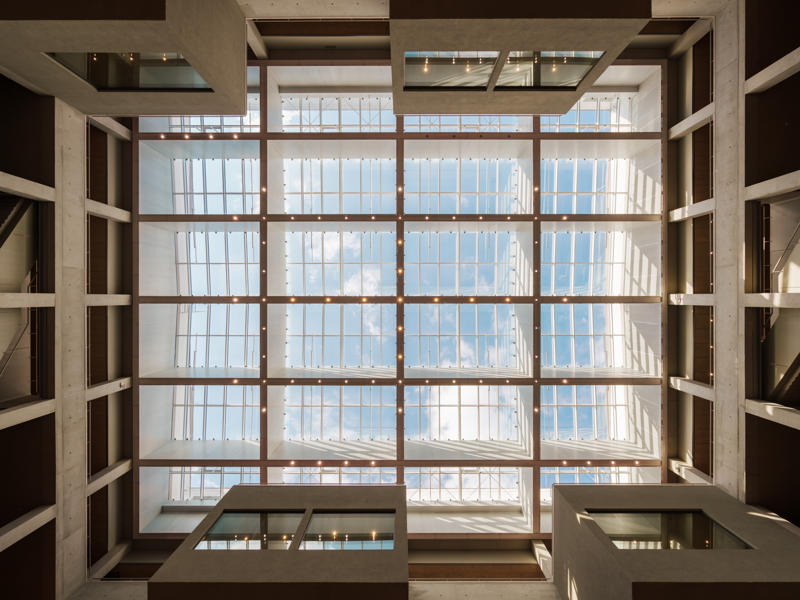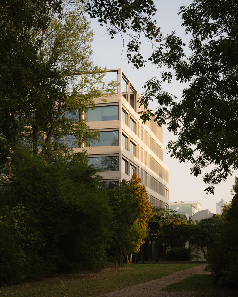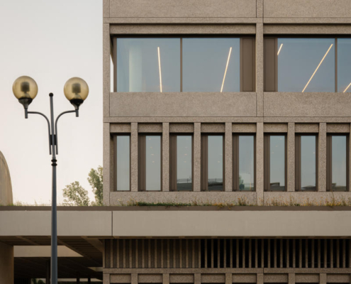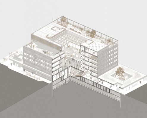 İki ana bölge olan “halka açık” ve “fakülteye özel” bölgeler, heykelsi spiral merdivenlerle birbirine bağlanarak mekansal bir kontrpuan oluşturuyor. Biri şehre açılırken, diğeri içe dönük olup odaklanma ve işbirliğini teşvik ediyor. Projenin ana fikri, hem gerçek hem de sembolik anlamda açıklık yaratmak olmuş. Mimari; geniş cam yüzeyler, çerçeveli manzaralar, koridorlar yerine galeriler, çatı bahçeleri ve çok sayıda ortak alan ile ışığı ve insanları içeri davet ediyor. Mimarlar bu binayı ekolojik brutalist olarak tanımlıyorlar. Ham betonun dürüstlüğü ile çevre dostu çözümlerin ve mimariye entegre edilmiş bol yeşilliklerin birleşimi olarak betimliyorlar. Büyük ölçekli alanları şekillendirme kapasitesi ve uzun vadeli dayanıklılığı nedeniyle seçilen beton, yapısal elemanlarda, cephelerde ve iç mekanlarda kullanıldı. Gereksiz kaplama katmanları olmadan, ham ve etkileyici haliyle ortaya çıkıyor. Bu malzeme tutarlılığı; betonun pürüzlülüğünün, ahşabın sıcaklığı, doğal ışık, yeşillik ve ince renk vurguları ile tamamlandığı sakin ve uyumlu bir kompozisyonun yaratılmasını sağlıyor.
