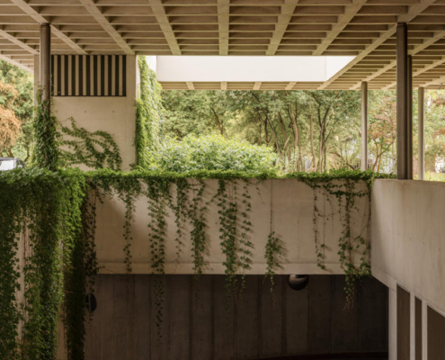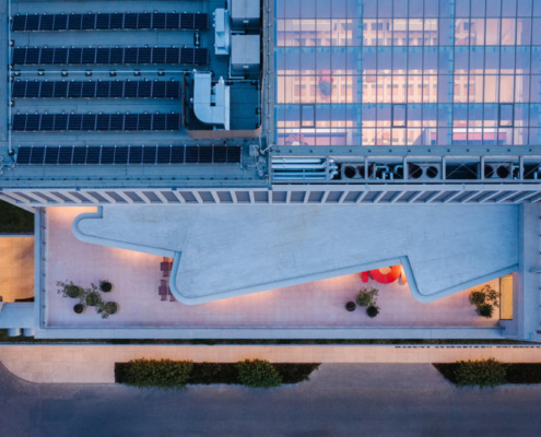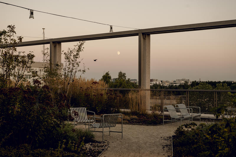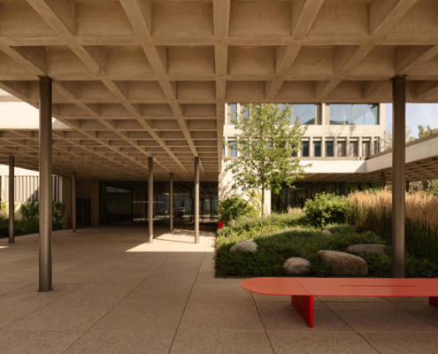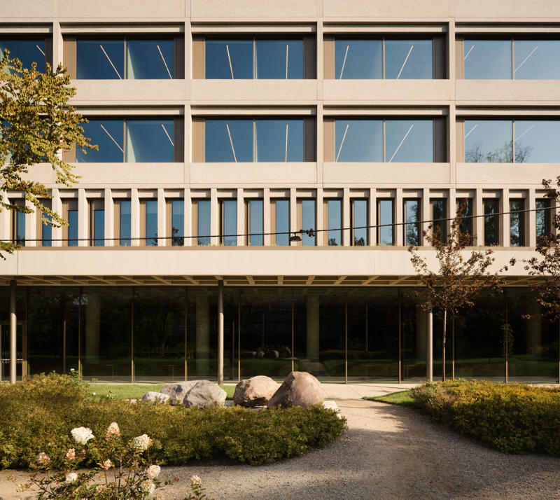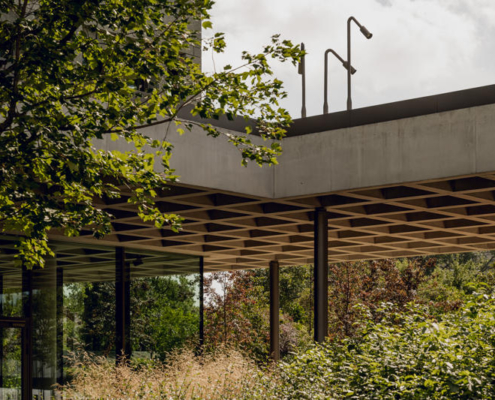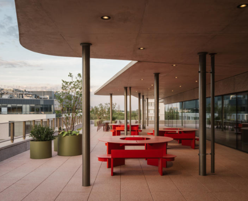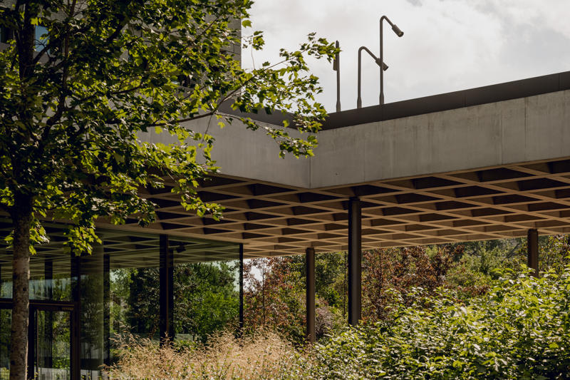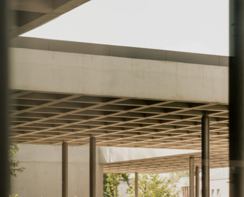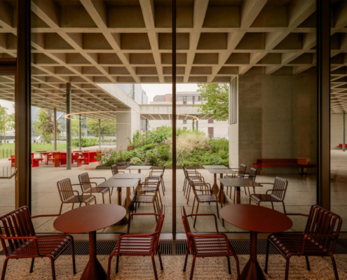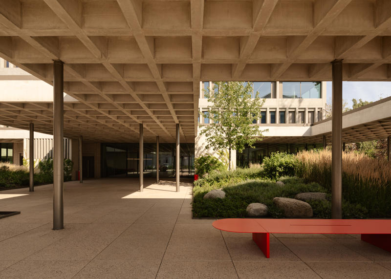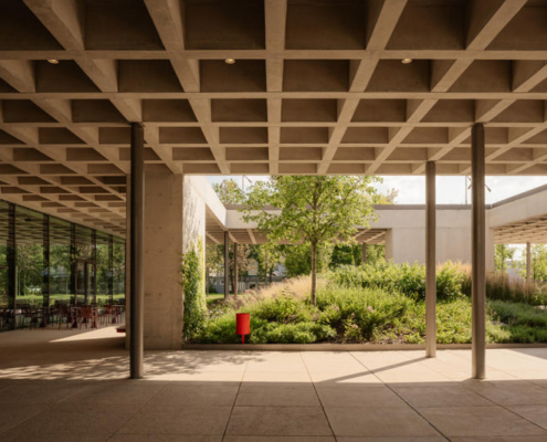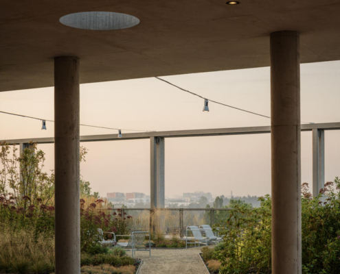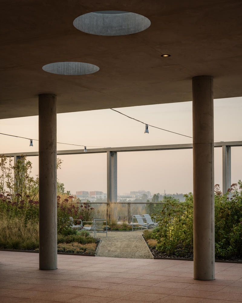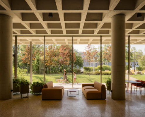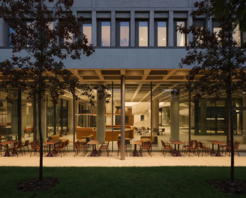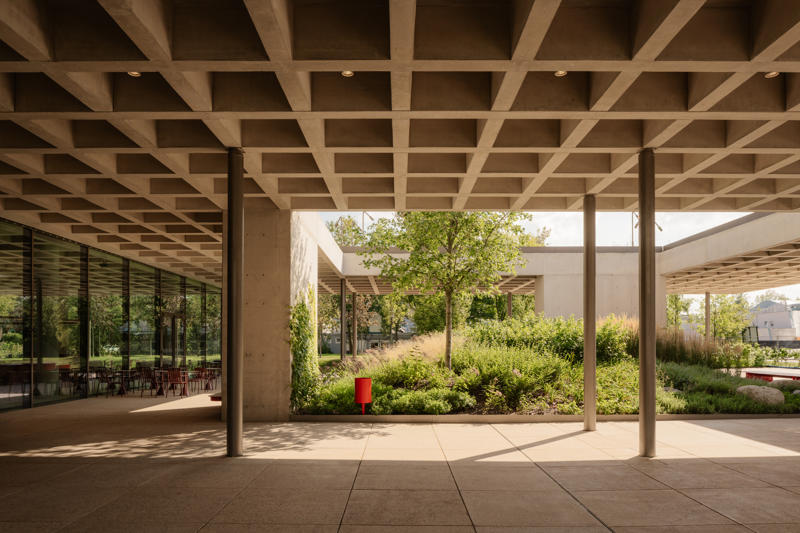 “Üniversite sadece öğrenim yeri değildir; aynı zamanda kampüsün ve mahallenin bir parçasıdır, günlük yaşamın gerçekleştiği yerdir. Psikoloji Fakültesi binasını tasarlarken, bu yaşamın aktif bir parçası olmasını istedik. Bu nedenle, binanın çevresindeki ve içindeki kamusal alanlara büyük önem verdik,” diye açıklıyor Projekt Praga’dan Karolina Tunajek ve Marcin Garbacki. Yeni binanın en belirgin özelliklerinden birini, zemin katın tamamını kaplayan beton kasetli kanopi oluşturuyor. Hem içeriden hem de dışarıdan görülebilen bu kanopi, binayı çevresiyle bütünleştiren bir mimari motif oluşturuyor. Kanopinin altında yeşilliklerle, oturma alanları, toplantı alanları ve bisiklet park yerleriyle dolu bir kamusal alan bulunuyor. Bu alan, günün her saatinde kullanılabilen, güneşten ve yağmurdan korunan, samimi ve korunaklı bir ortam oluşmasını sağlıyor. Bu açık alan sadece öğrenciler ve personel tarafından değil, Ochota sakinleri ve kampüs kullanıcıları tarafından da kullanılabiliyor ve fakülte çevresiyle günlük etkileşimi doğal bir şekilde teşvik ediyor.