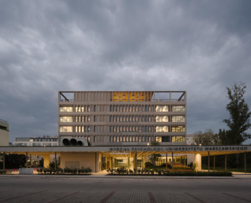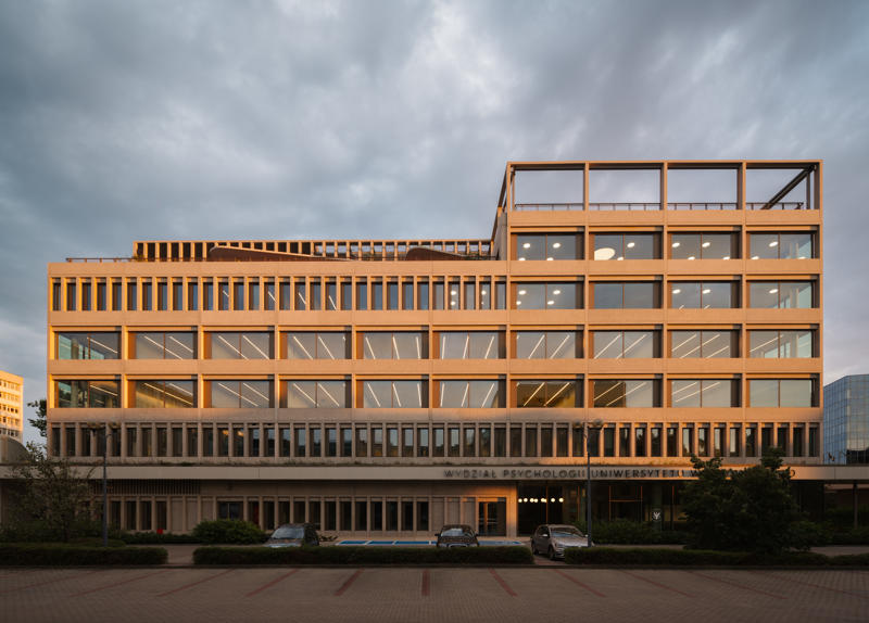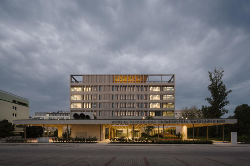 Projekt Praga imzalı Varşova Üniversitesi Psikoloji Fakültesi binası, kamusal alanlarla akademik mekanları iç içe geçirerek üniversite, kullanıcılar ve şehir arasında açıklık, etkileşim ve sürdürülebilirlik üzerinden kurulan yeni bir yaklaşımla tasarlanmış.