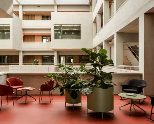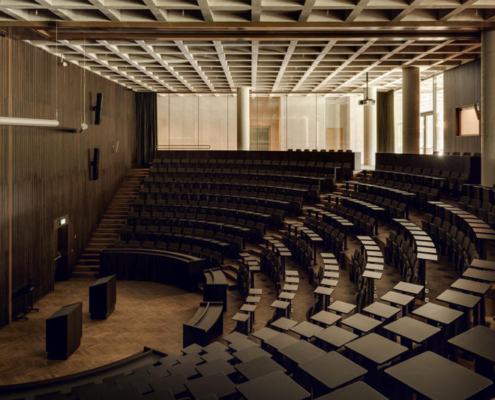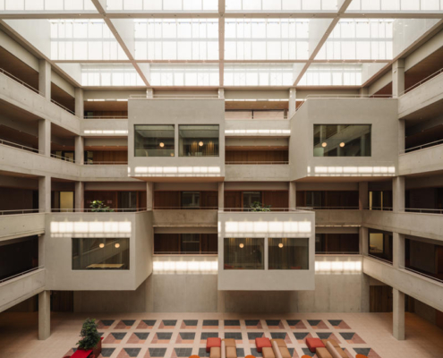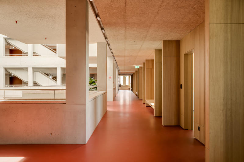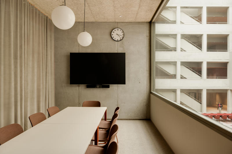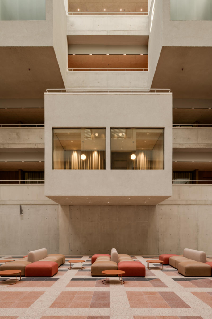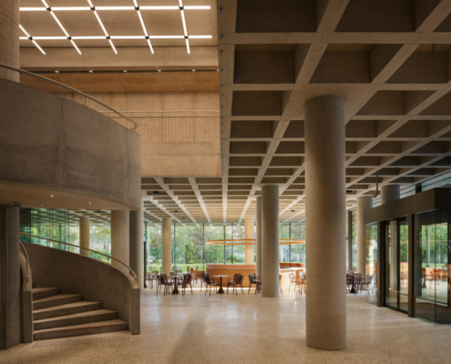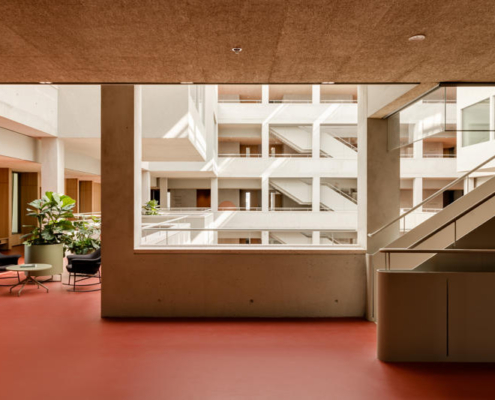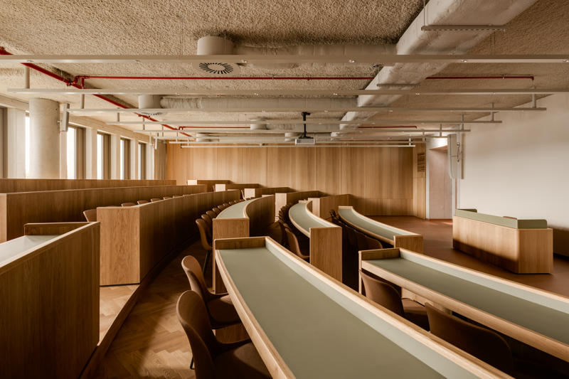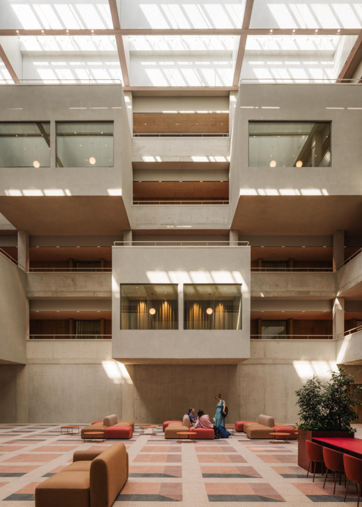 Dış cephe sade ve ölçülü olsa da, iç mekan şaşırtıcı bir mekansal zenginlik sunuyor. Ritmik ve disiplinli cephenin arkasında, çeşitli ölçek ve atmosferler sunan çok çeşitli odalar ve bir dizi ortak alan bulunuyor; açık avludan farklı boyutlardaki konferans salonlarına, çalışma ve dinlenme için samimi köşelere kadar çeşitleniyor. Amaç; çağdaş eğitimin ihtiyaçlarını karşılayan, hem bireysel konforu hem de işbirliğini destekleyen ve topluluk duygusunu besleyen samimi ve çeşitlilik içeren bir ortam yaratmak olmuş.