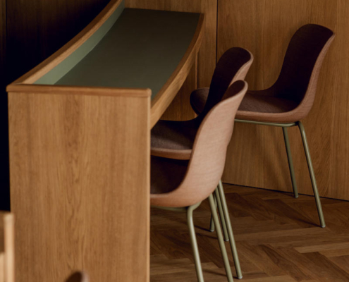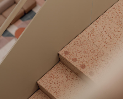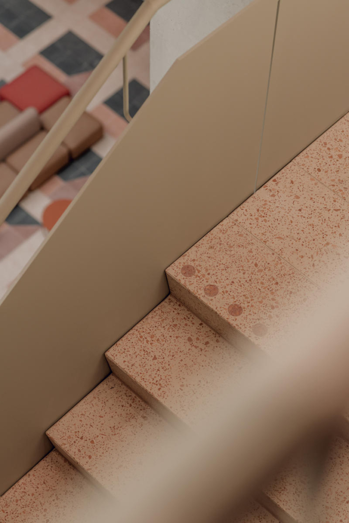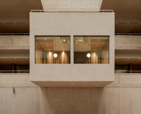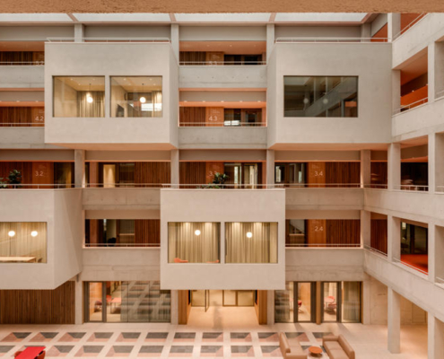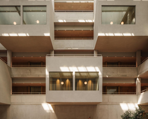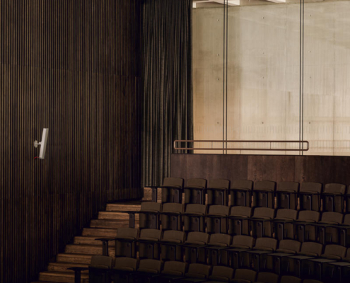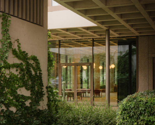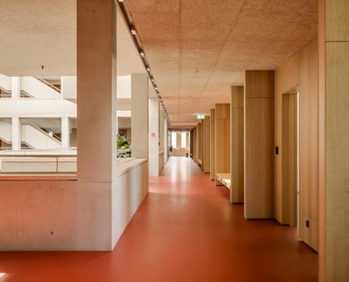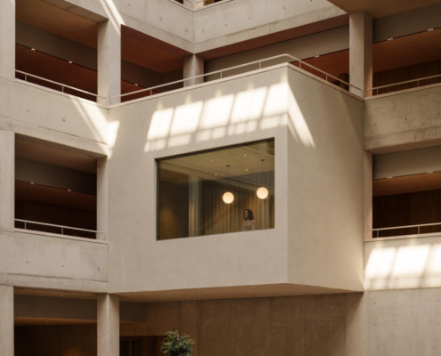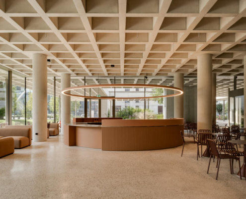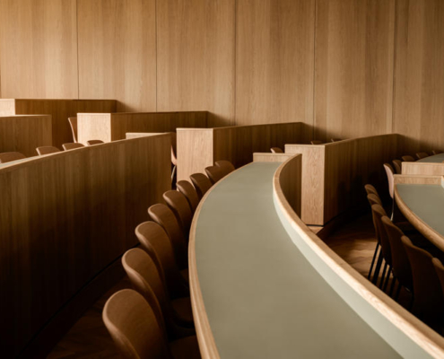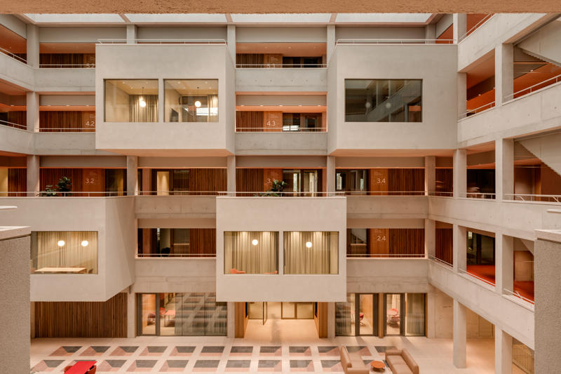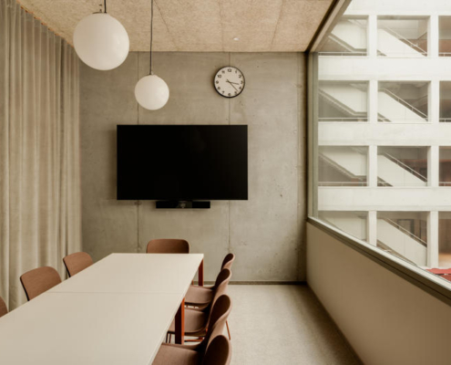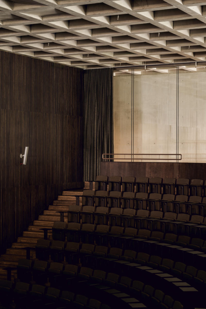 Dış cephe sade ve ölçülü olsa da, iç mekan şaşırtıcı bir mekansal zenginlik sunuyor. Ritmik ve disiplinli cephenin arkasında, çeşitli ölçek ve atmosferler sunan çok çeşitli odalar ve bir dizi ortak alan bulunuyor; açık avludan farklı boyutlardaki konferans salonlarına, çalışma ve dinlenme için samimi köşelere kadar çeşitleniyor. Amaç; çağdaş eğitimin ihtiyaçlarını karşılayan, hem bireysel konforu hem de işbirliğini destekleyen ve topluluk duygusunu besleyen samimi ve çeşitlilik içeren bir ortam yaratmak olmuş.