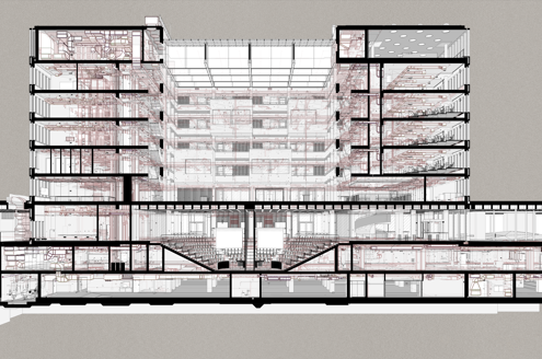 İç mekanda, en önemli mekansal yenilik iki zemin kat yaratılmasıyla oluşuyor. İlk zemin katı; geniş salonlar, bir kantin, bir kafe ve camla kaplı bir oditoryumdan oluşan bir kamusal alan oluşturuyor. Bu kat aynı zamanda fakültenin “açık oturma odası” olarak geçiyor. Bu alanlar, fakültenin faaliyetlerinden bağımsız olarak işlev görebiliyor ve dersler bittikten sonra da binanın aktif kalmasını sağlıyor. Bir kat yukarıdaki ikinci zemin kat, öğretim üyeleri için tasarlanmış geniş bir avluya açılıyor. Camdan yapılmış çatı, iç mekanın doğal ışıkla aydınlanmasına olanak sağlıyor. Geleneksel koridorlar yerine dersliklere, laboratuvarlara, çalışma ve ders çalışma alanlarına aynı zamanda terasa erişimi olan iki katlı bir kütüphaneye açılan açık galerilere yer veriliyor. Bunların arasında, bireysel çalışma ve dinlenme için çok sayıda niş, spontane karşılaşmalara teşvik sağlanıyor.