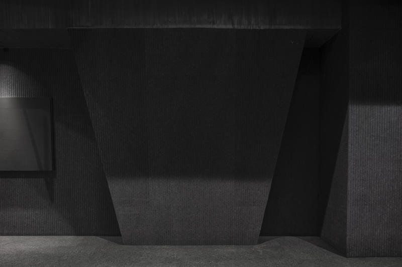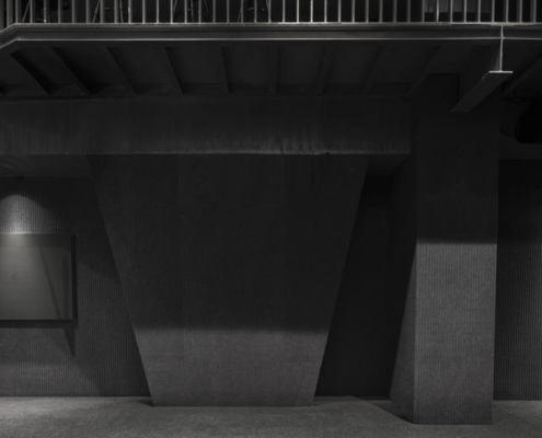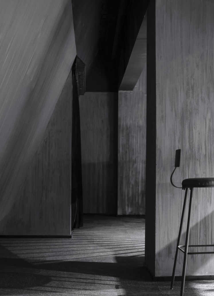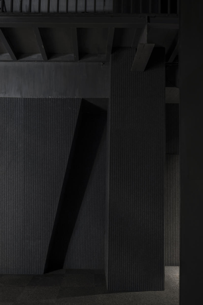 Özel olarak tasarlanan sahne, geleneksel tiyatro düzenlerinden farklı olarak I biçimli bir plana sahip. Bu düzen, izleyiciye geç Ming Hanedanlığı ile günümüz arasında zamansal bir geçiş hissi sunuyor. Suzhou’daki koruma kuralları nedeniyle sahnenin ortasındaki kolon kaldırılamamış, bunun yerine siyah ahşap panellerle kaplanarak tasarıma entegre edilmiş. Bazı oturma alanları ayakta izlemeye olanak verecek şekilde düzenlenerek mekansal esneklik sağlanmış. Zemin katta mürekkep manzaralarını andıran silüetler sahne arka planını oluştururken, bir yanda gişe ve bar, diğer yanda ise kulisler yer alıyor. İkinci katta kontrol odası bulunuyor ve kuzey cephedeki dış merdiven çatıya erişim sağlıyor. Mevcut beton yapı, yeni asma kat ve dekoratif elemanlar farklı biçimlerde ele alınarak yeni ile eski arasındaki karşıtlık bilinçli biçimde vurgulanıyor. Girişte metal mesh kullanılarak oluşturulan yarı saydam dağ siluetleri, arka plandaki metal kaplı kütlelerle güçlü bir karşıtlık kuruyor. Yapının yangın istasyonuna yakınlığı nedeniyle kuzeye çekilmesiyle oluşan gri geçiş alanı, ziyaretçileri saçak altındaki etkileşim alanına yönlendiriyor. İkinci kattaki teras, dağların arasında yer alıyormuş hissi yaratarak mekansal deneyimi güçlendiriyor.