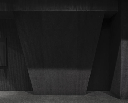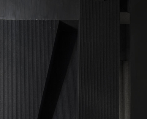 Tiyatronun iç mekanı siyah, beyaz ve gri tonlarından oluşan yalın bir paletle kurgulanmış. Bu yaklaşım, geleneksel Çin tiyatrosunun gösterişli kostümlerine ve performanslarına zemin oluştururken, izleyiciyi yüzeysel ihtişamın ötesine, Tang Bohu’nun iç dünyasındaki dinginliğe yönlendiriyor. Dış mekanda yeşil tonlar klasik mavi-yeşil peyzaj resimlerini çağrıştırırken, iç mekan monokrom bir manzara anlayışıyla ele alınıyor. Tasarımda Çin mürekkep resminde kullanılan “cun” tekniğinden ilham alınarak, akustik paneller ve sanatsal kaplamalarla dikey dokular oluşturulmuş. Zemin katın eğimli duvarlarını izleyen asma kat, mekana dağların içine doğru ilerliyormuş hissi veren bütüncül bir deneyim kazandırıyor.
