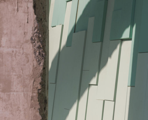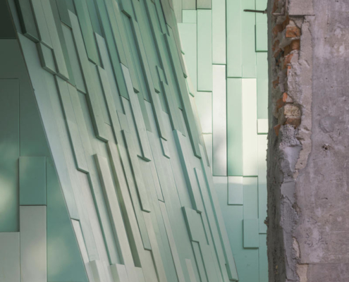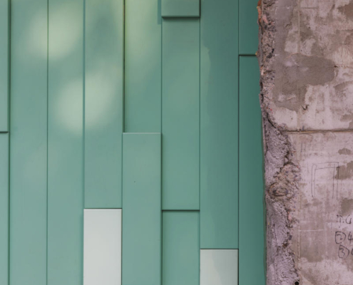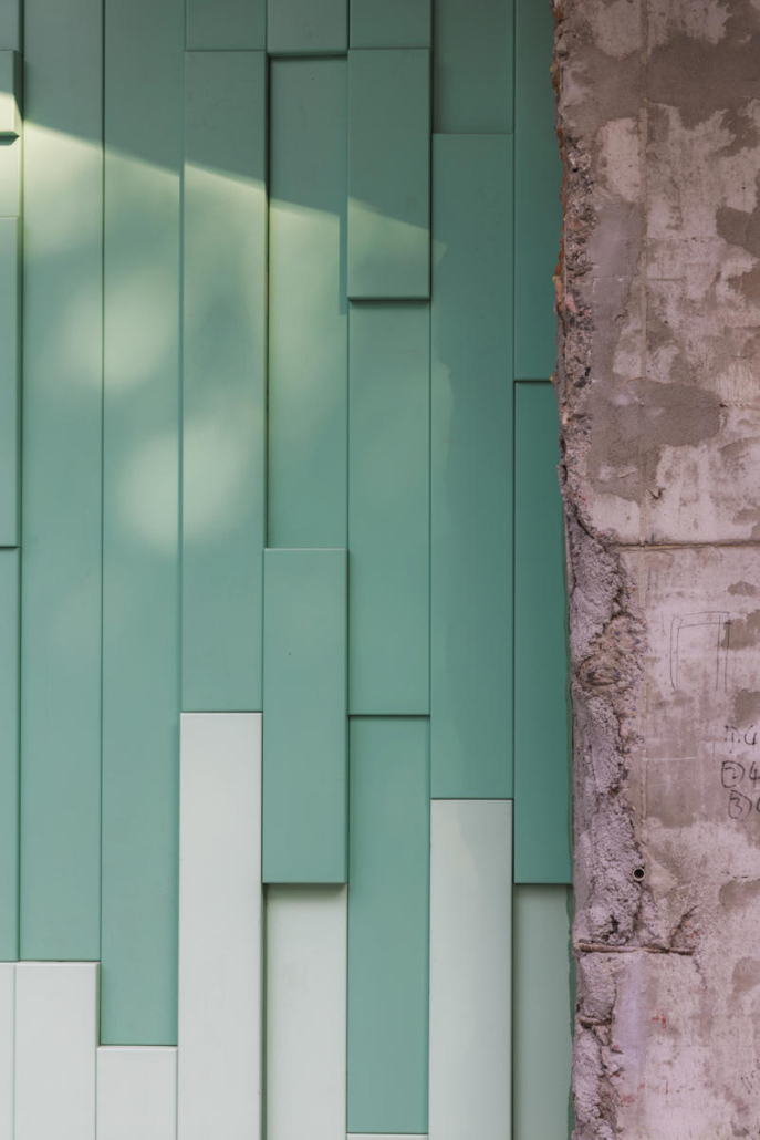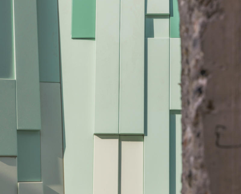 Cephede kullanılan dört farklı metal panel türü, renk ve kalınlık açısından çeşitlilik sunarken, V biçimli panellerle köşe birleşimleri çözümlenmiş. Çatıdaki trapez metal mesh, cephedeki dağ formunun ritmini yapı sınırlarının ötesine taşıyor.